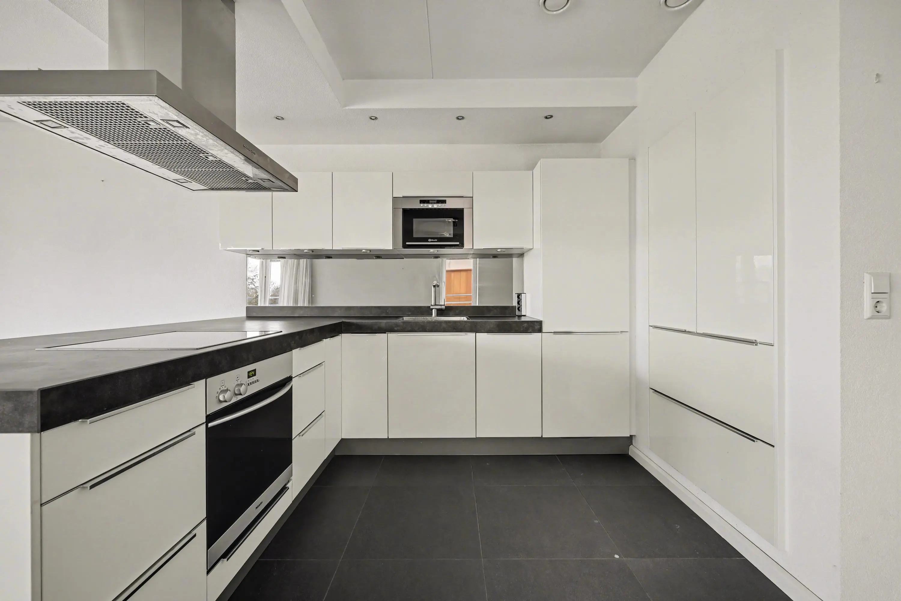 De nette open keuken keuken is uitgevoerd met inbouwapparatuur als kookplaat, oven, magnetron, afzuigkap en koel- vriescombinatie.
