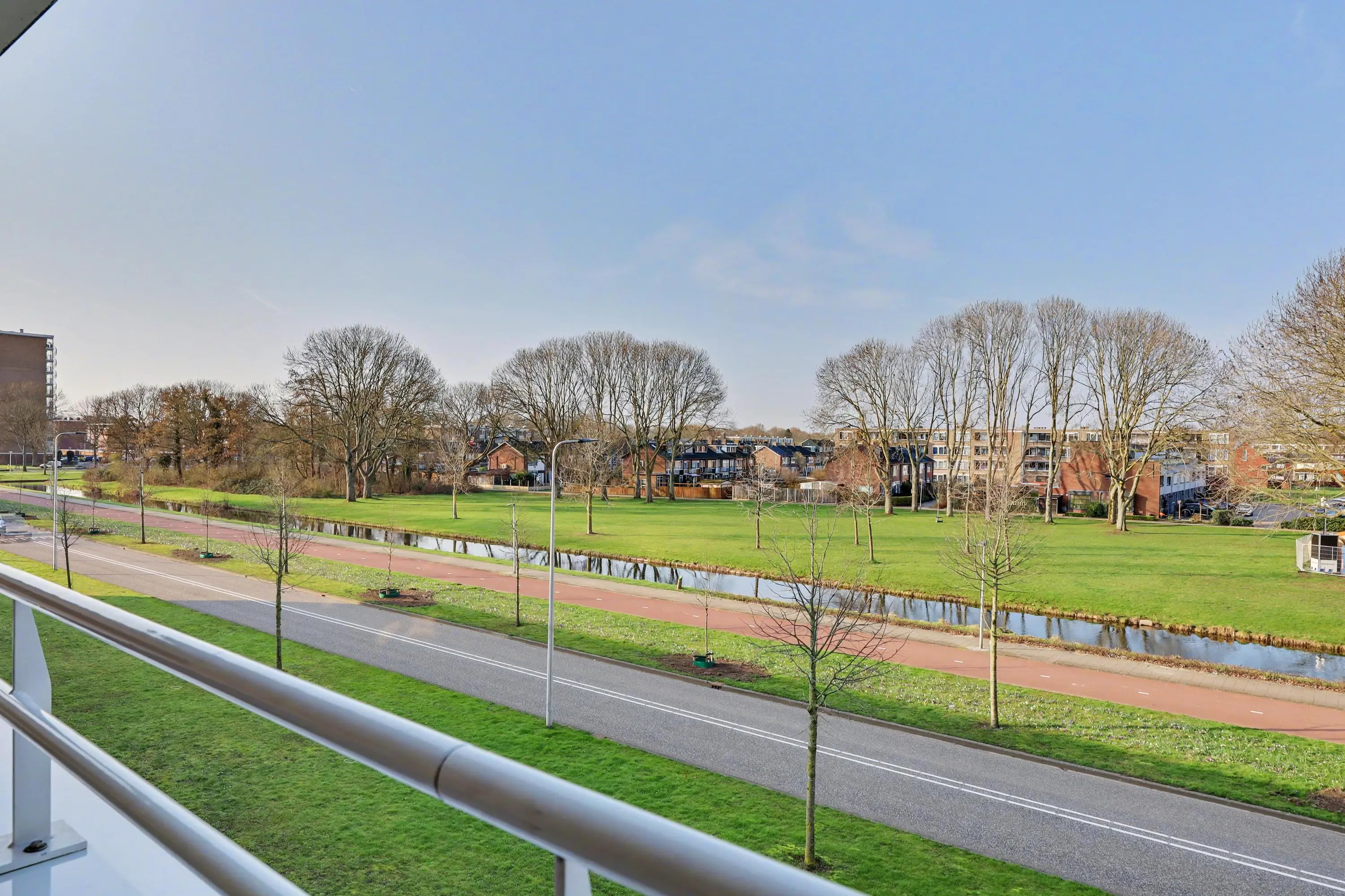 Het balkon is gelegen op het Westen (middagzon) en geeft uitzicht over onder andere het Hartelpark waar Schotse Hooglanders grazen, de ijsvogel vliegt en waar zelf een bever zijn thuis heeft gevonden!