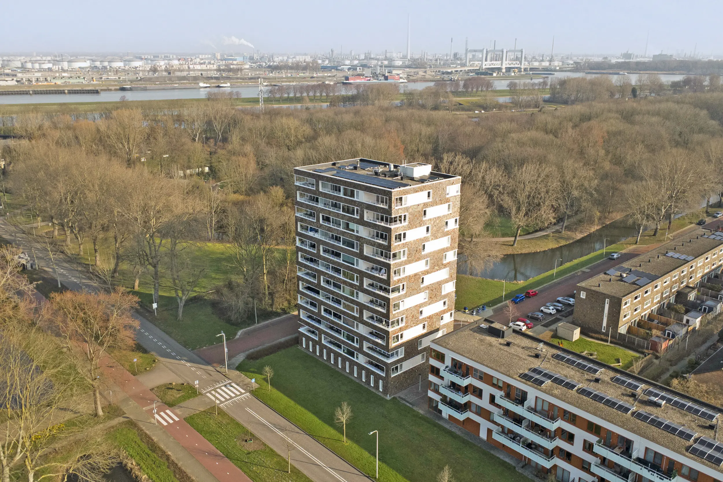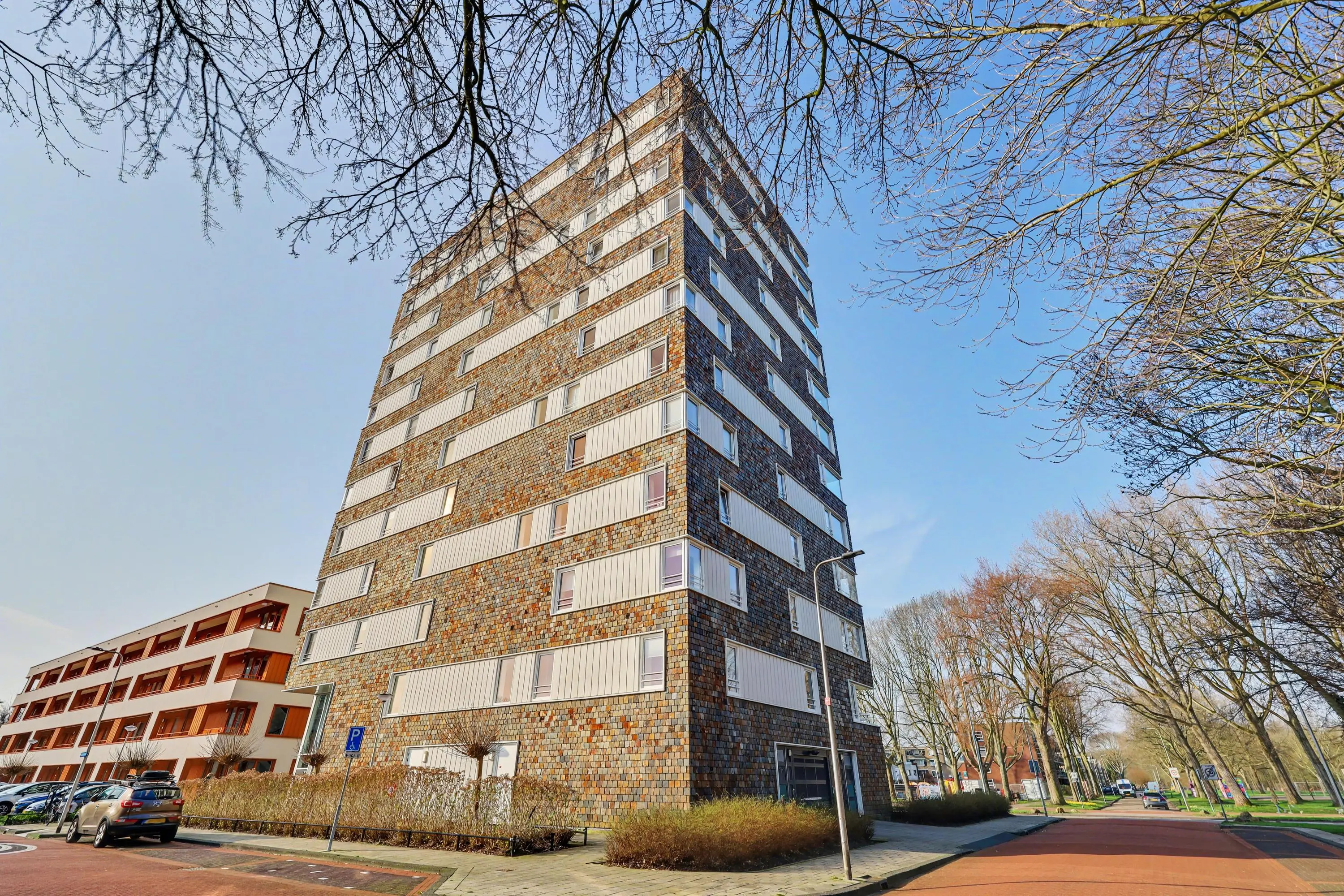 Aan de rand van het Hartelpark ligt dit schitterende appartementencomplex met leistenen gevelbekleding.