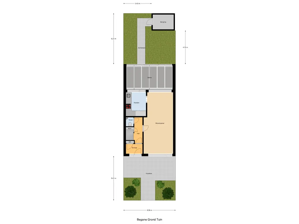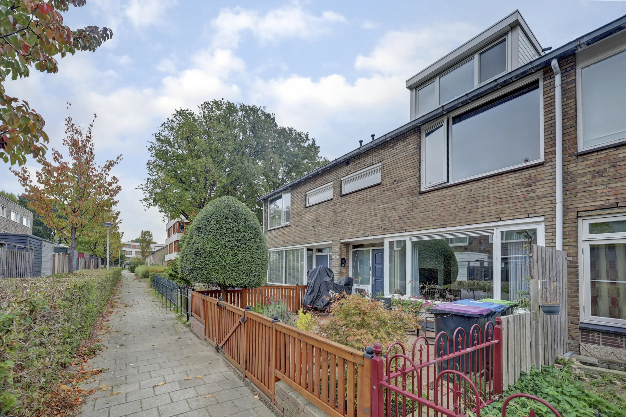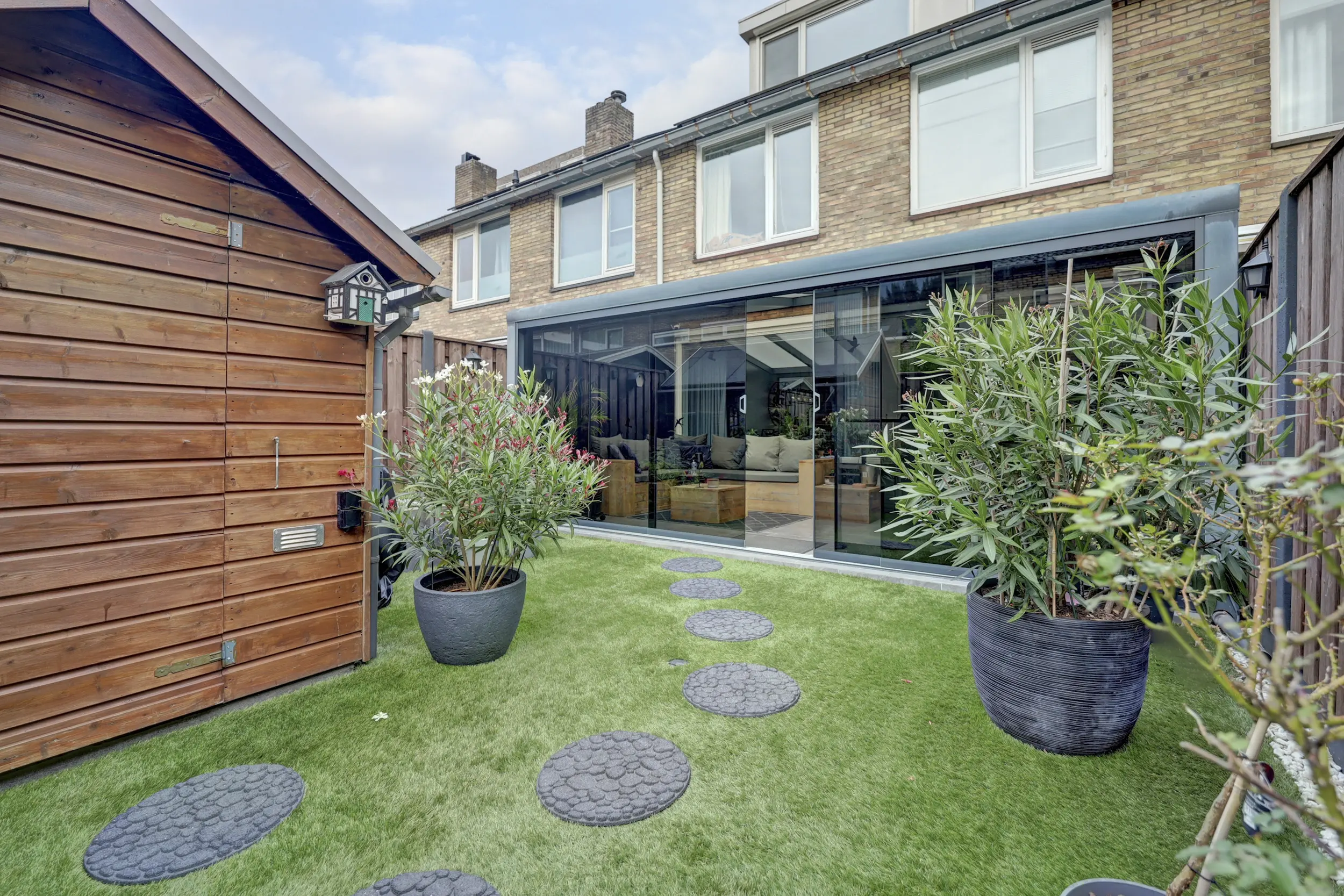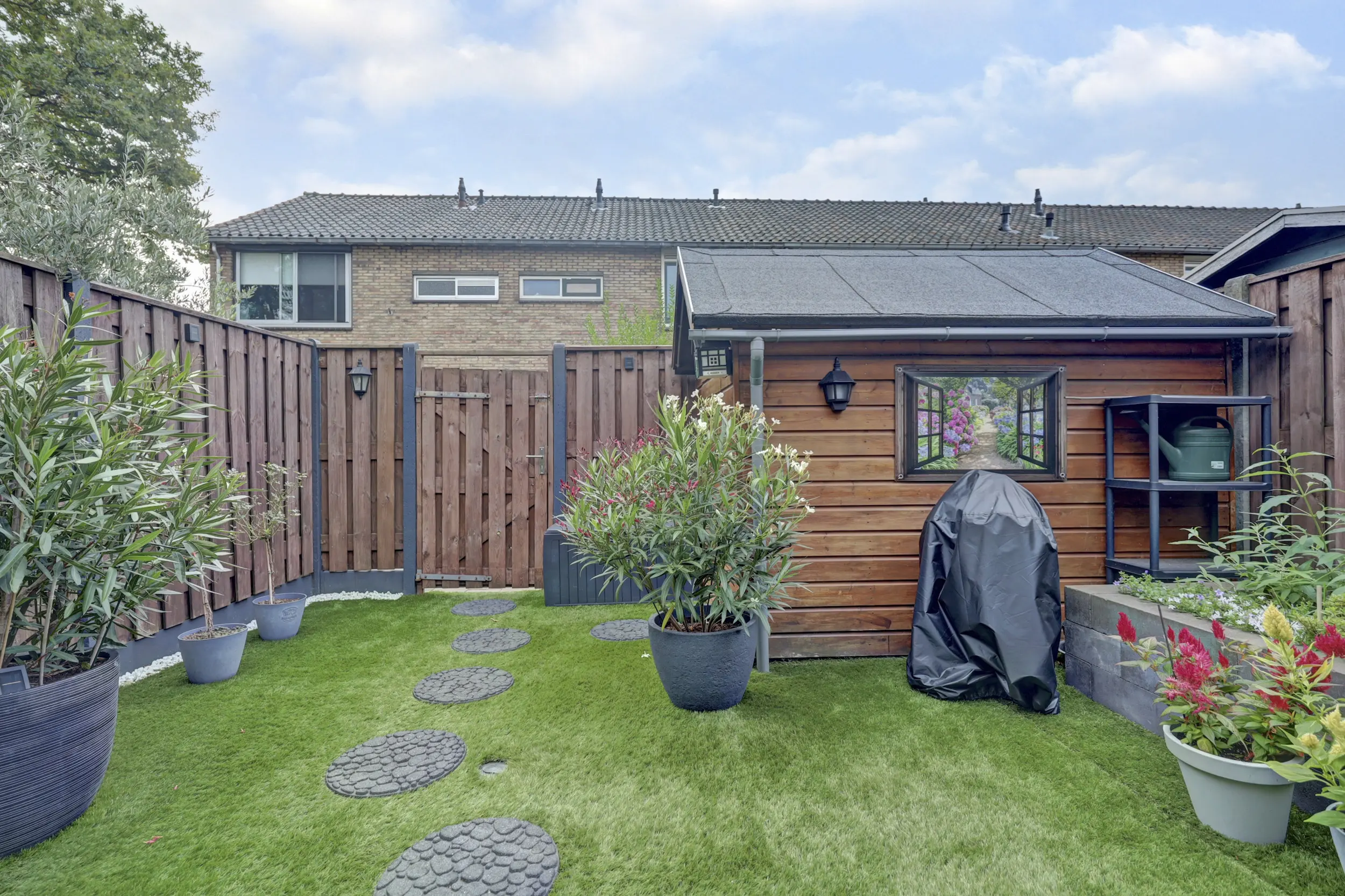 De achtertuin lig op het Zonnige zuiden en is voorzien van een houten berging, een 2e berging bevindt zich aan het zijpad naast de rij woningen.