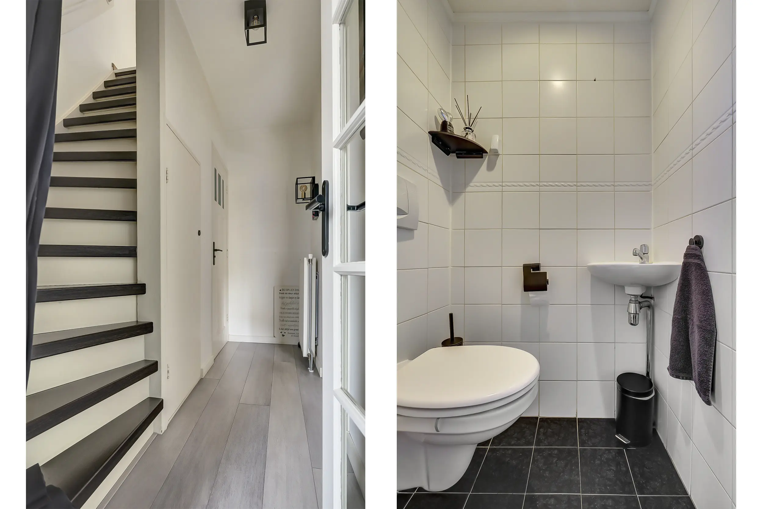 Hal met vernieuwde meterkast, trapkast en toilet.