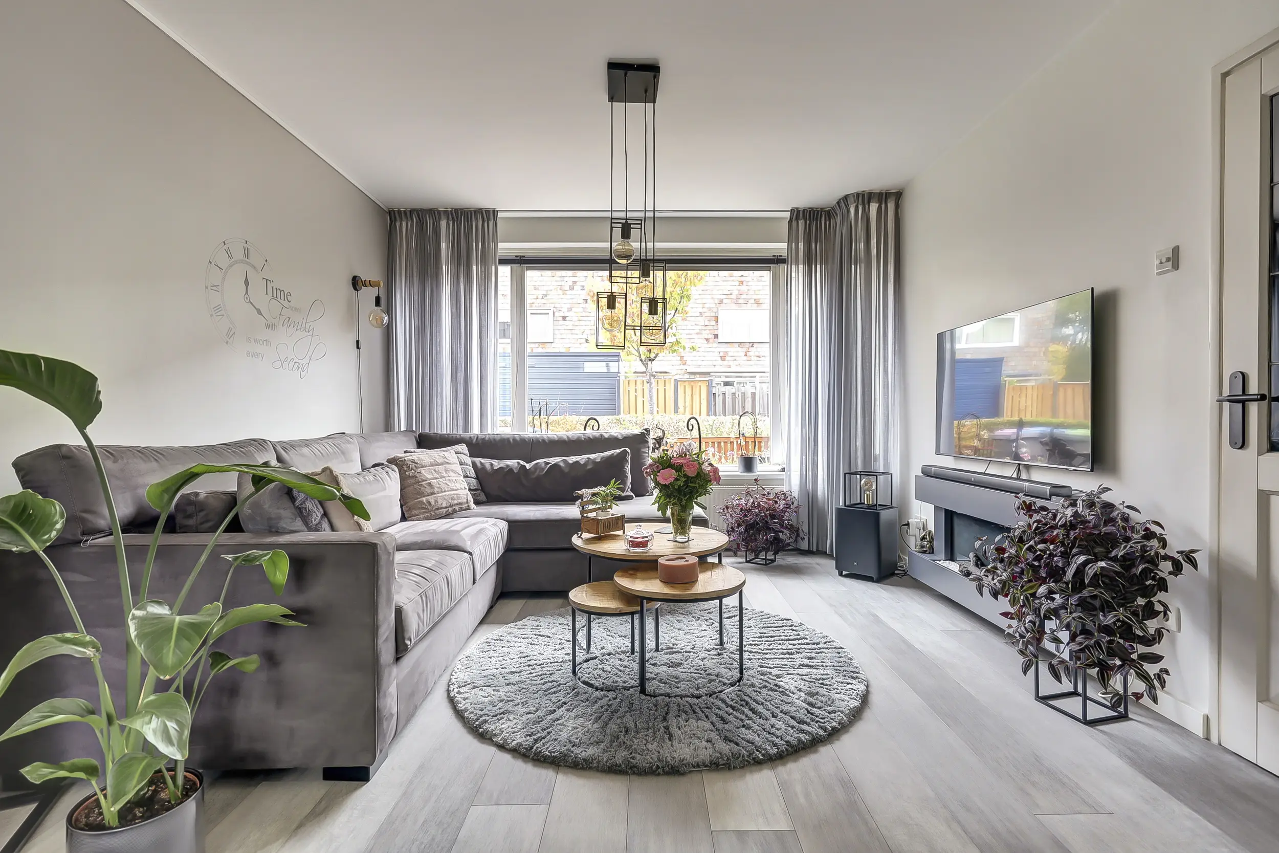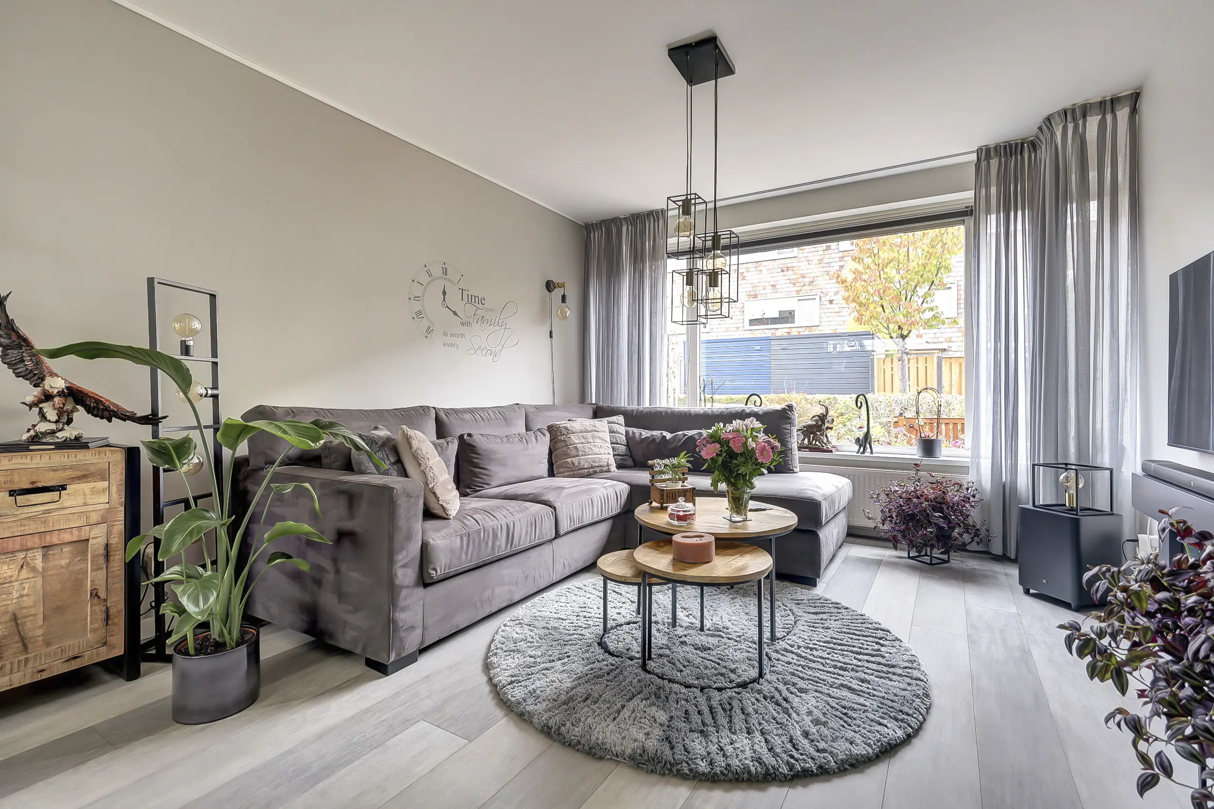 De woonkamer heeft grote raampartijen die voor veel daglicht zorgen.