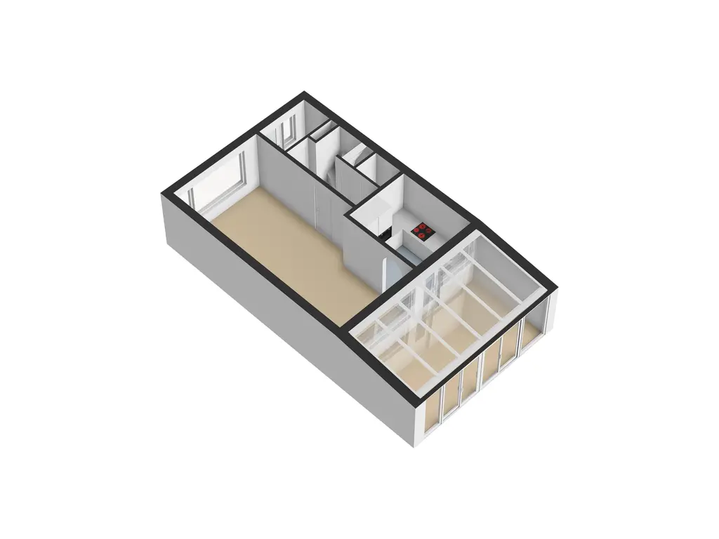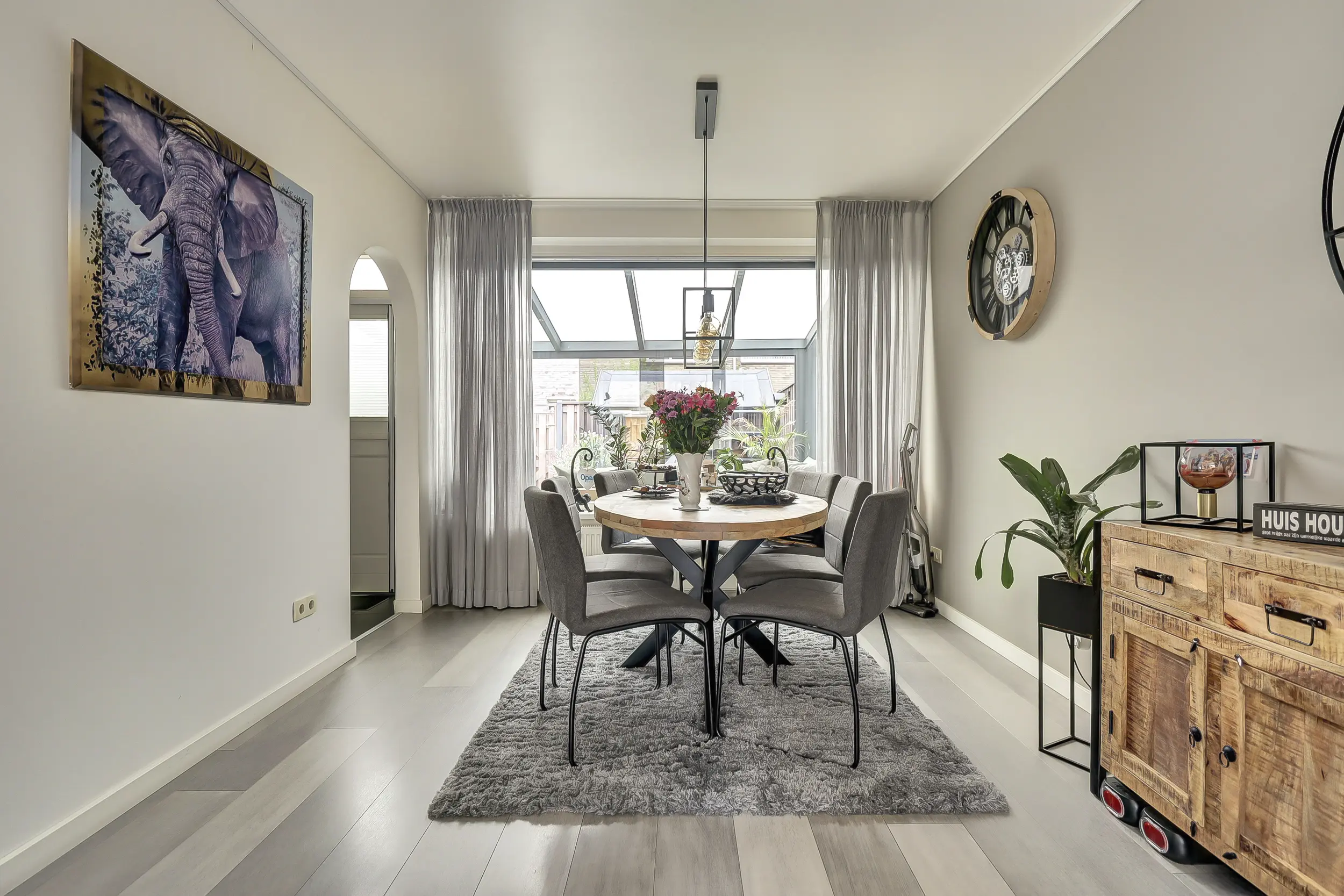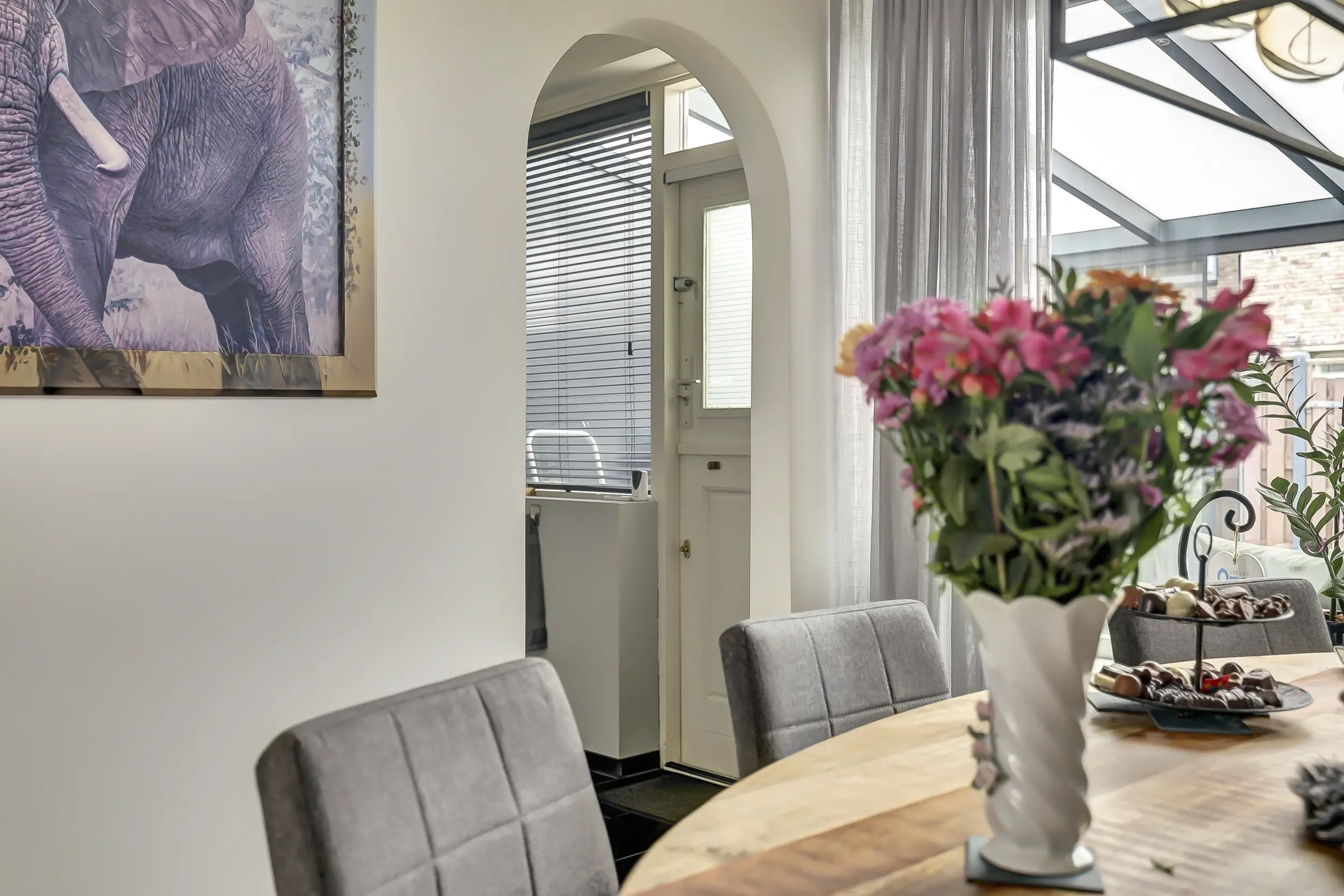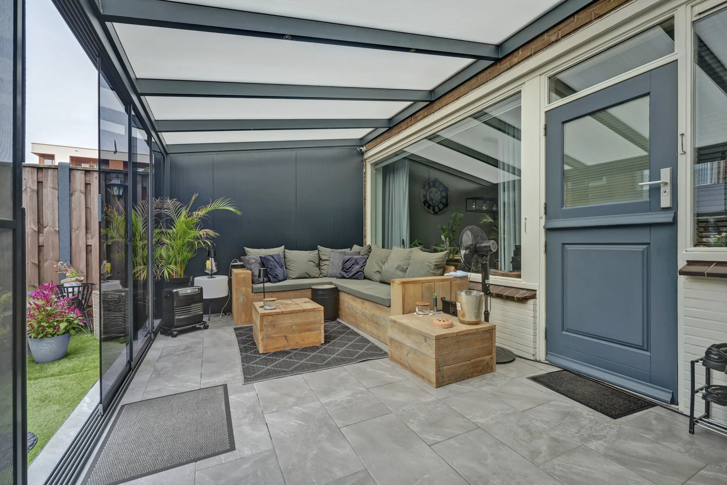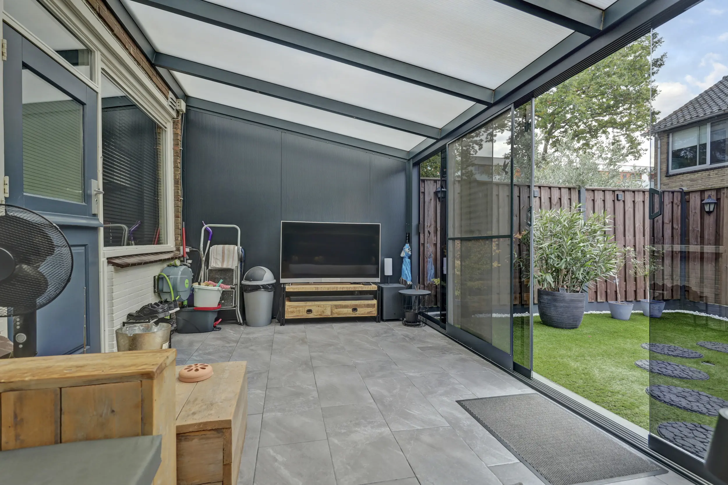 Aan de achterzijde is een luxe aluminium serre met glazen schguifdeuren geplaatst, deze combinatie van binnen- en buitenruimte is een verdere vergroting van het al aanwezige wooncomfort!
