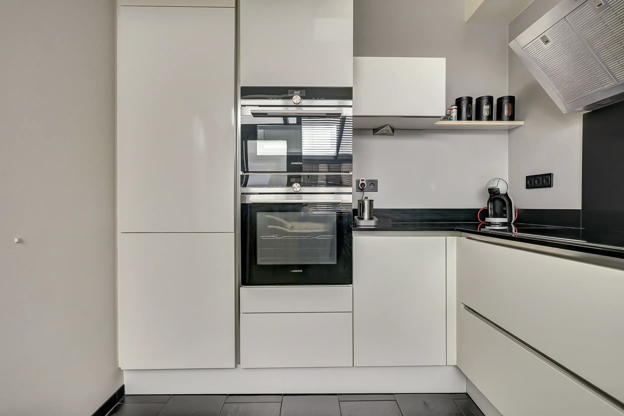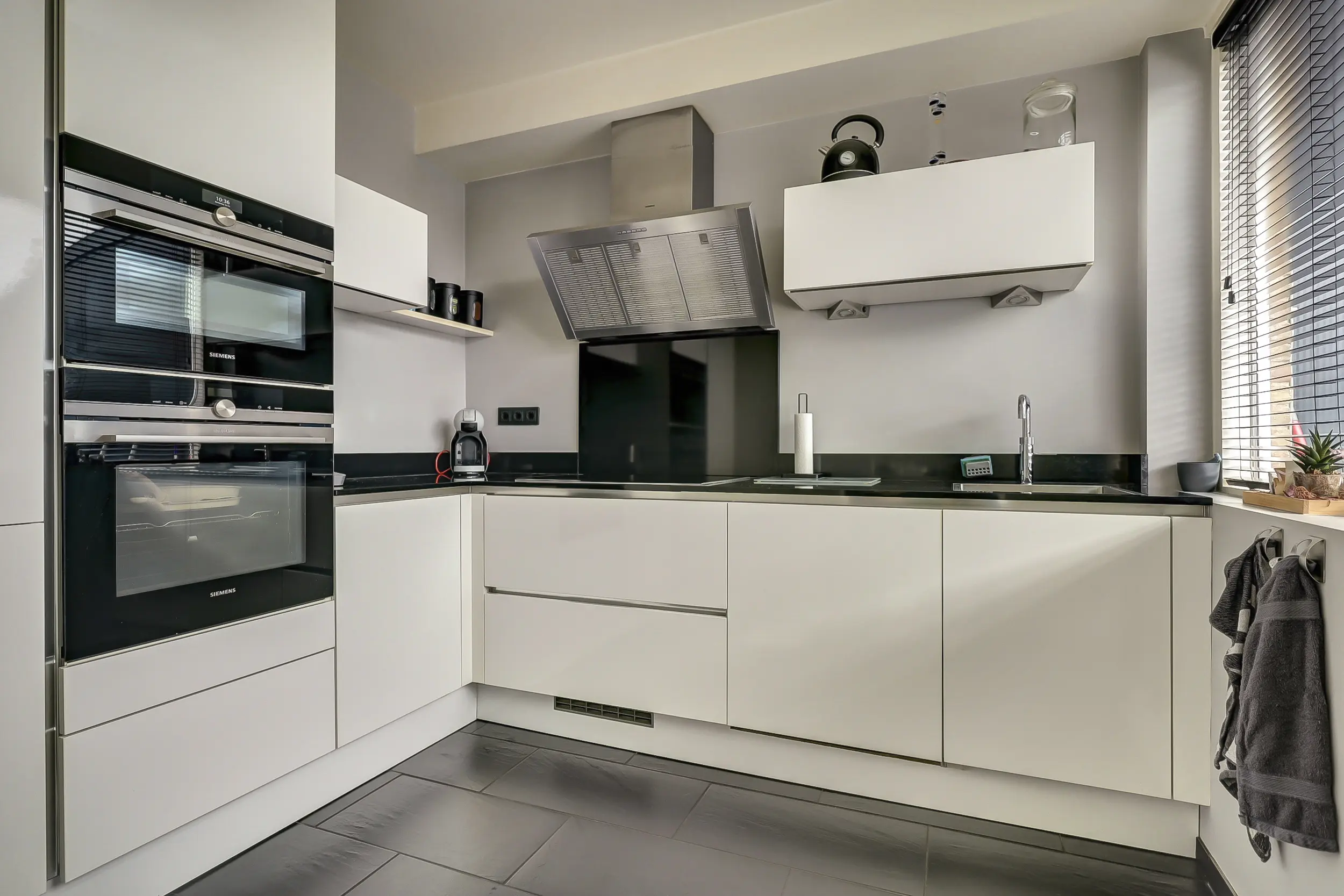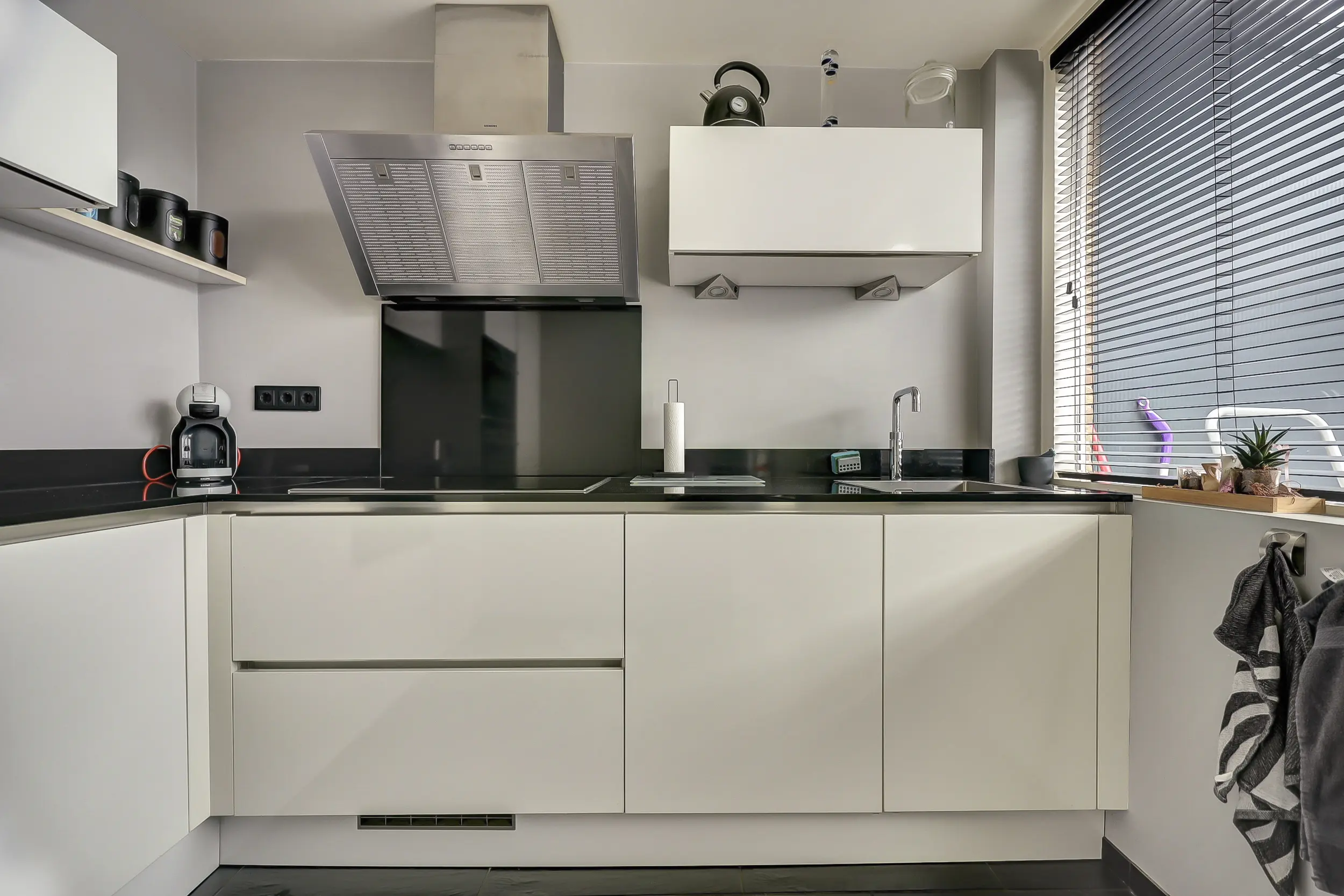 De half open keuken is modern en compleet uitgevoerd met apparatuur als Quooker, vaatwasser, koelkast, vriezer iductie kookplaat afzuigkap oven en combi-magnetron.
