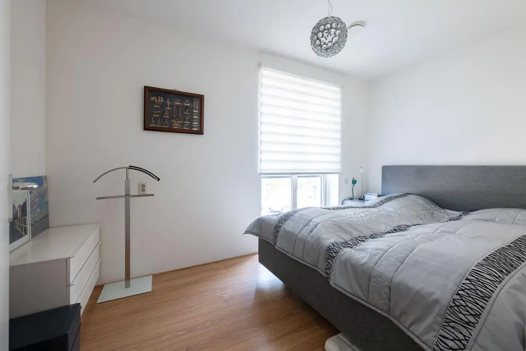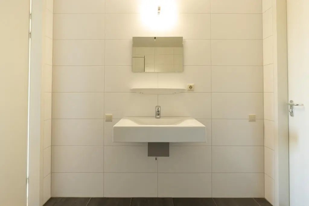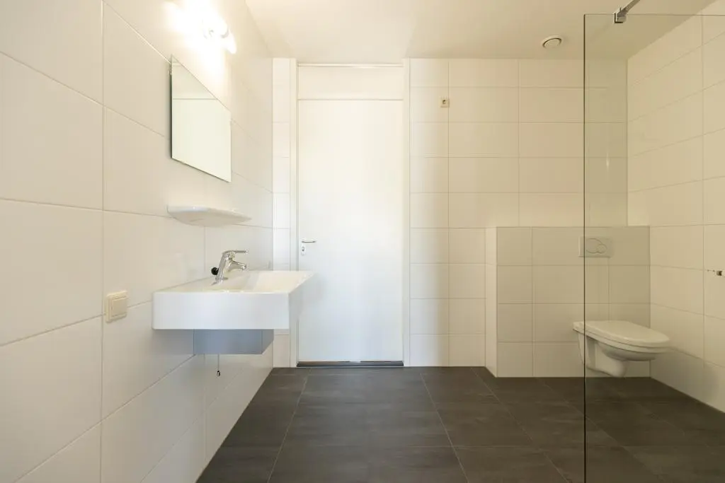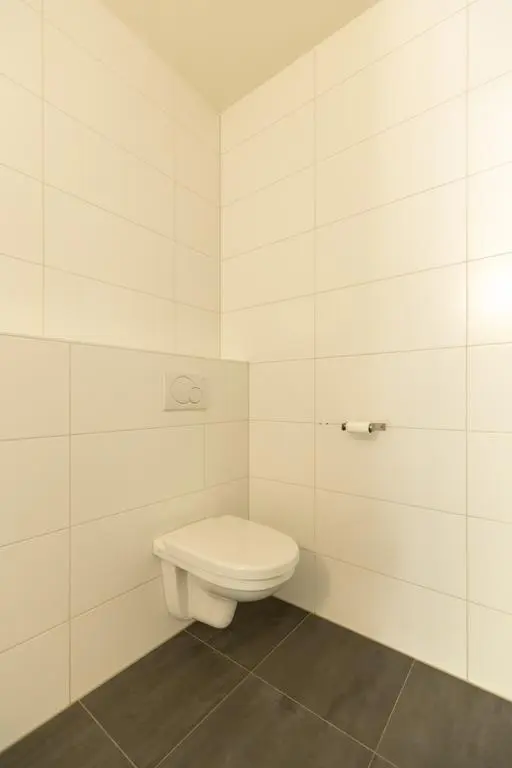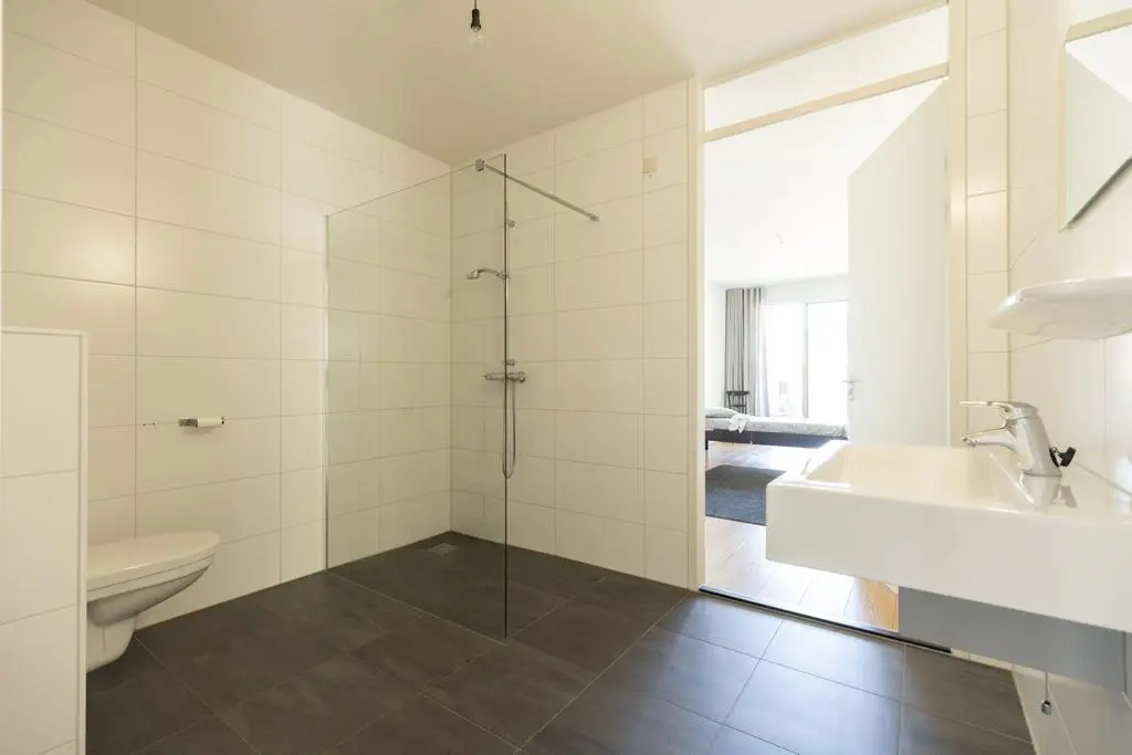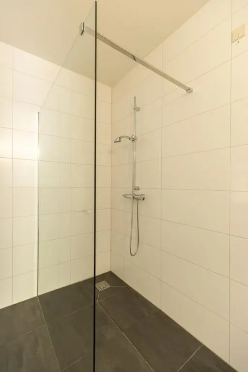 Vanuit deze 2e slaapkamer én hal toegang tot geheel betegelde badkamer met douche met scherm, vrij hangend toilet en wastafel.