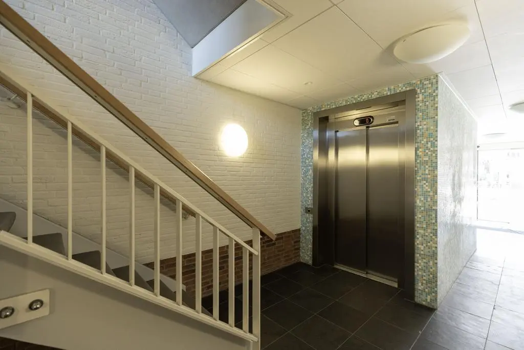 Afgesloten centrale hal met brievenbussen, lift en ruime trap, gezamenlijke fietsen