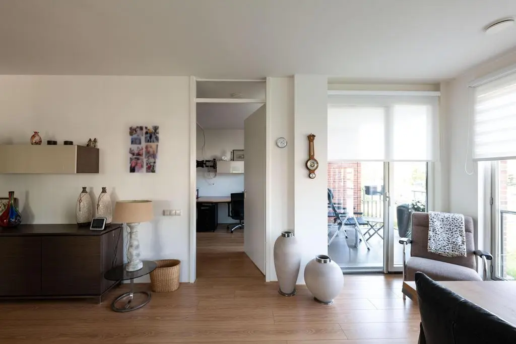 Lichte en sfeervolle woonkamer met rondom glaspartijen met toegang tot balkon en 2e slaapkamer.