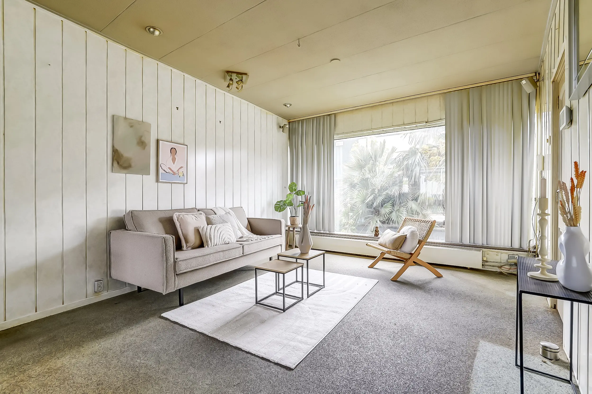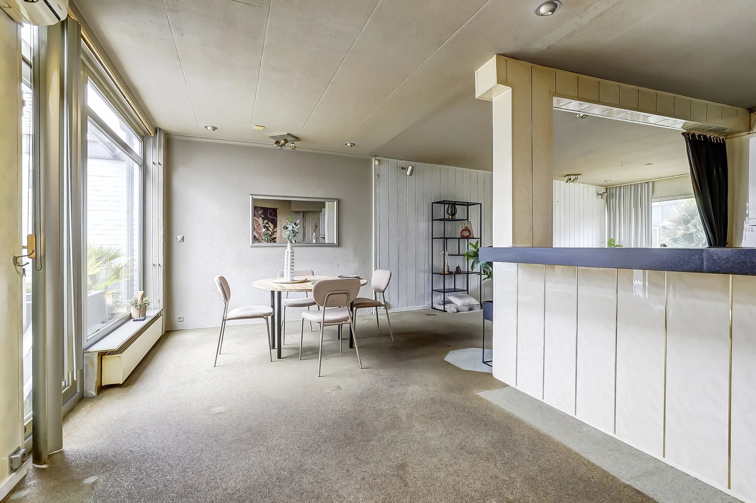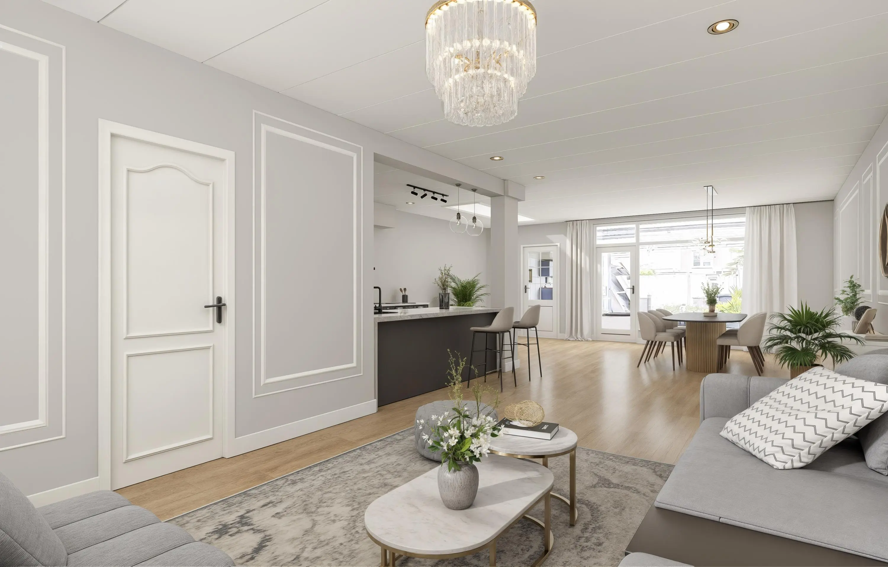 Lichte tuingerichte woonkamer met uitbouw.