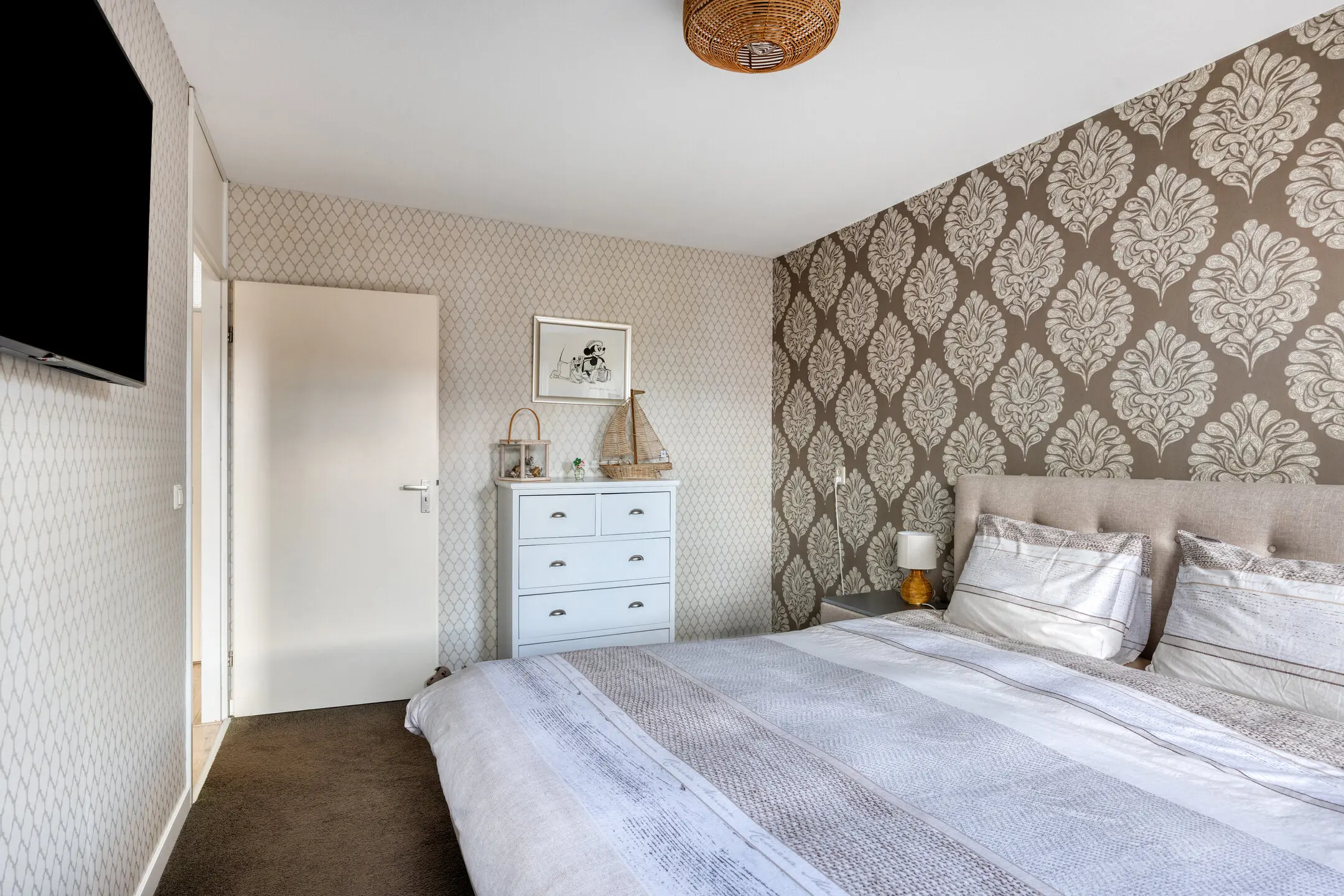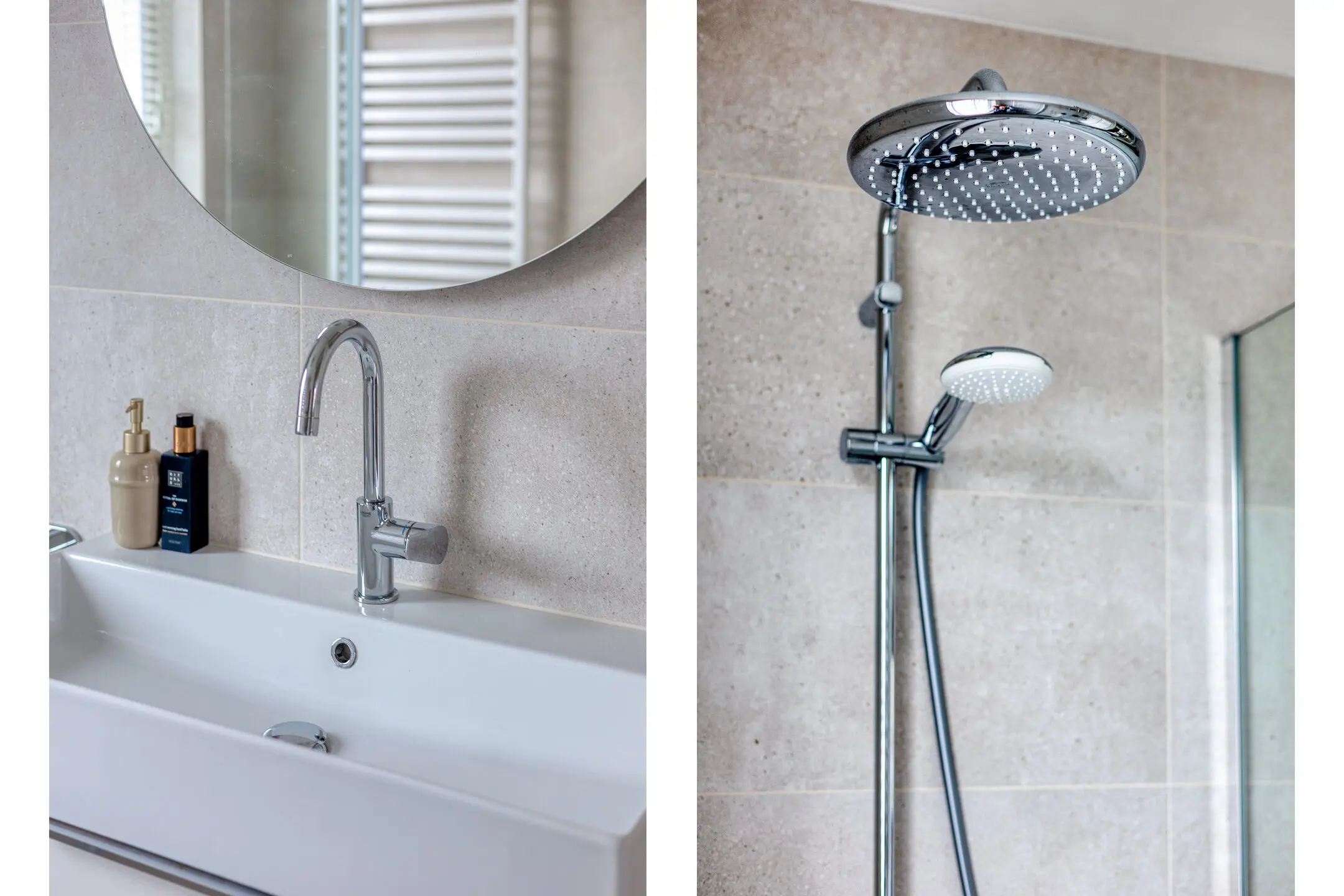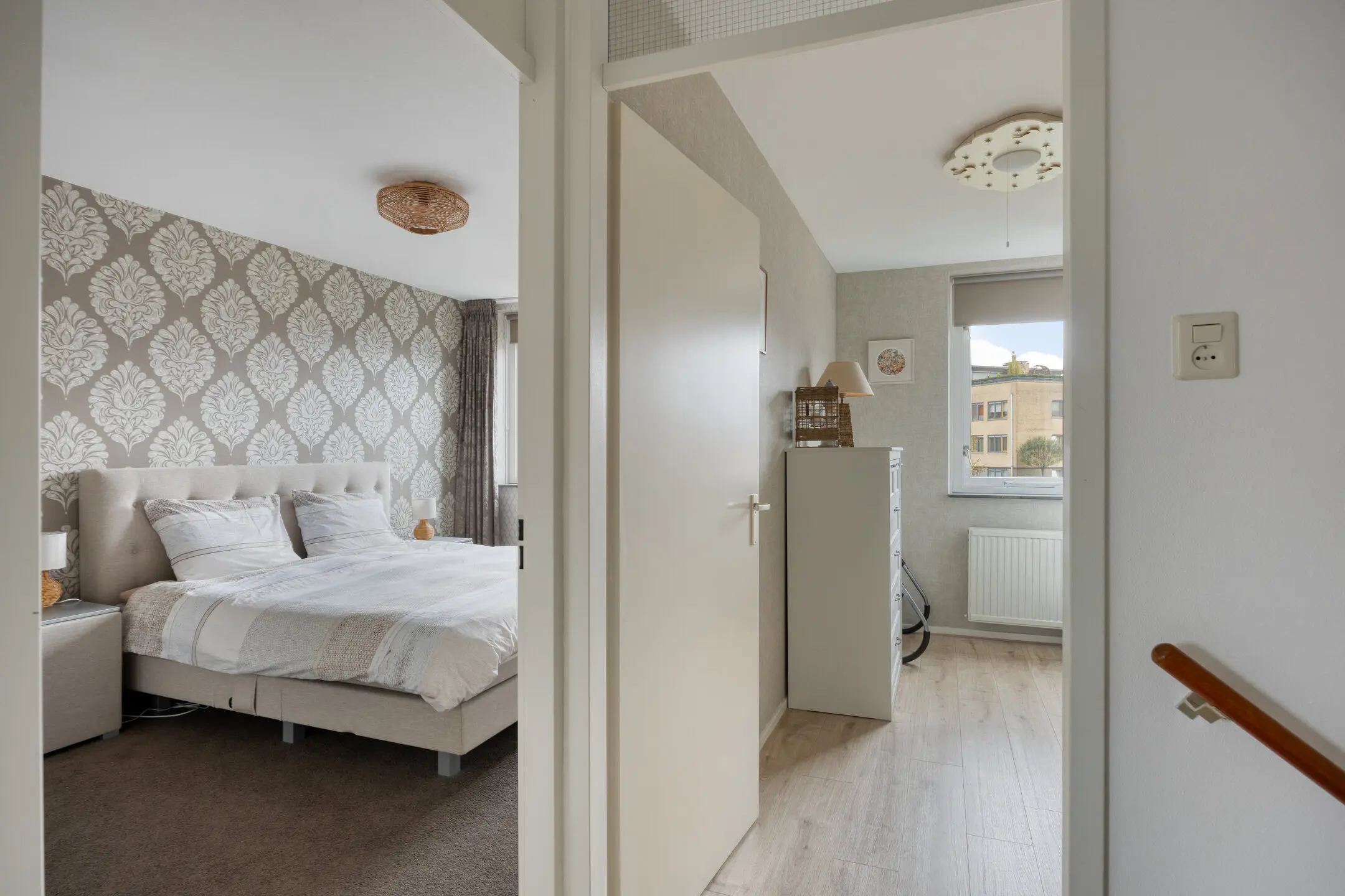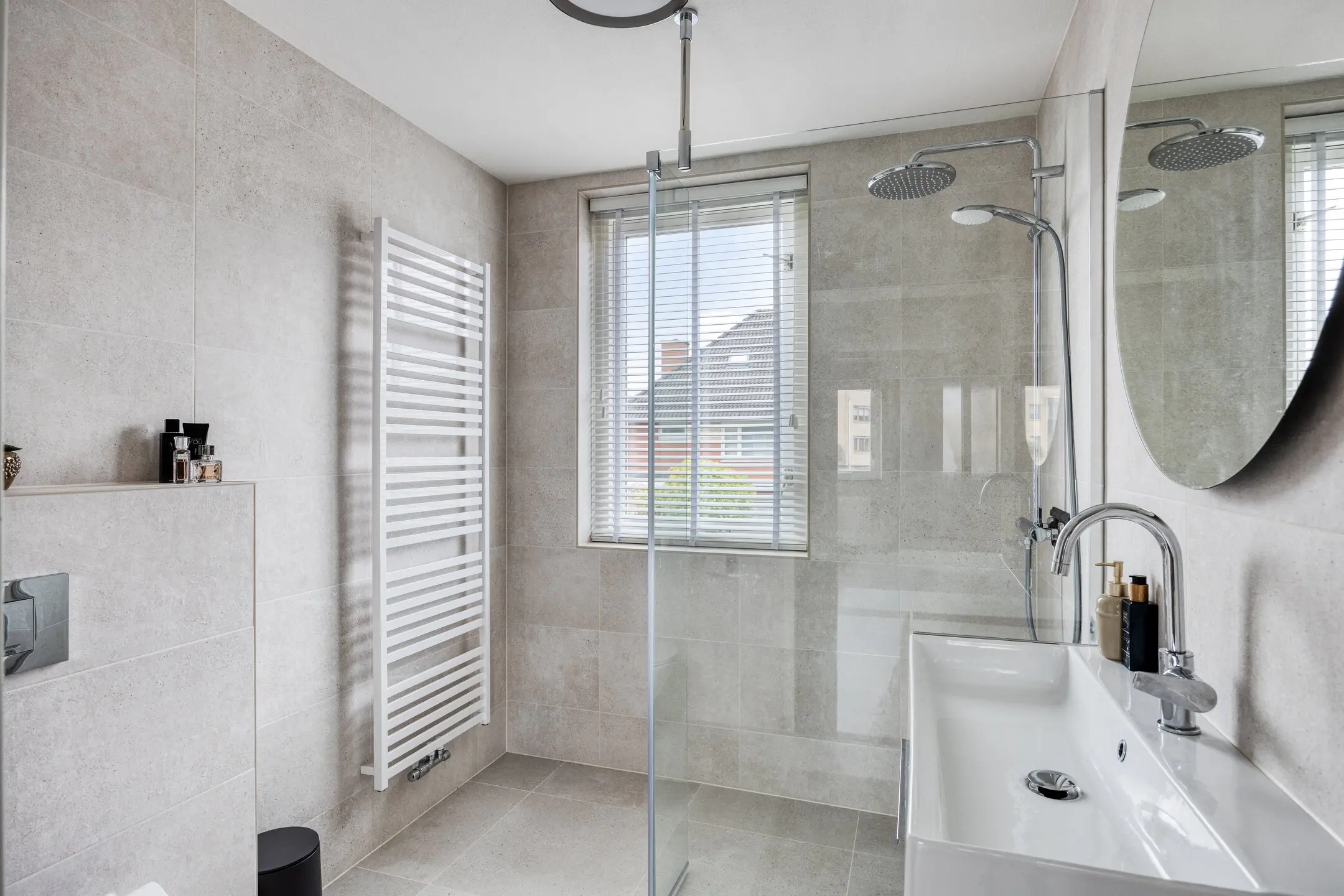Overloop met toegang tot de vertrekken. Twee slaapkamers van een fijn formaat aan de achterzijde van het huis. Slaapkamer drie ligt aan de voorzijde van de woning. De badkamer is de eyecatcher van deze verdieping; deze is in maart 2025 vernieuwd en uitgevoerd in een neutrale lichte kleurstelling. Hier zijn een inloopdouche, wandcloset, design radiator, wastafelmeubel en ronde spiegel aanwezig. Onder de vloertegels ligt elektrische vloerverwarming. Prettig is het raam dat open kan zodat er naast de mechanische ventilatie ook op een natuurlijke manier geventileerd kan worden.