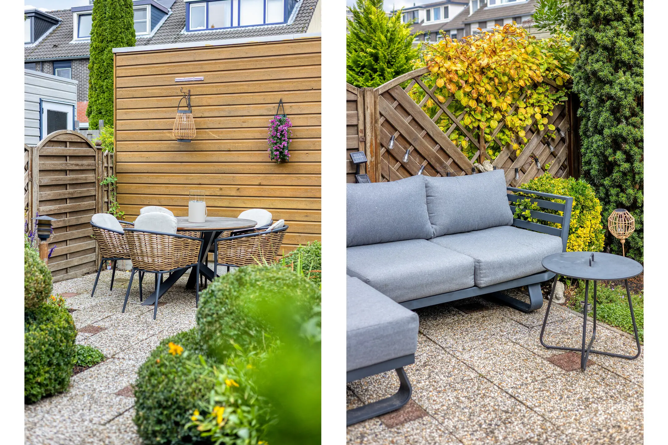 Op het noordwesten gelegen voortuin met buitenkraan en vaste beplanting. De verzorgde achtertuin heeft eveneens een buitenkraan en is bereikbaar vanuit de woonkamer en via de achterpoort. De achtertuin ligt op het zuidoosten en is eveneens aangelegd met vaste beplanting en er is een berging aanwezig met elektra. Het gestreepte zonnescherm (handmatige bediening) houdt de zon uit de woonkamer.