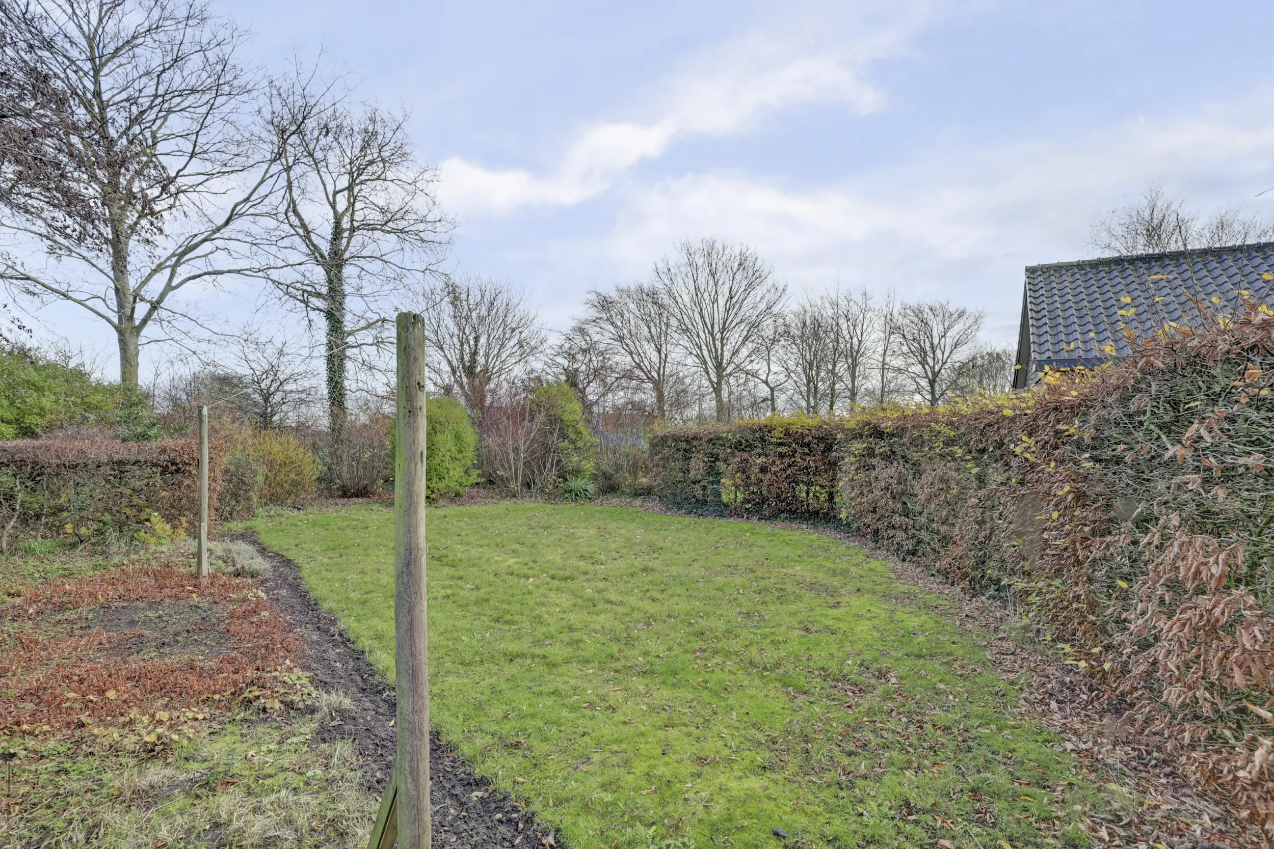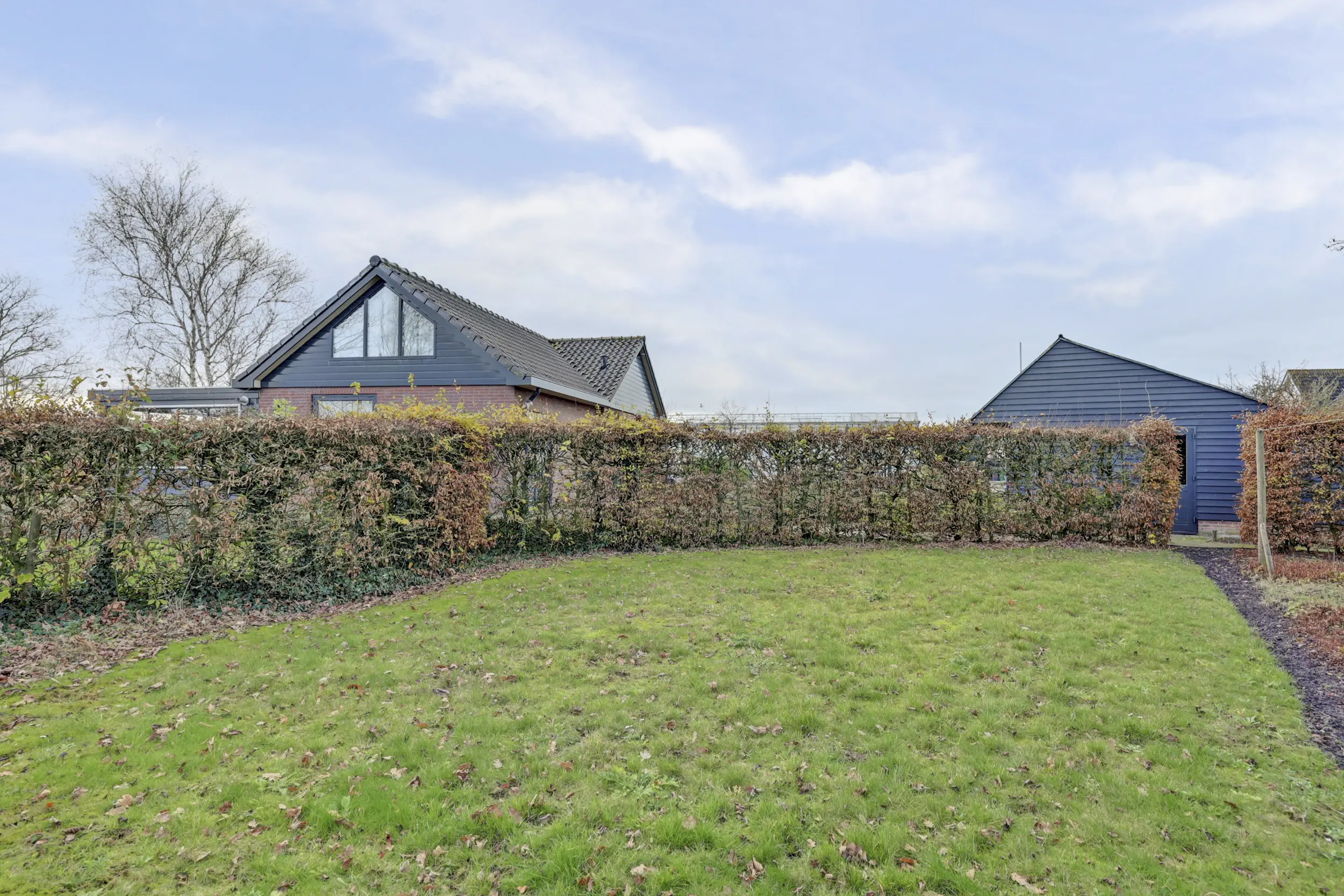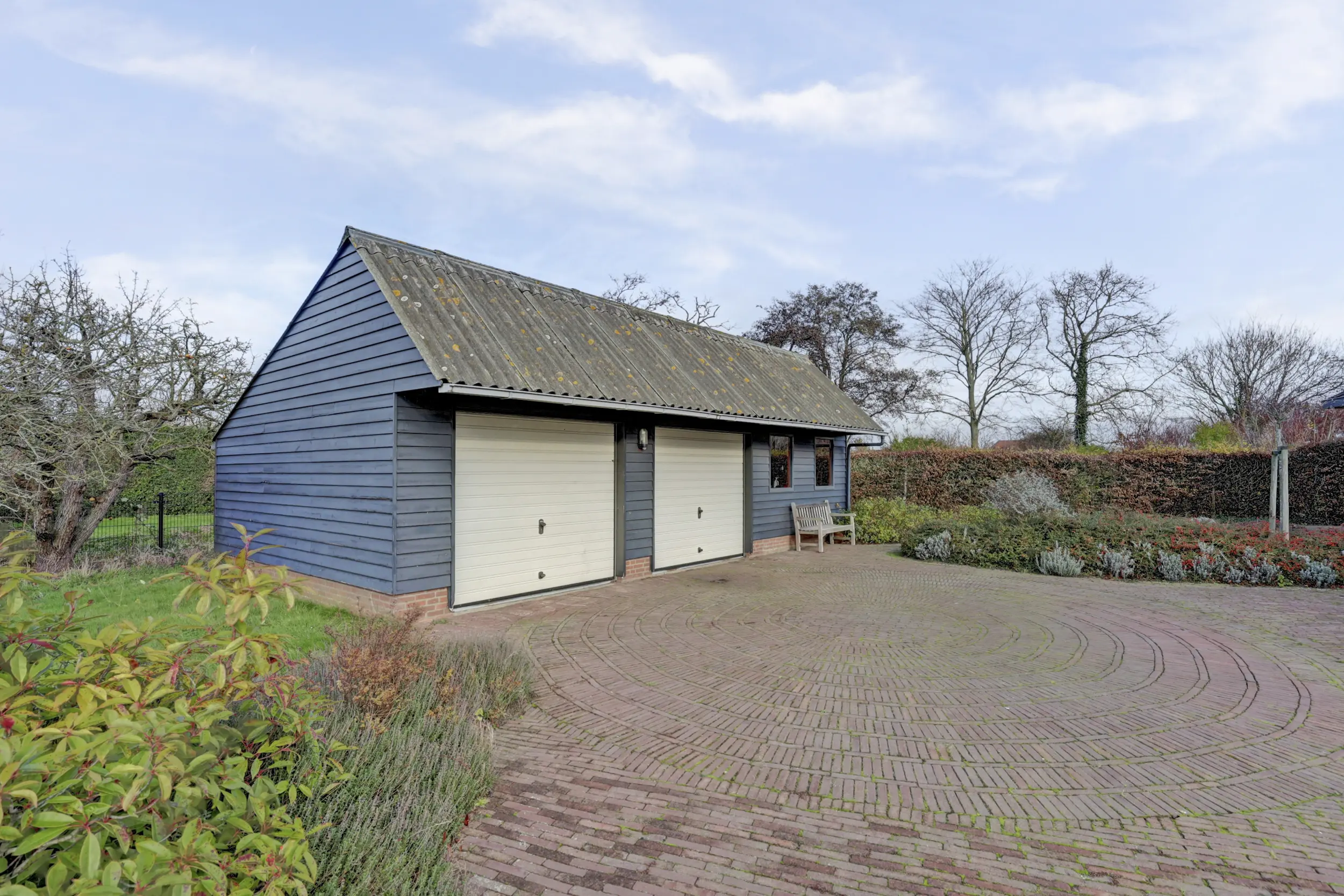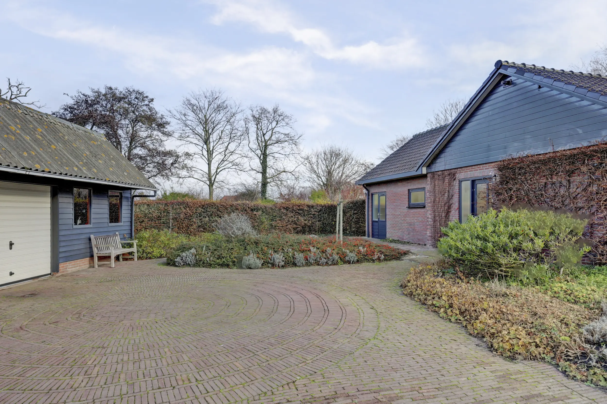 Een mooi aangelegde tuin met sierbestrating, sierhagen, gazon en borders. Door deze aanleg biedt de tuin veel privacy. Rondom het perceel is een hekwerk geplaatst met een elektrische poort. Op het perceel is een schuur met daarin een dubbele garage en voldoende ruimte voor een hobbyist en alle tuingereedschappen. Voor de garages is meer dan voldoende ruimte om auto’s te parkeren op eigen terrein. Aan de andere zijde van het huis is een houten tuinhuis.