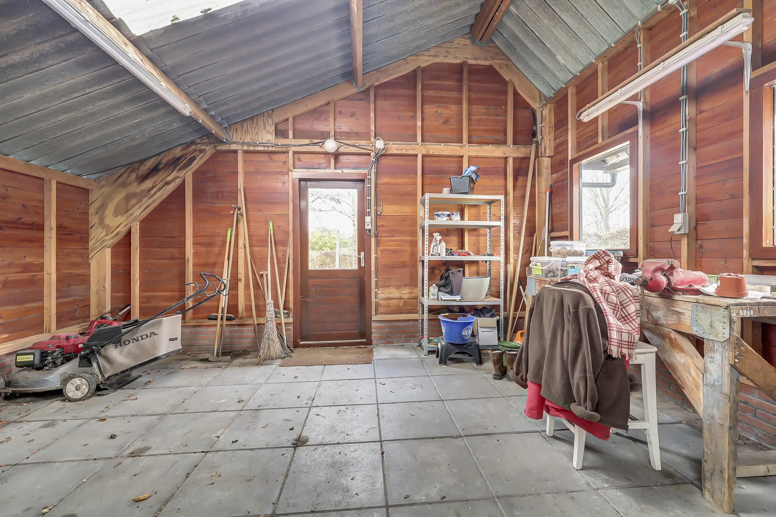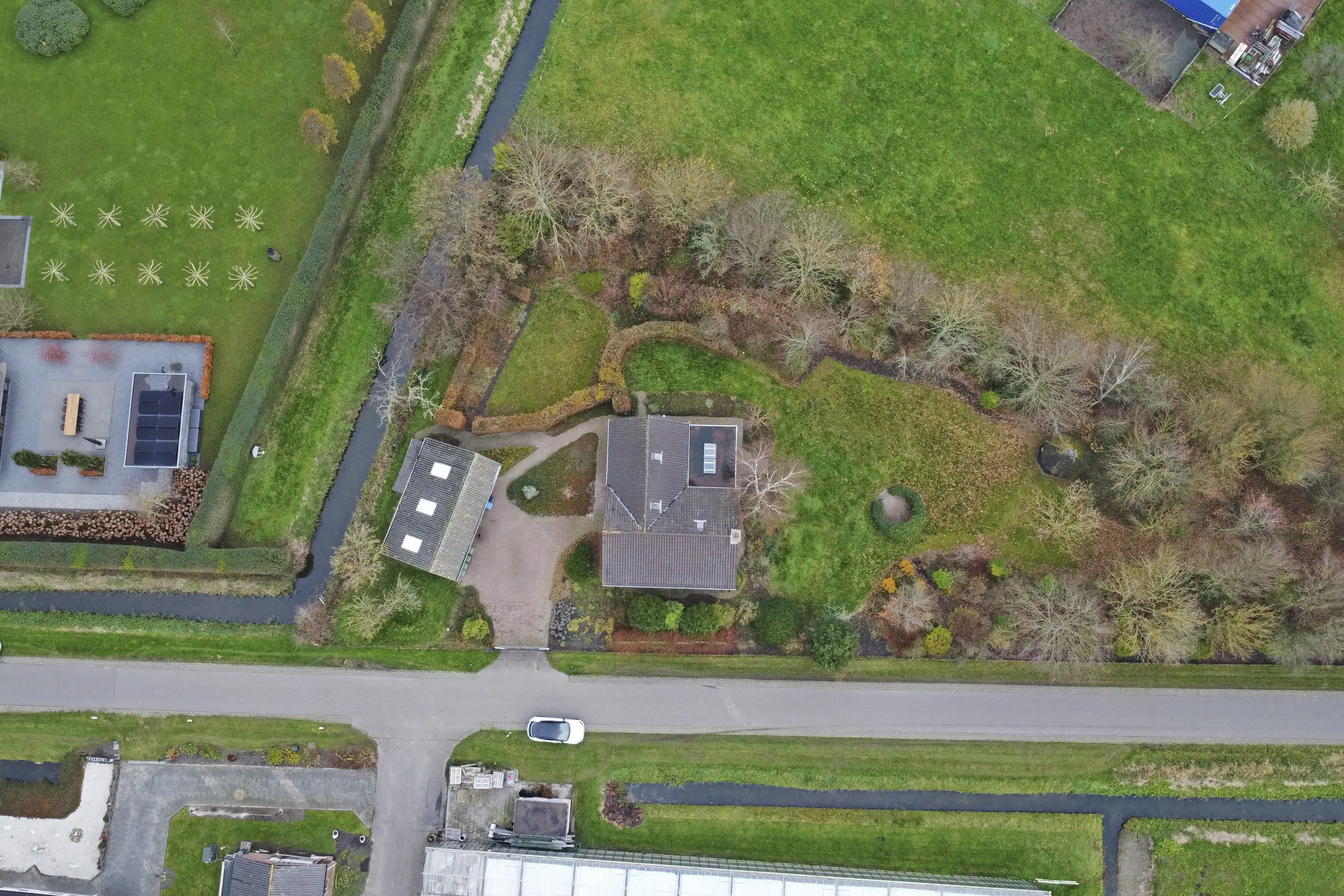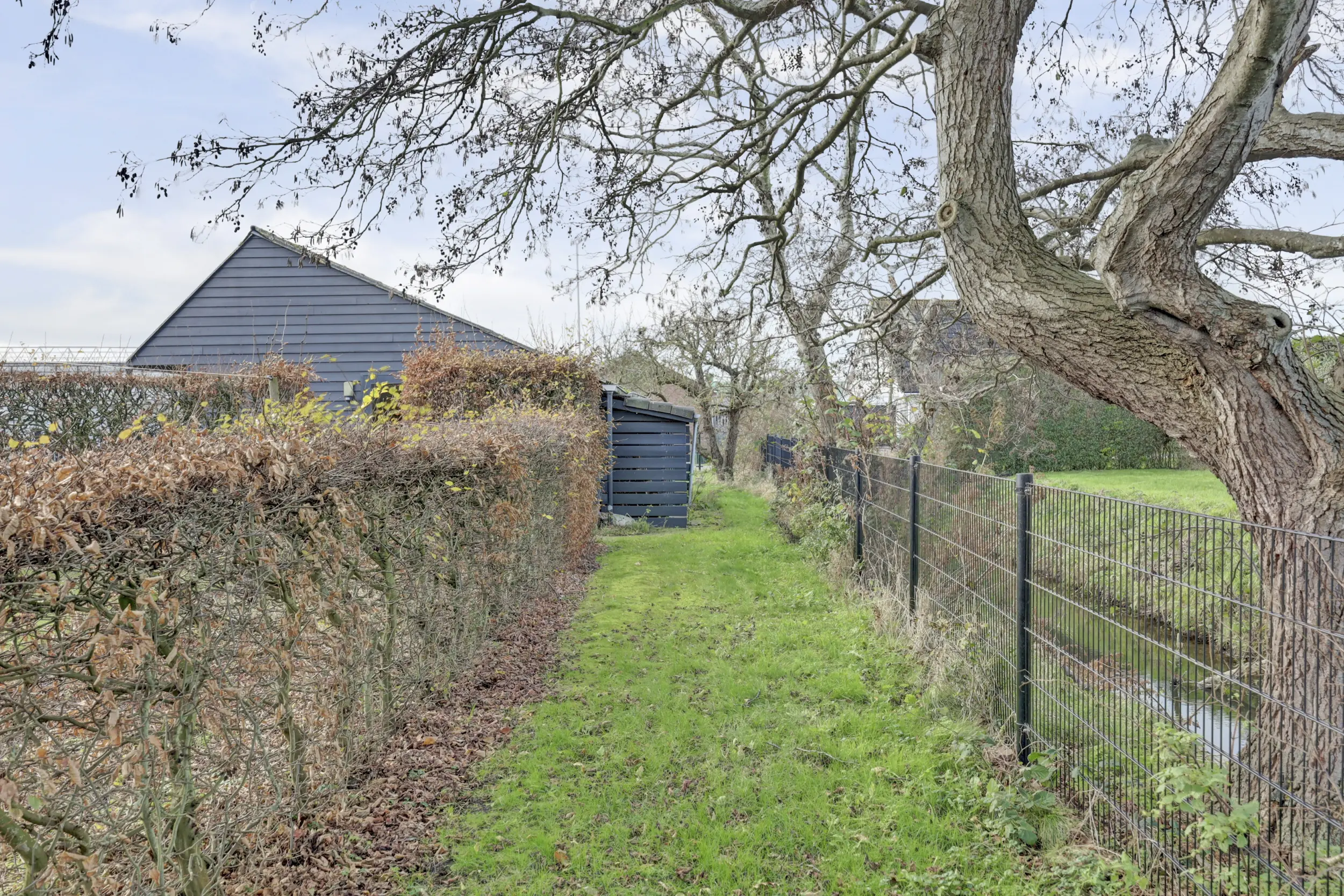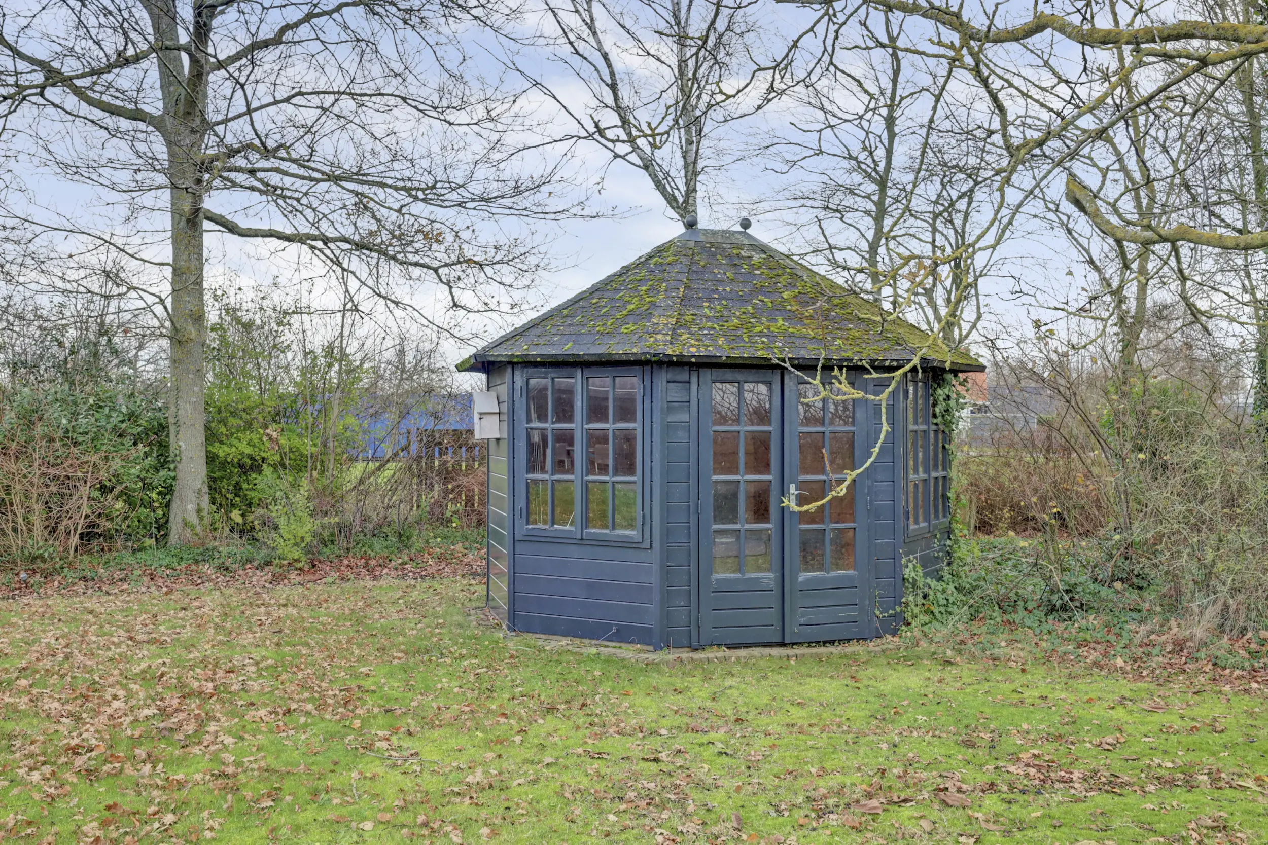 Een mooi aangelegde tuin met sierbestrating, sierhagen, gazon en borders. Door deze aanleg biedt de tuin veel privacy. Rondom het perceel is een hekwerk geplaatst met een elektrische poort. Op het perceel is een schuur met daarin een dubbele garage en voldoende ruimte voor een hobbyist en alle tuingereedschappen. Voor de garages is meer dan voldoende ruimte om auto’s te parkeren op eigen terrein. Aan de andere zijde van het huis is een houten tuinhuis.