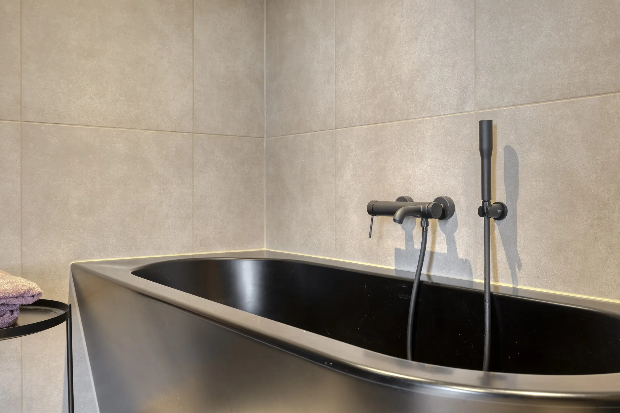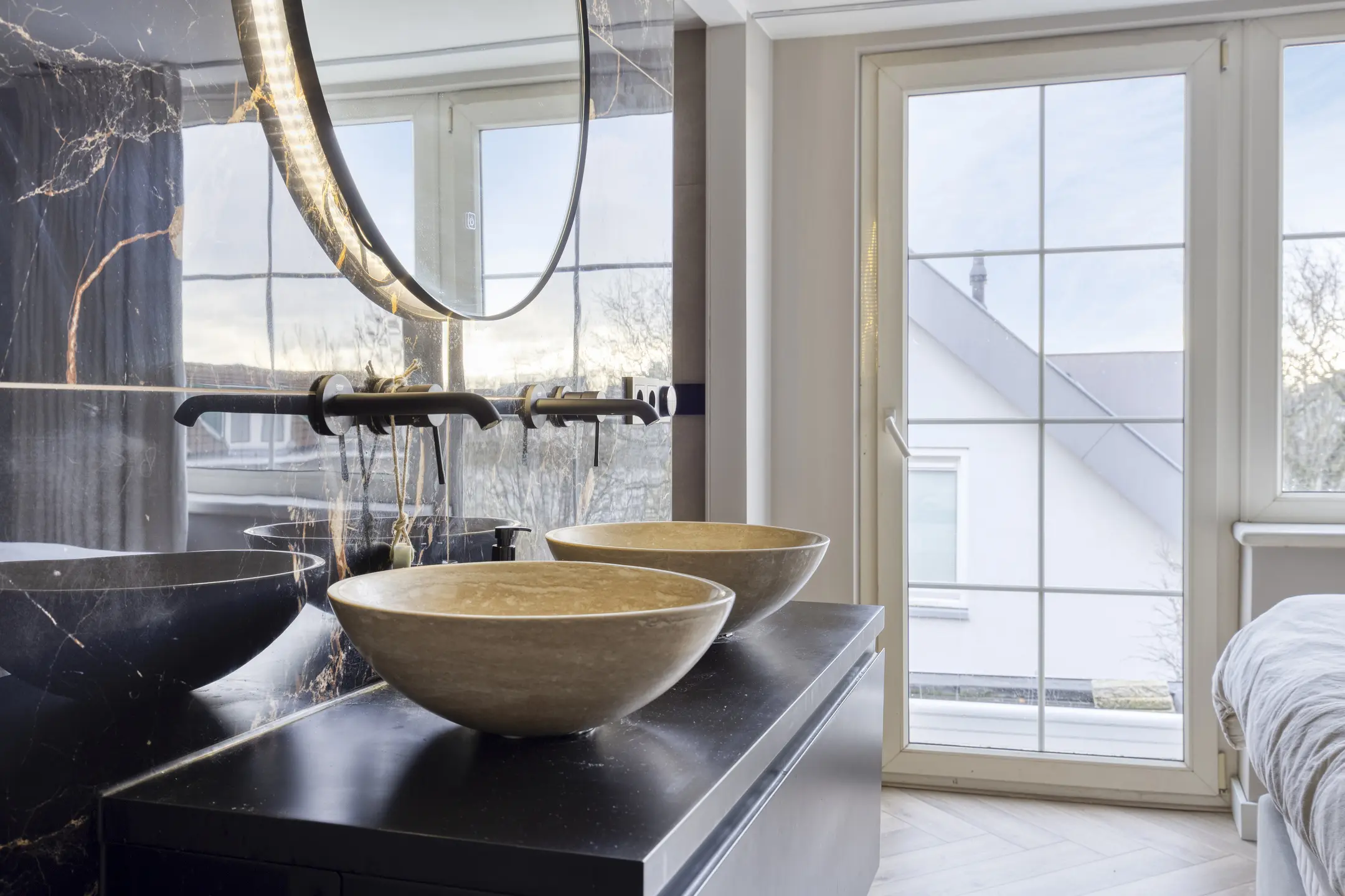 De ensuite badkamer is voorzien van een ligbad, inloopdouche met rookglazen douchewand, wandcloset, radiator en wastafelmeubel met dubbele waskommen.