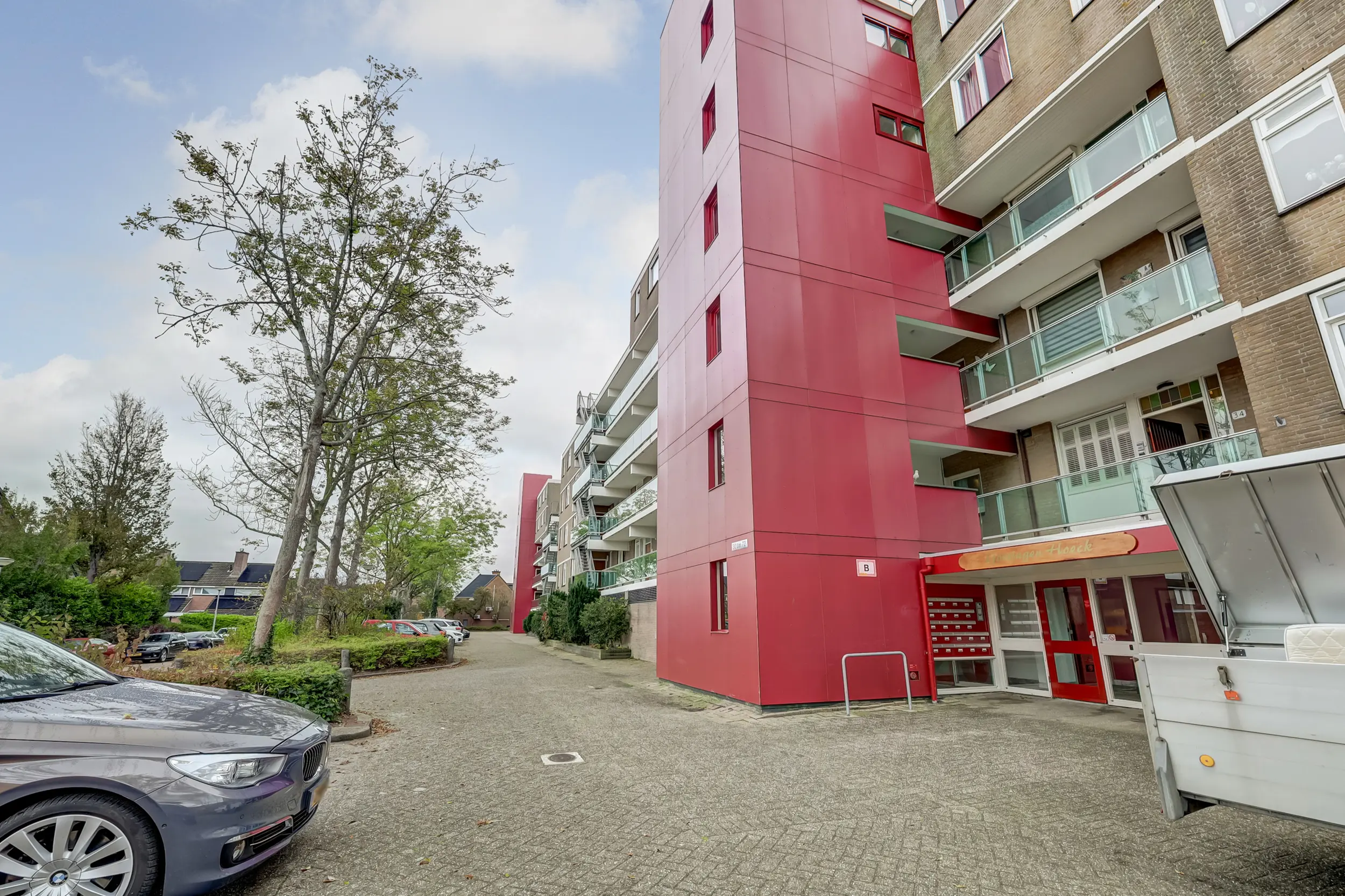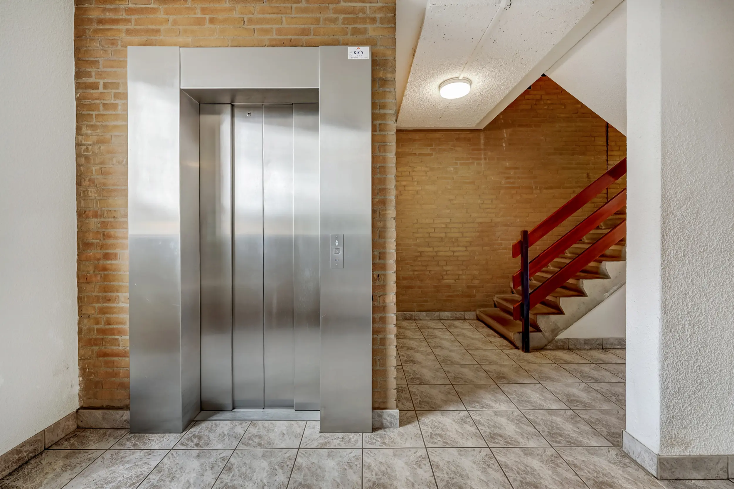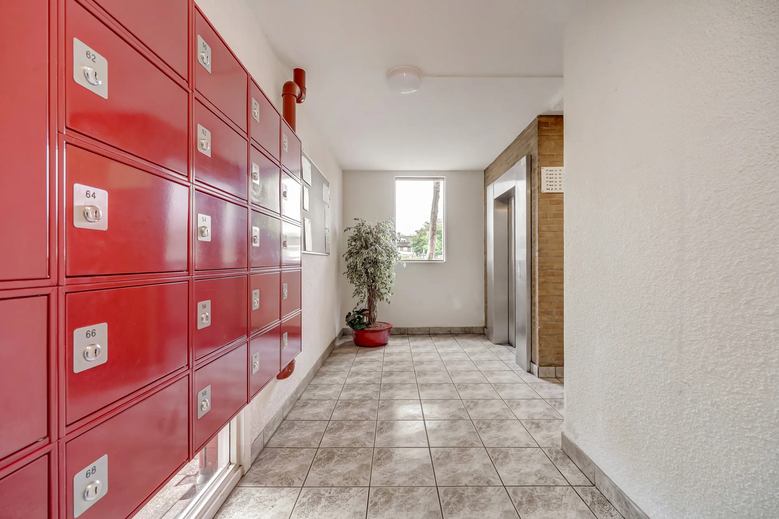 Vanaf de straatzijde kom je in de centrale hal met de postbussen, trappenhuis, lift, toegang tot de parkeerkelder en de bergingen.