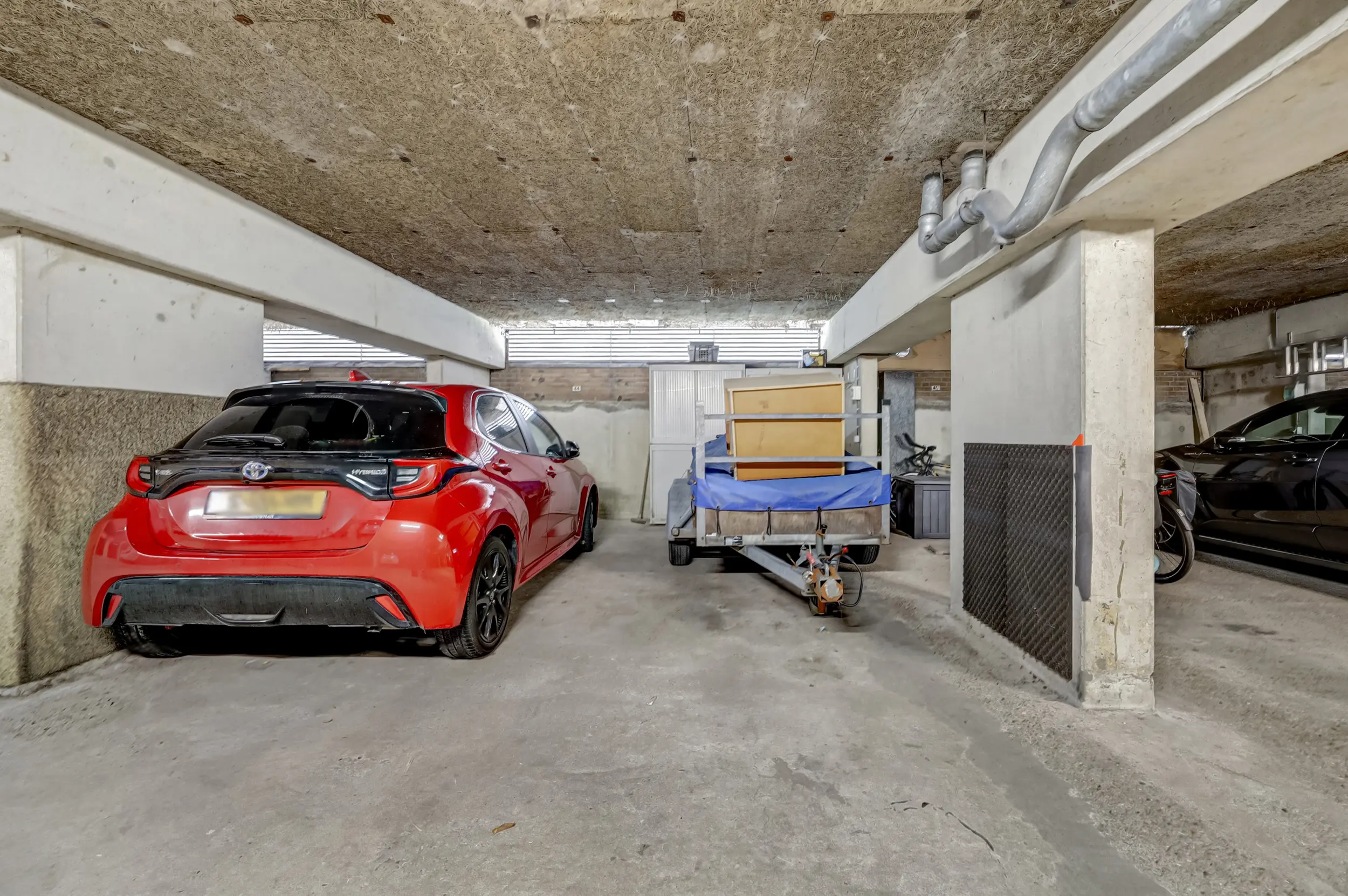 Bij het appartement hoort een eigen parkeerplek in de parkeerkelder onderin het gebouw. Zo staat de auto veilig en kun je inpandig naar de centrale ruimte bij de lift en het trappenhuis.