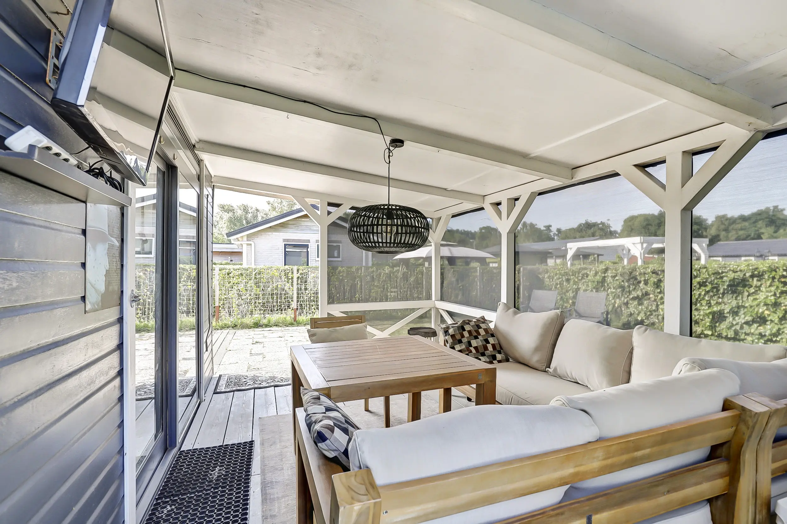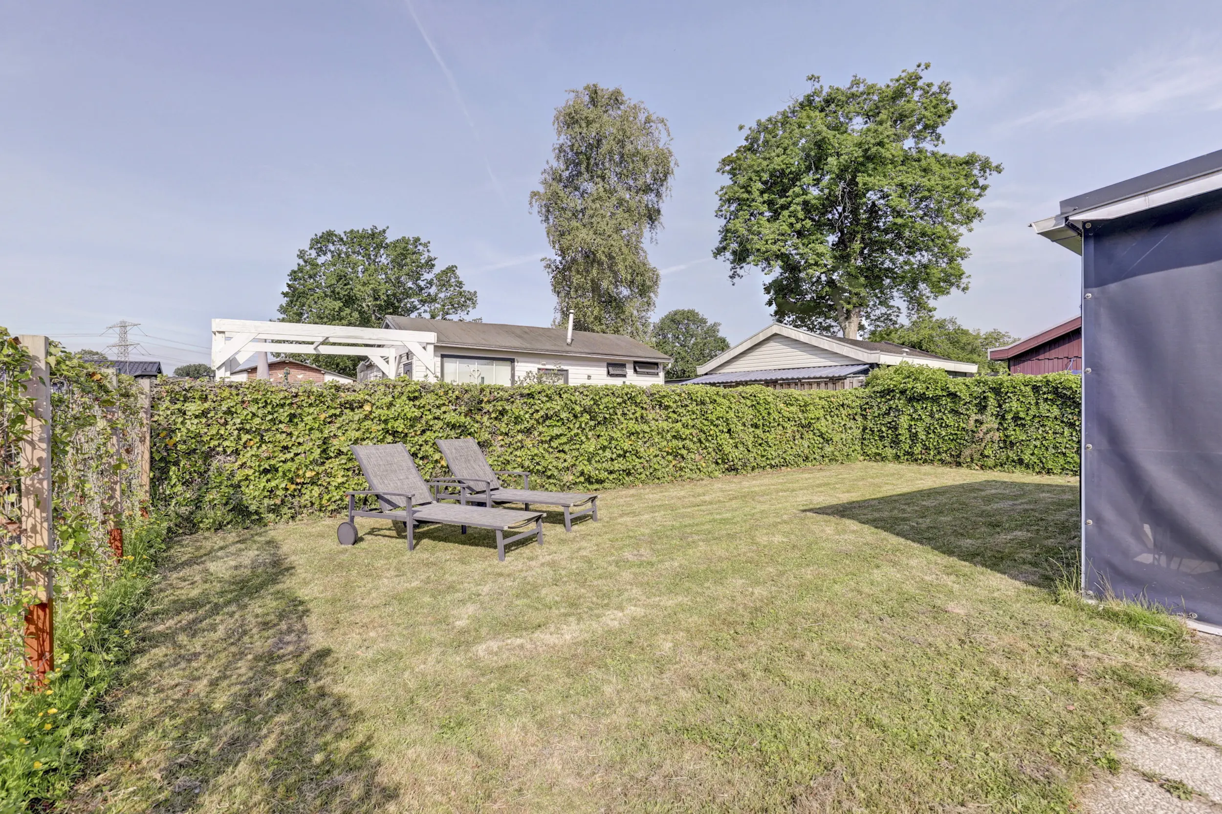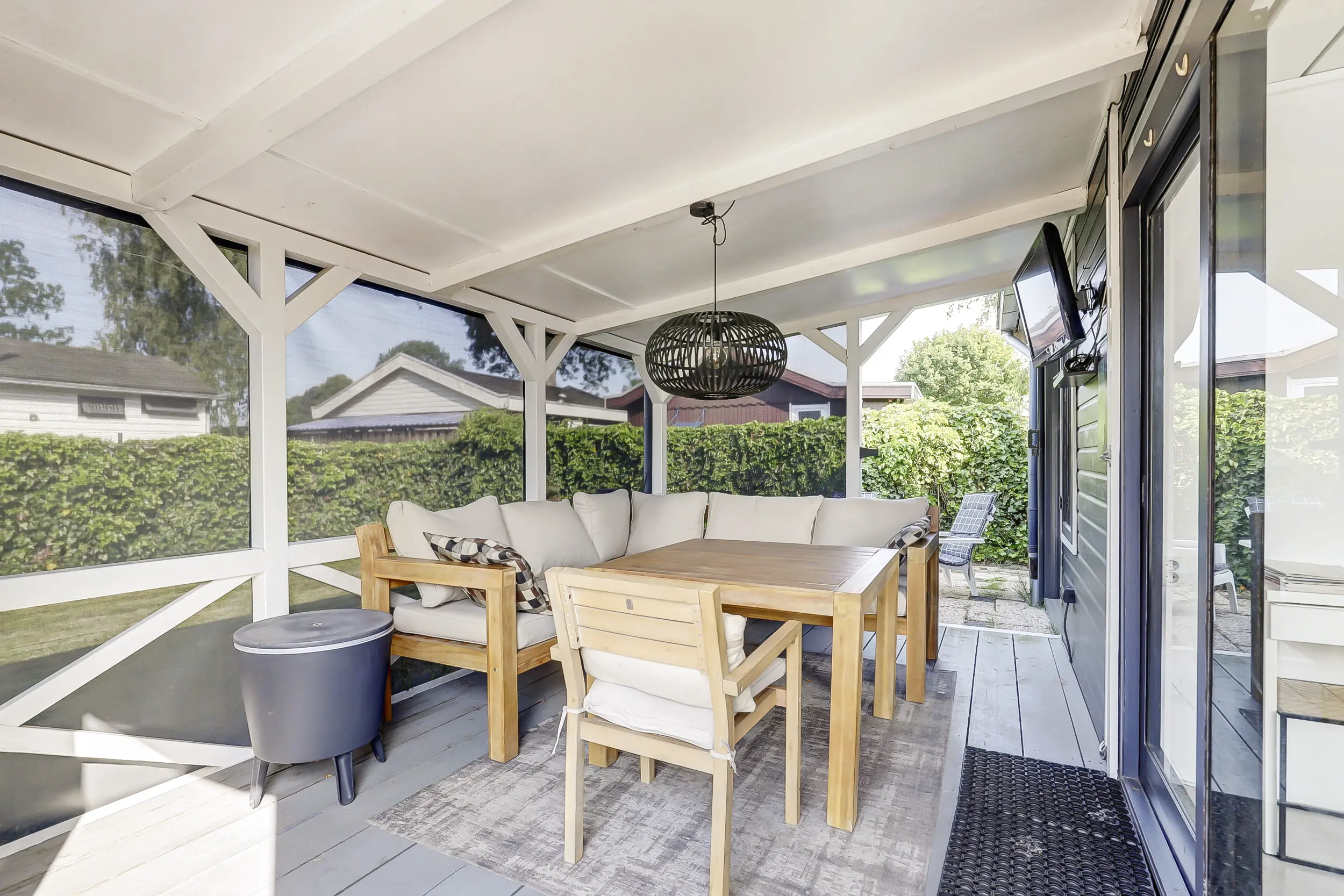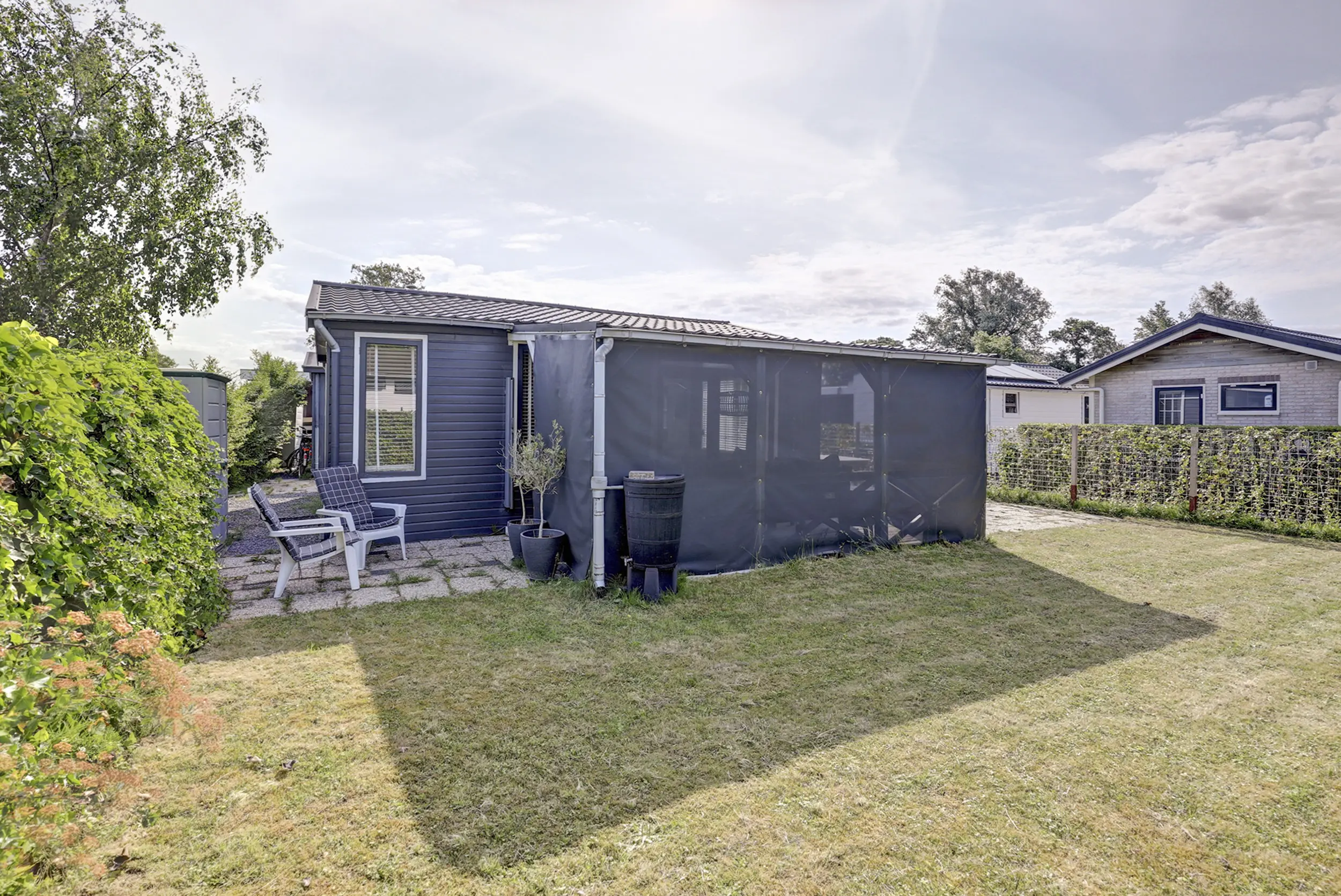 De tuin is ruim en voorzien van een gazon, heggen en een terras. Op de veranda is het heerlijk loungen. De veranda is grotendeels afsluitbaar door middel van doek, zodat je hier tot laat in de avond kunt genieten.