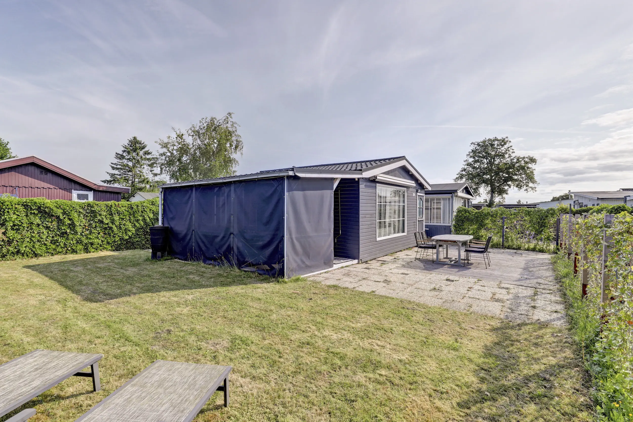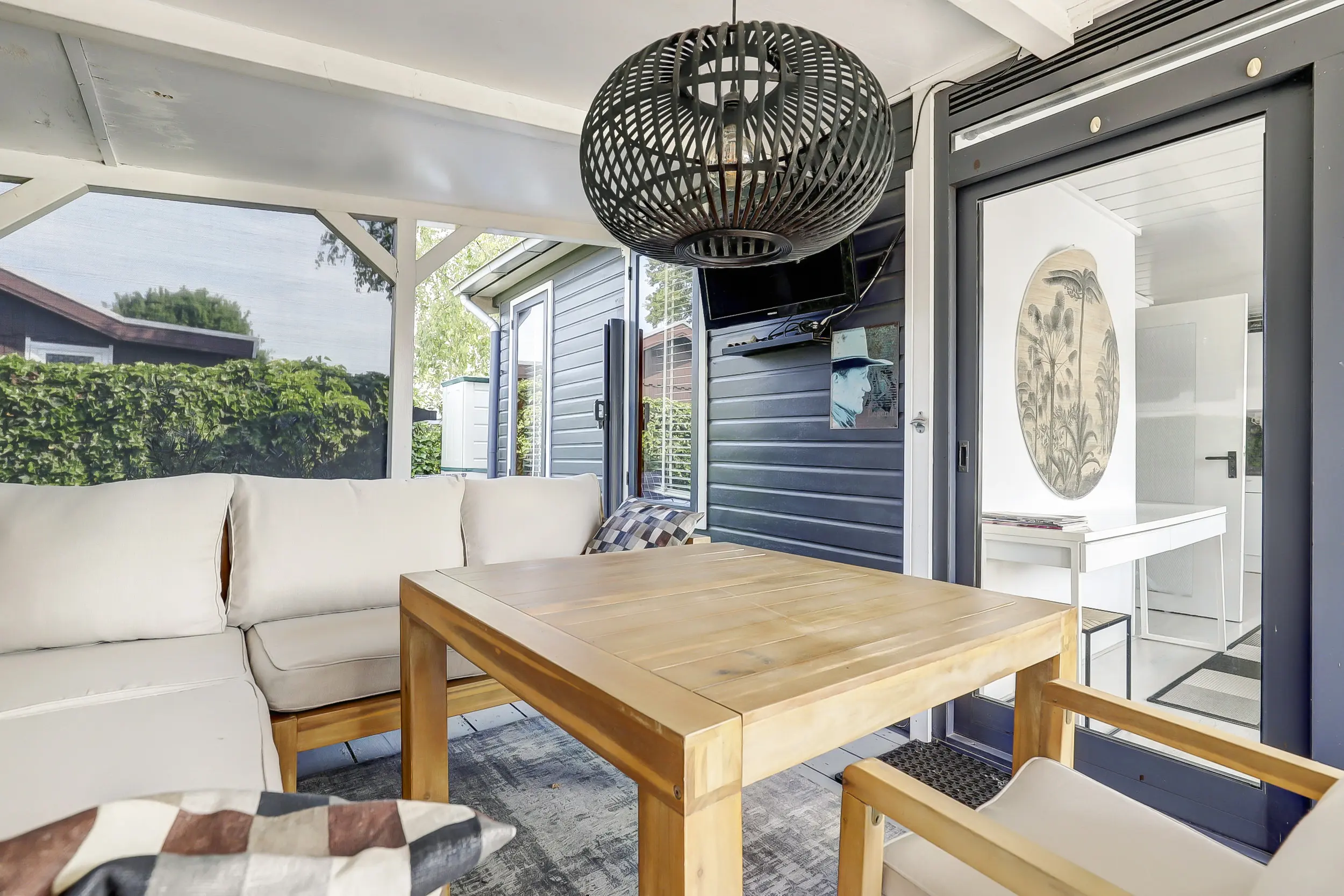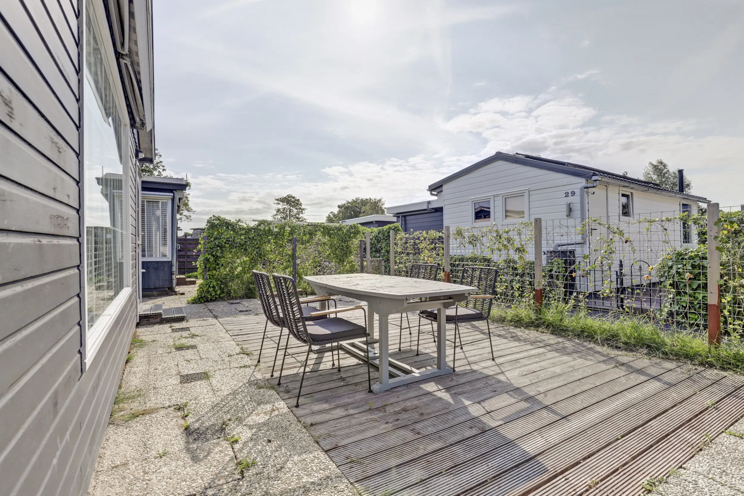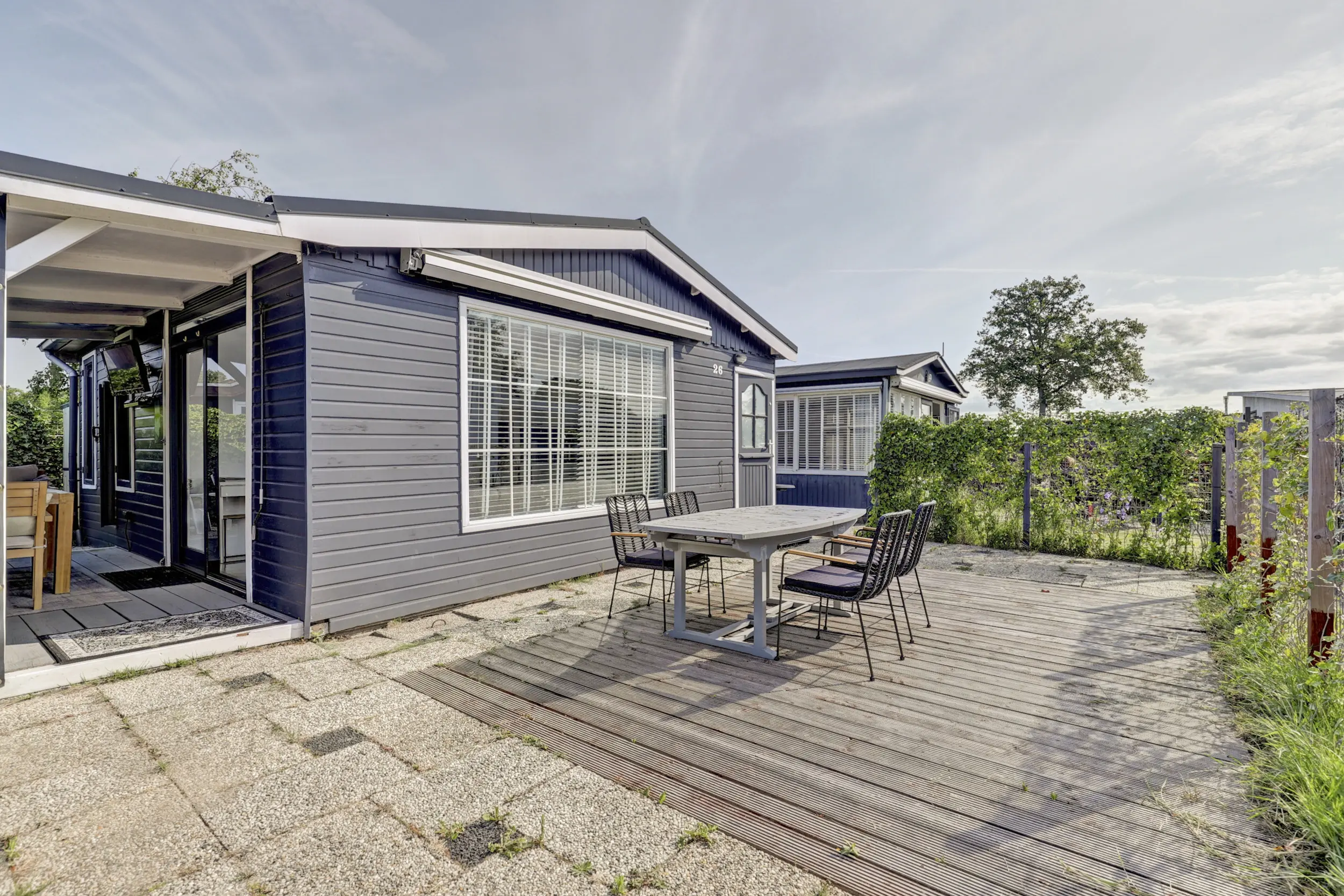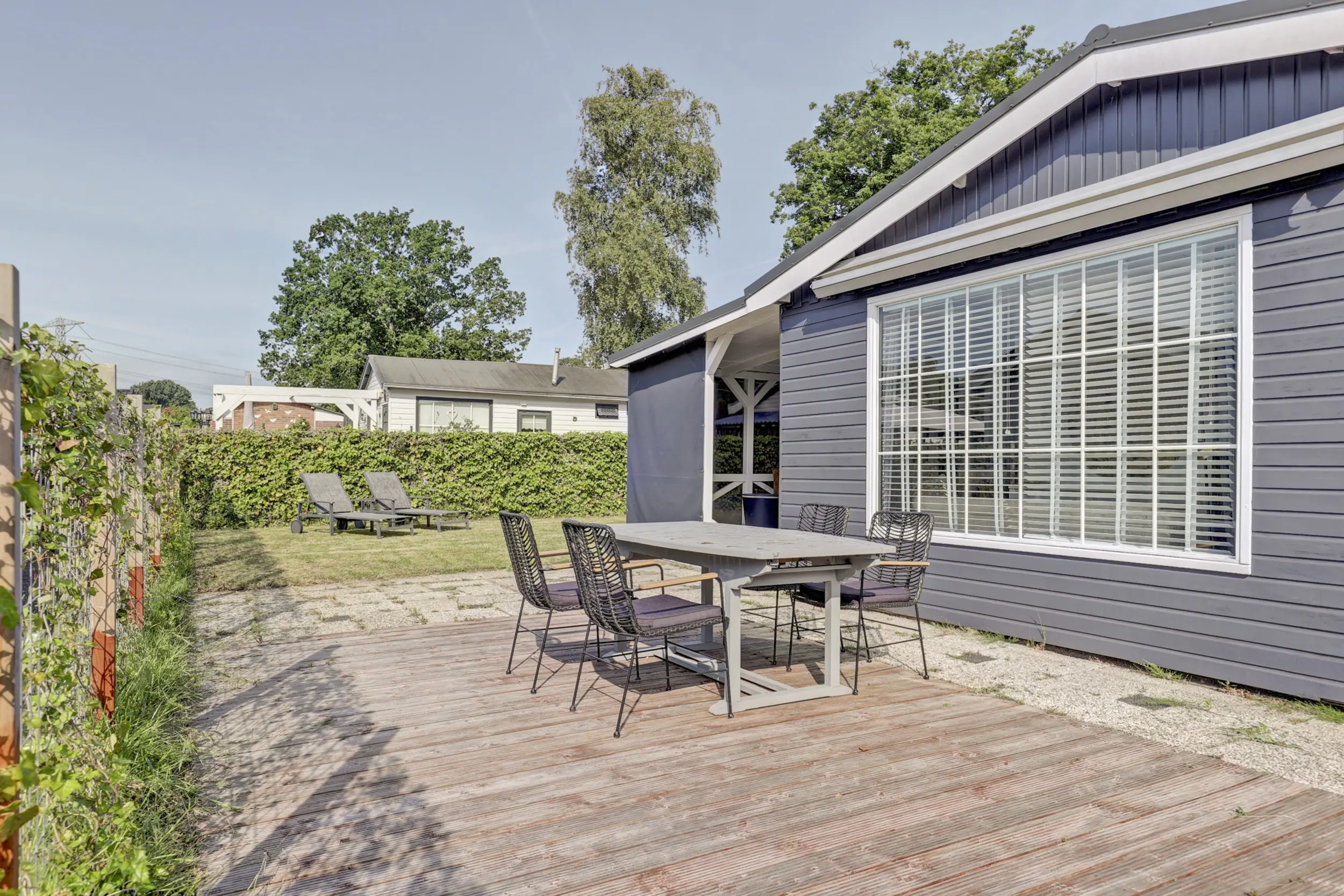 De tuin is ruim en voorzien van een gazon, heggen en een terras. Op de veranda is het heerlijk loungen. De veranda is grotendeels afsluitbaar door middel van doek, zodat je hier tot laat in de avond kunt genieten.