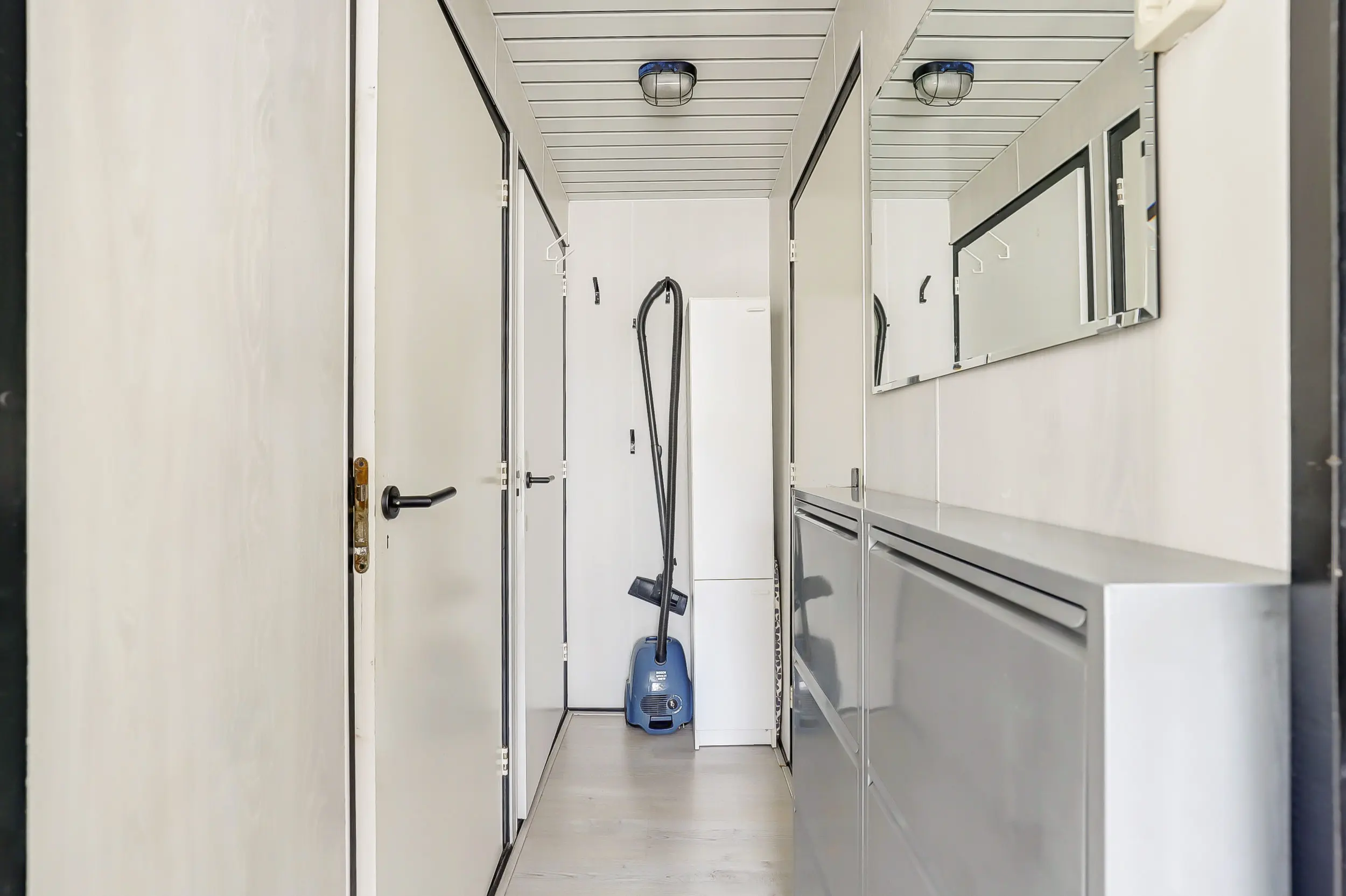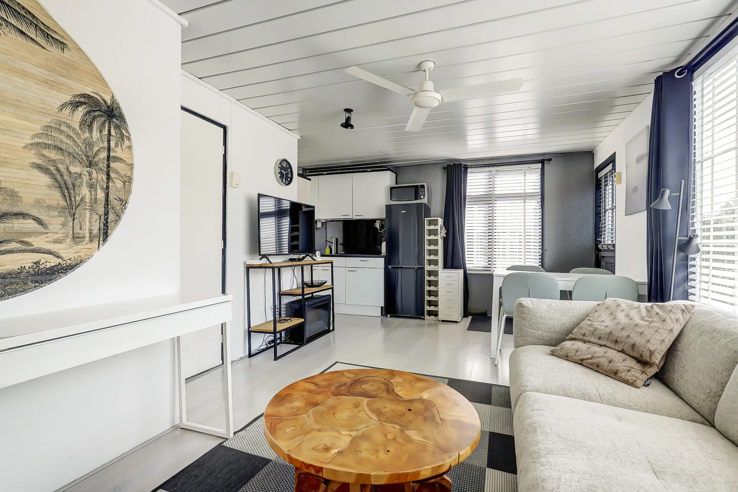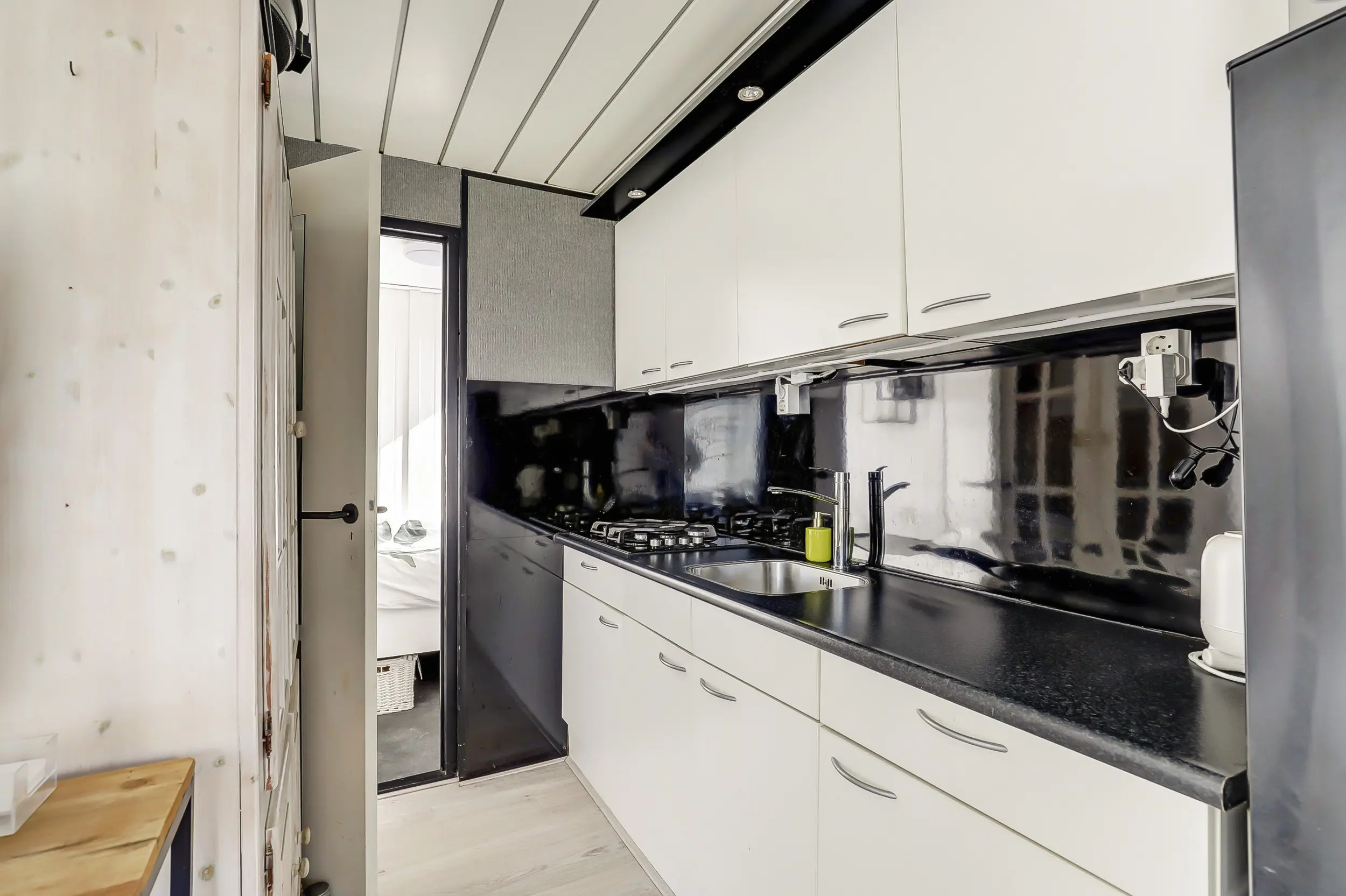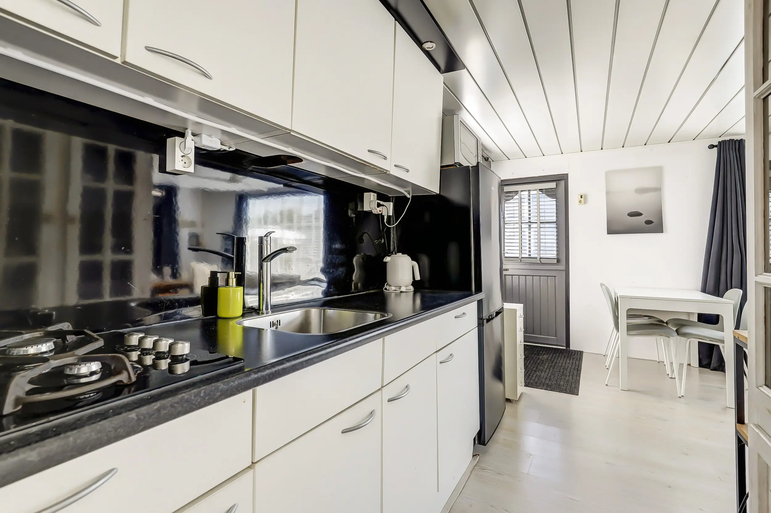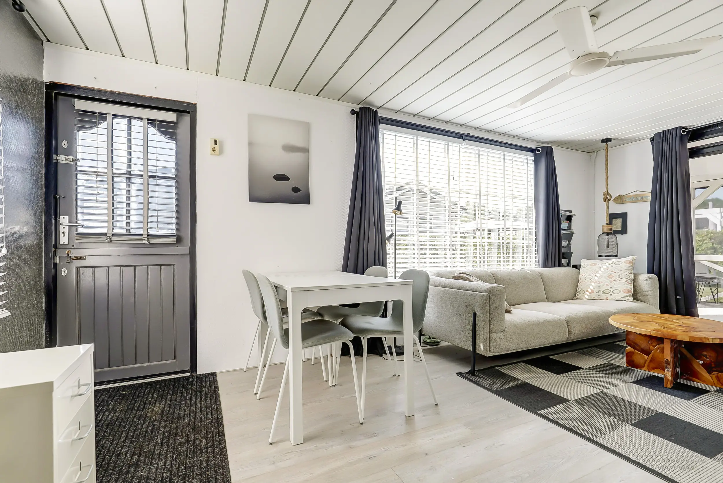 Lichte woonkamer met een eet- en zithoek. Een open keuken met 4-pits gasfornuis, koelkast, vriezer, magnetron en oven. Tussenhal met twee slaapkamers met vaste bedden en badkamer.