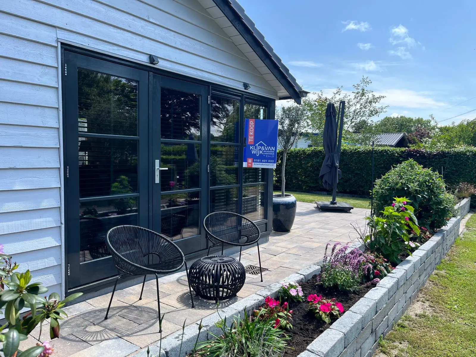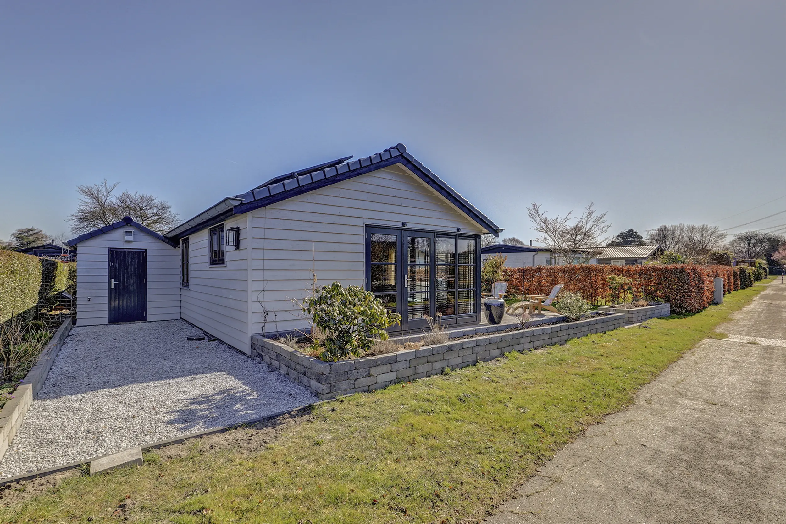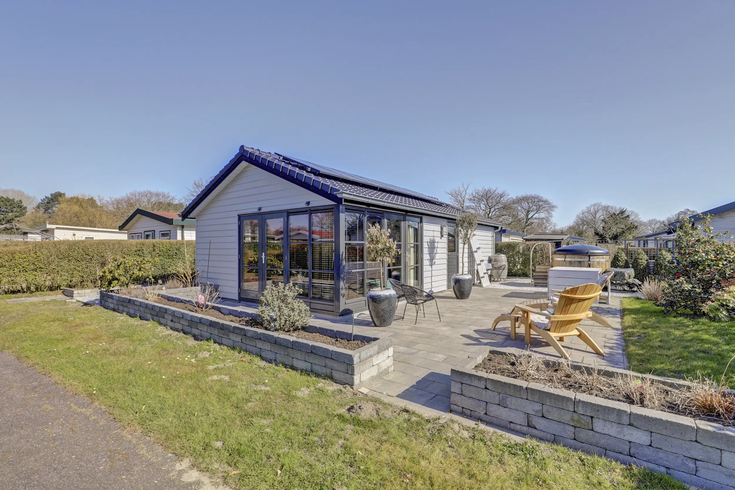 Ruime onderhoudsvriendelijke tuin met bestrating, een groene erfafscheiding en meerdere buitenkranen. Een heerlijke plek om te ontspannen, mede dankzij de houtgestookte hot tub.