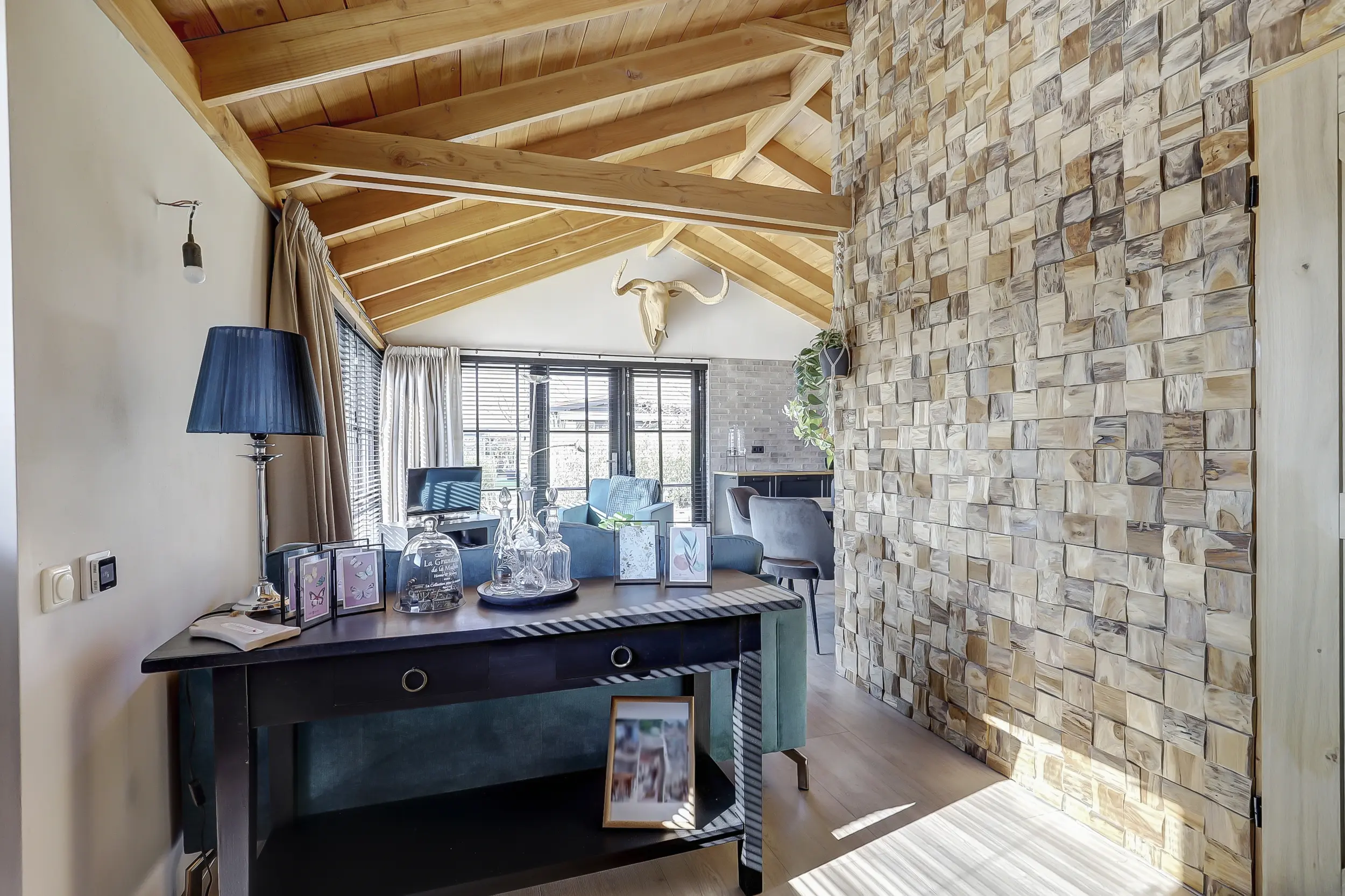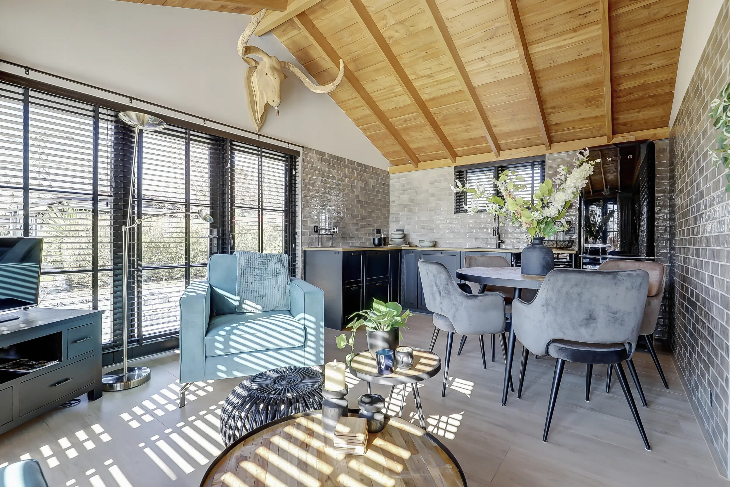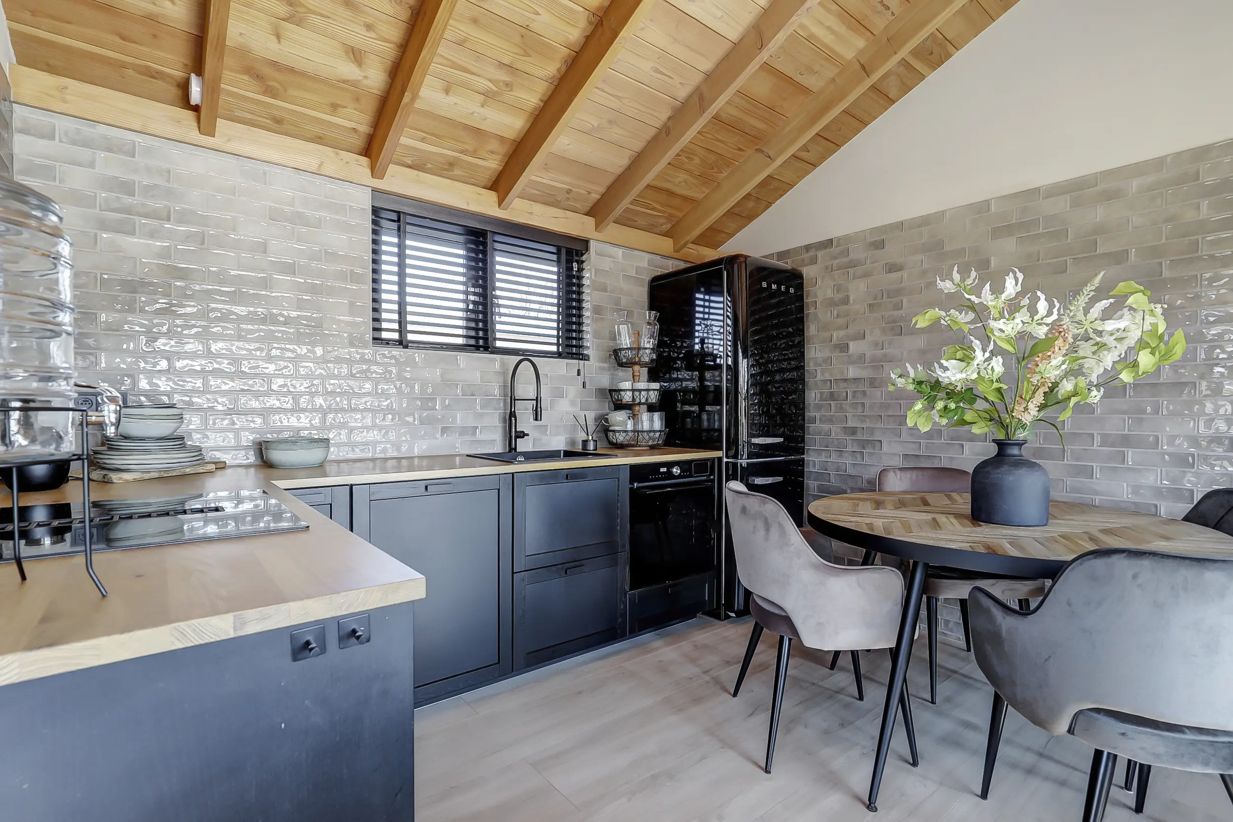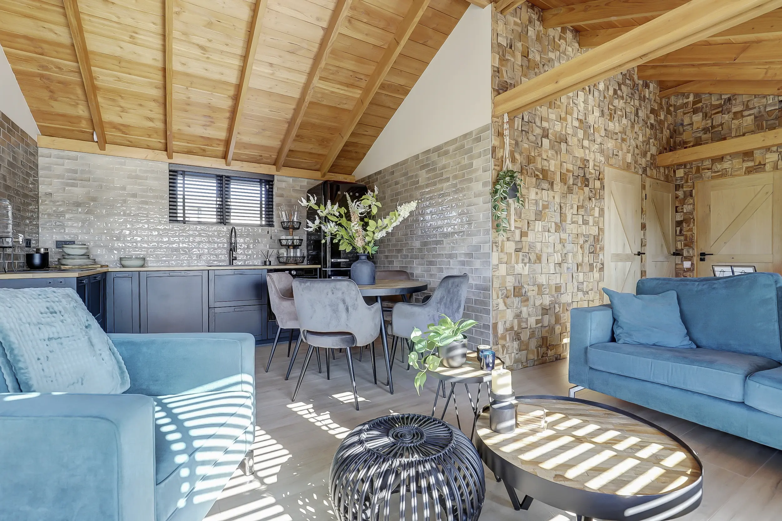 Ruime, lichte living met twee dubbele tuindeuren, waardoor binnen en buiten naadloos in elkaar overlopen. De mooie houten wandafwerking geeft de ruimte een warme en sfeervolle uitstraling. Moderne open keuken, volledig uitgerust met inbouwapparatuur, waaronder een combimagnetron en een SMEG-koelkast met vriezer. Twee comfortabele slaapkamers, perfect voor een gezin of gasten. Luxe badkamer met een inloopdouche met glazen scherm, een hangend toilet en een stijlvol wastafelmeubel met een natuurstenen waskom.