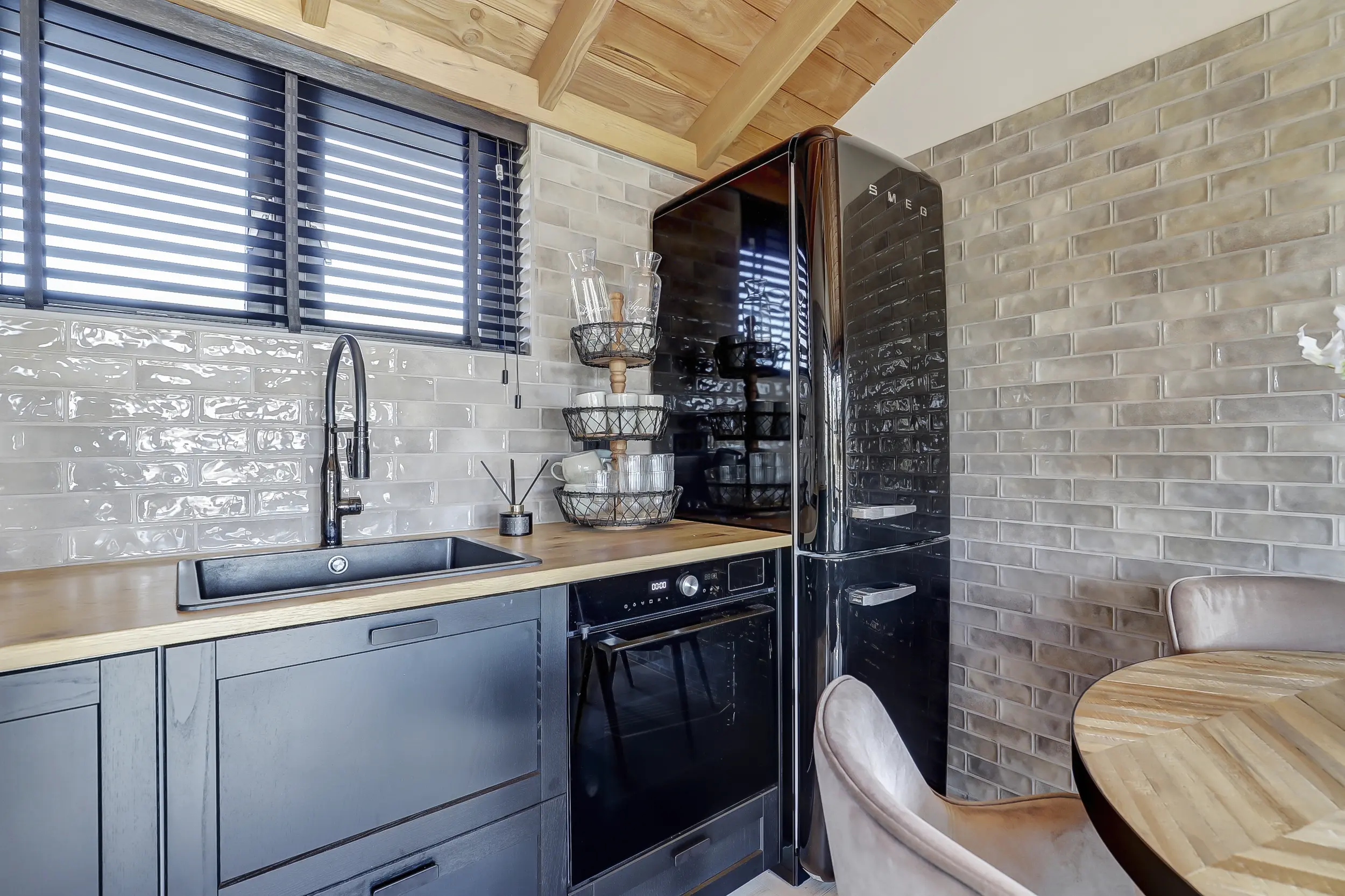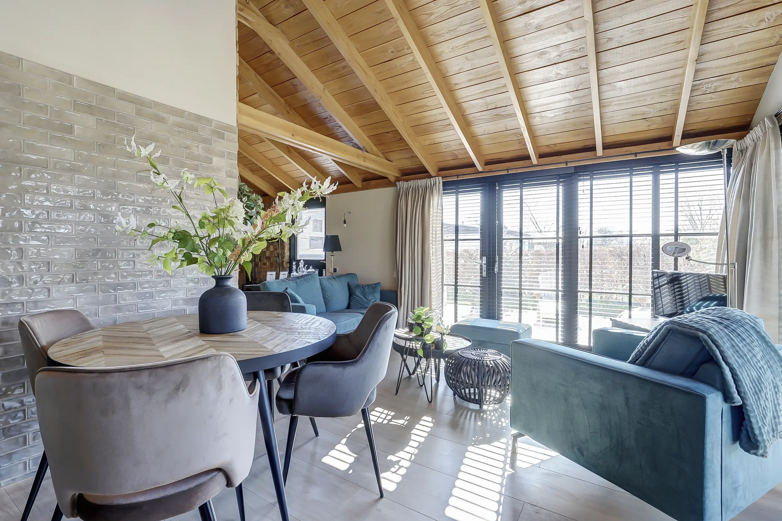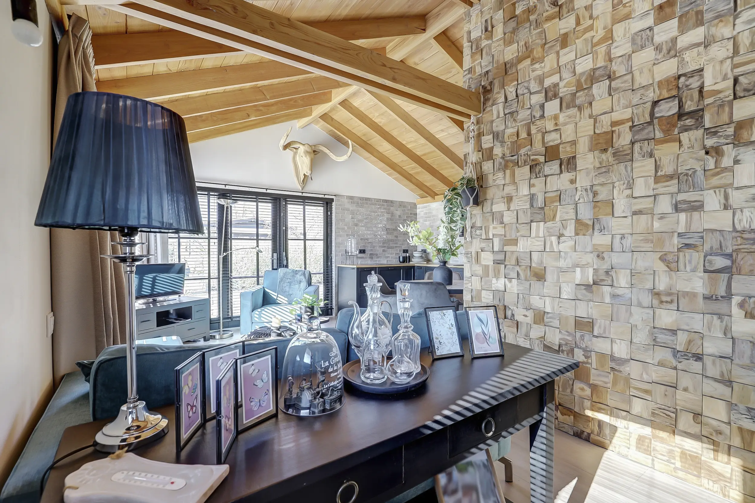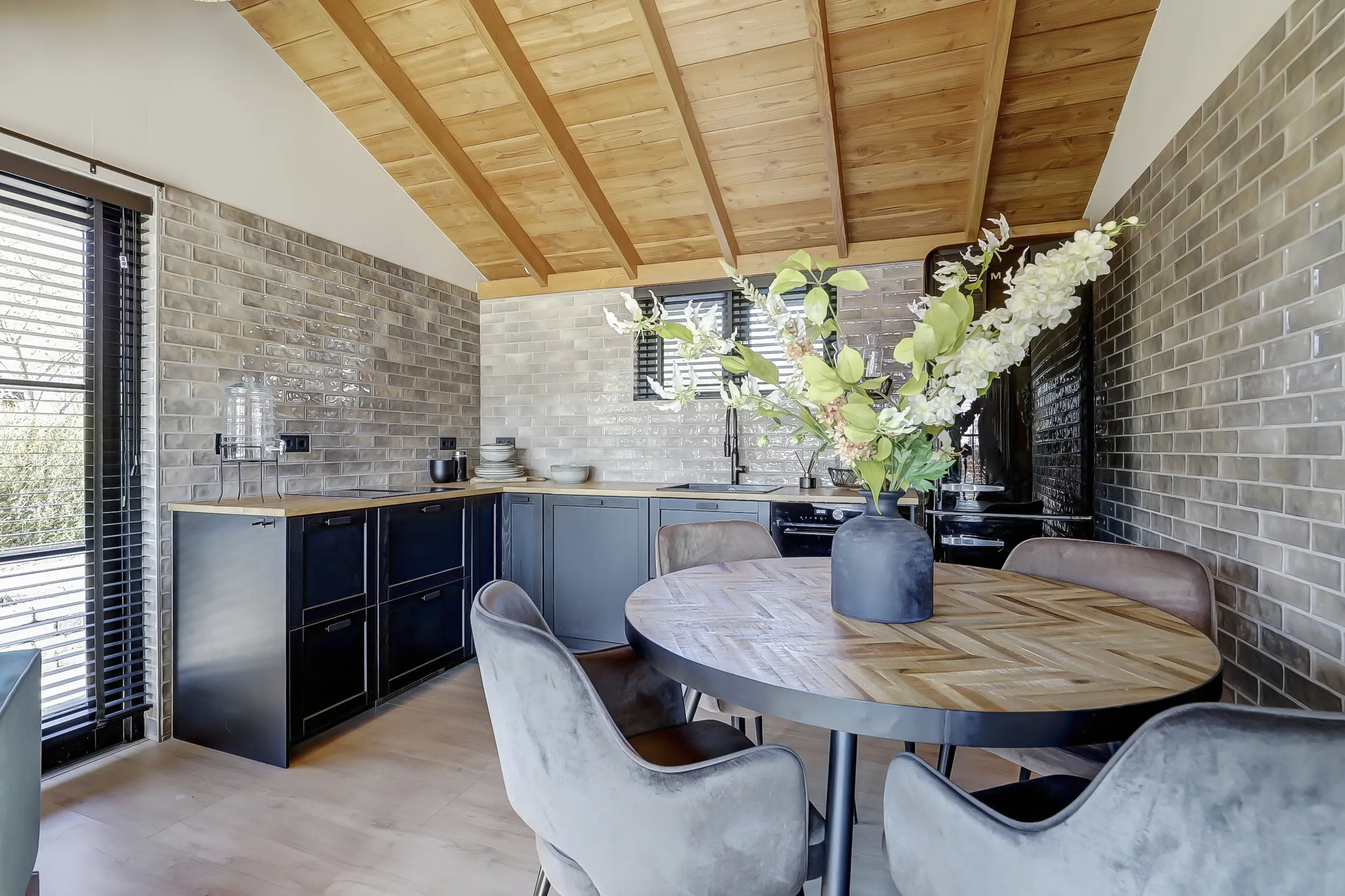 Ruime, lichte living met twee dubbele tuindeuren, waardoor binnen en buiten naadloos in elkaar overlopen. De mooie houten wandafwerking geeft de ruimte een warme en sfeervolle uitstraling. Moderne open keuken, volledig uitgerust met inbouwapparatuur, waaronder een combimagnetron en een SMEG-koelkast met vriezer. Twee comfortabele slaapkamers, perfect voor een gezin of gasten. Luxe badkamer met een inloopdouche met glazen scherm, een hangend toilet en een stijlvol wastafelmeubel met een natuurstenen waskom.