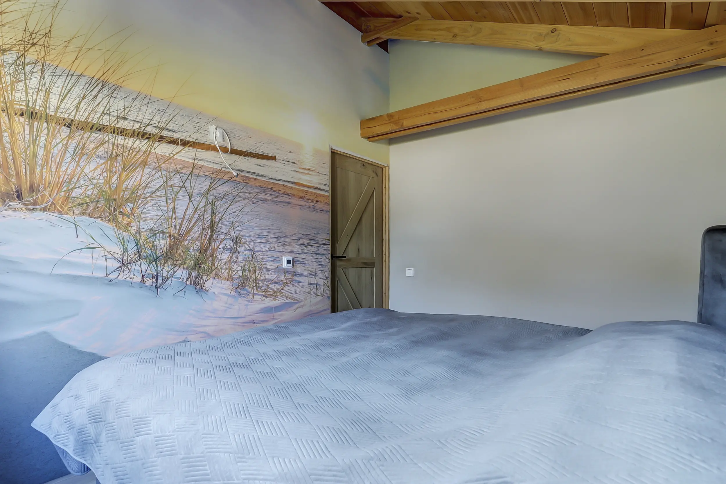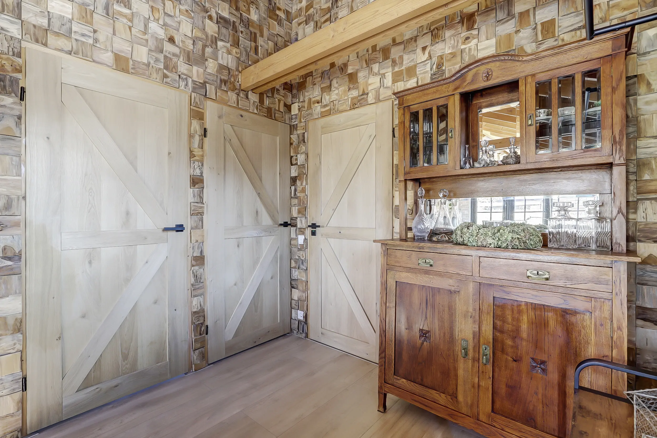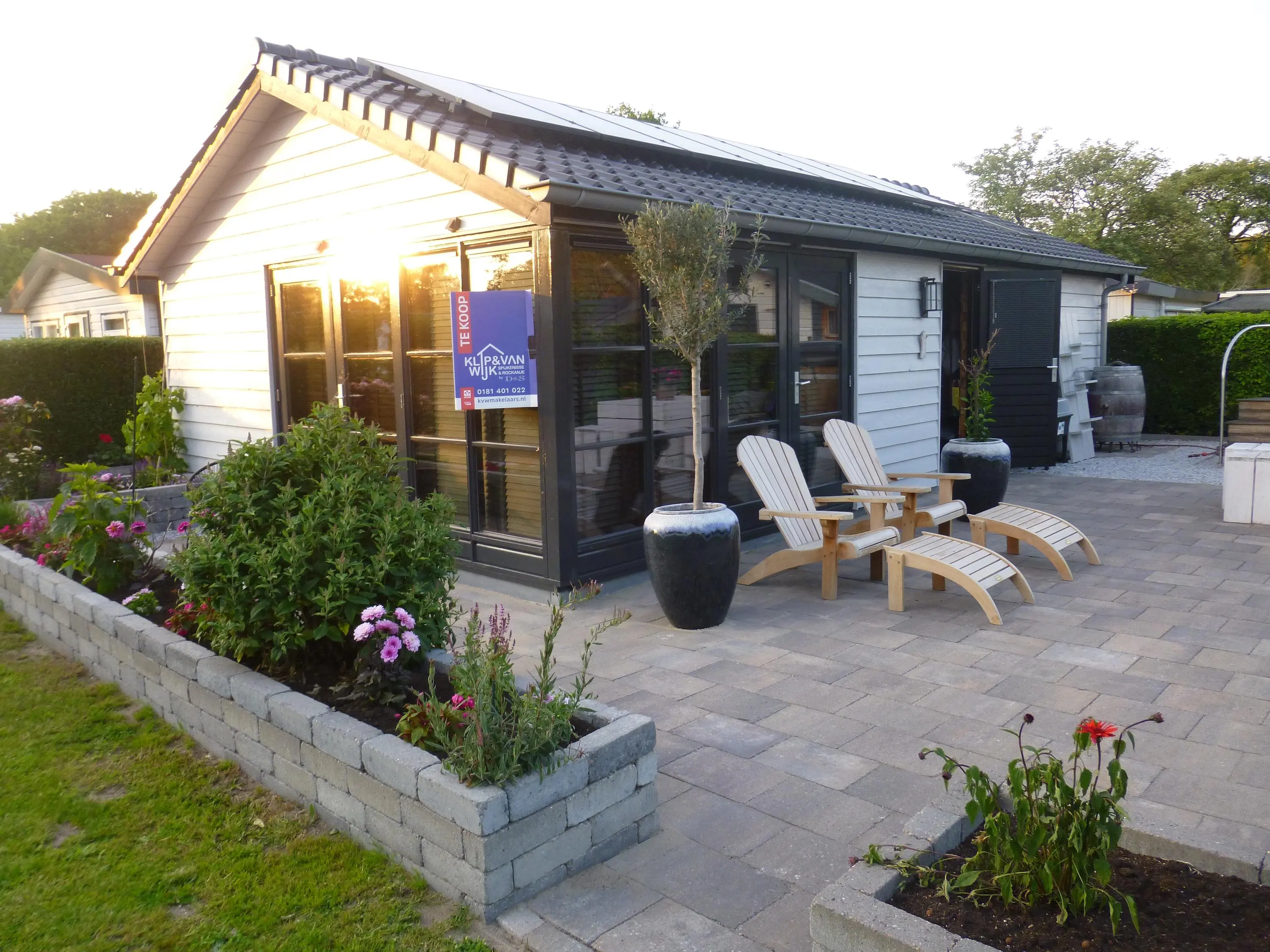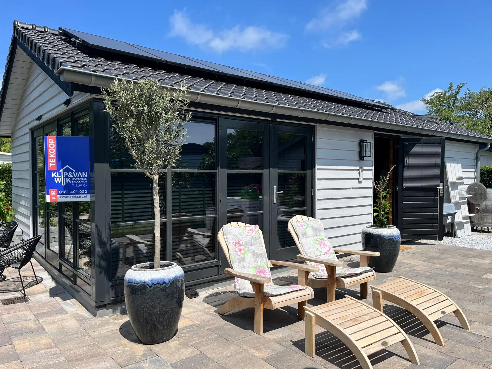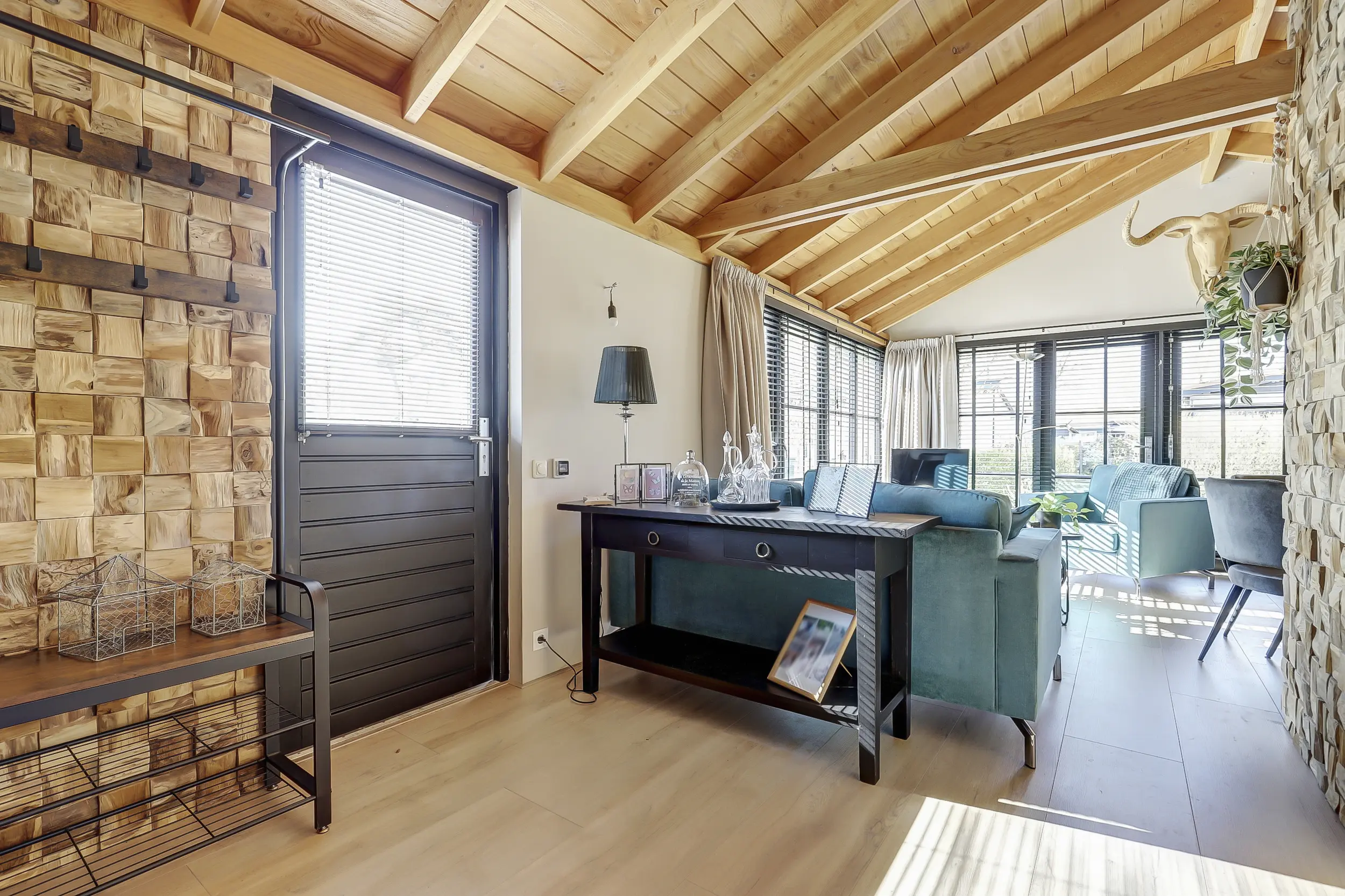 Ruime, lichte living met twee dubbele tuindeuren, waardoor binnen en buiten naadloos in elkaar overlopen. De mooie houten wandafwerking geeft de ruimte een warme en sfeervolle uitstraling. Moderne open keuken, volledig uitgerust met inbouwapparatuur, waaronder een combimagnetron en een SMEG-koelkast met vriezer. Twee comfortabele slaapkamers, perfect voor een gezin of gasten. Luxe badkamer met een inloopdouche met glazen scherm, een hangend toilet en een stijlvol wastafelmeubel met een natuurstenen waskom.