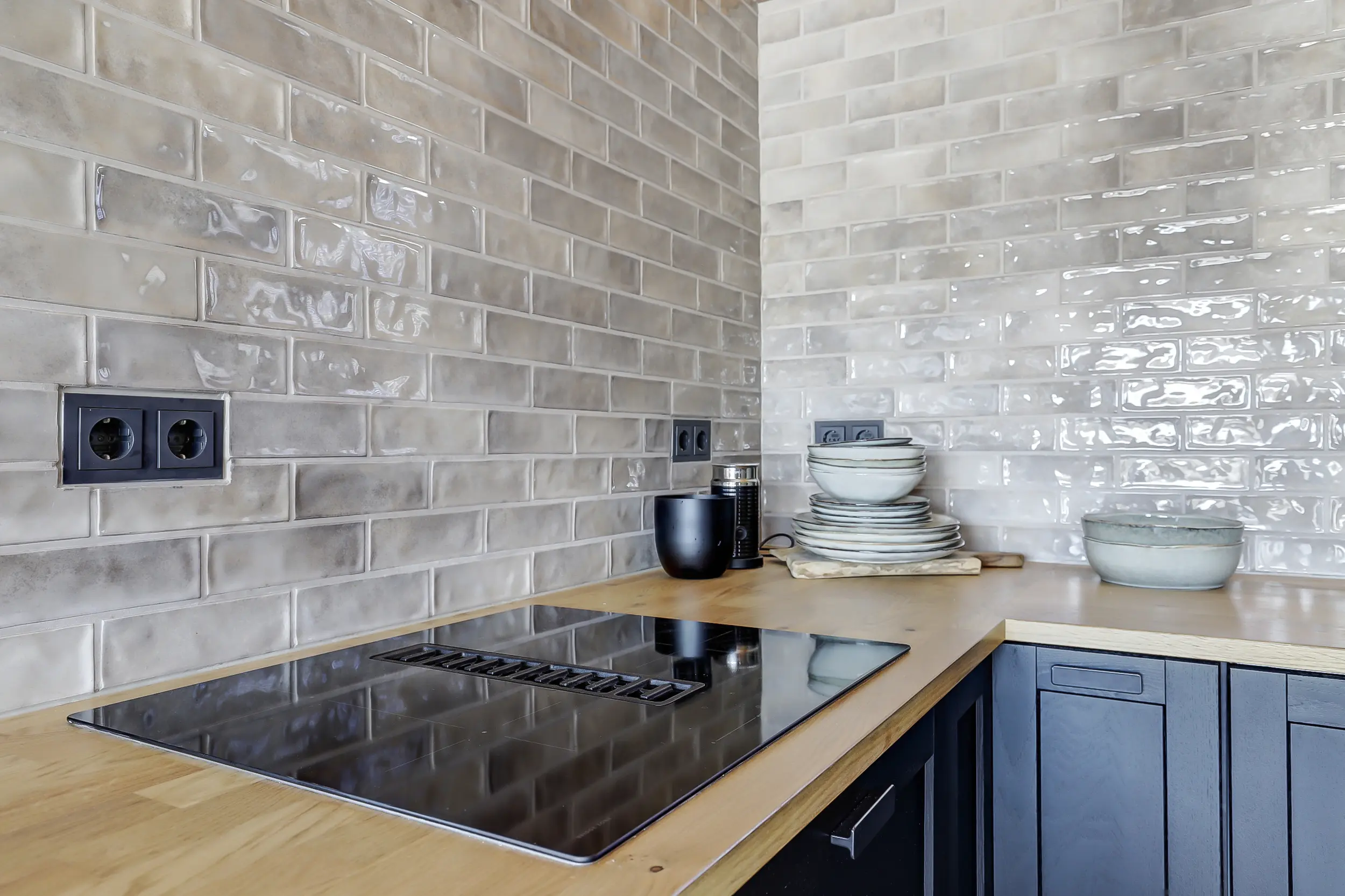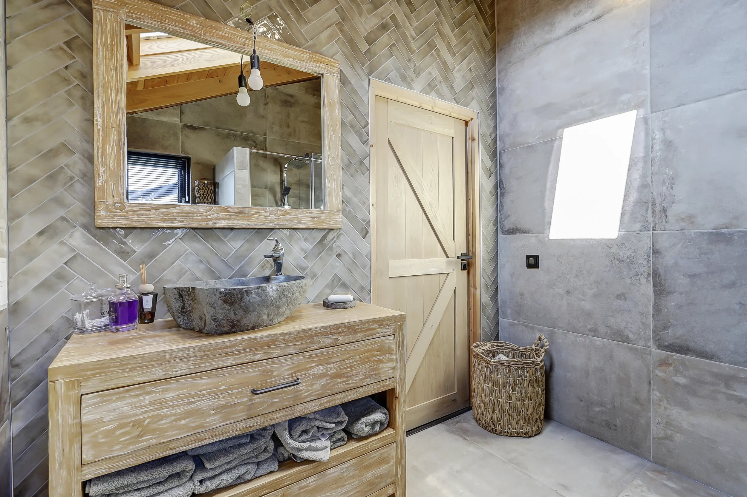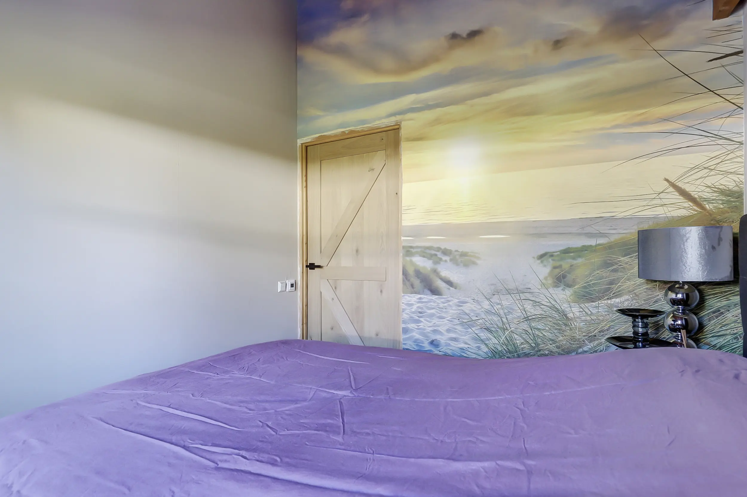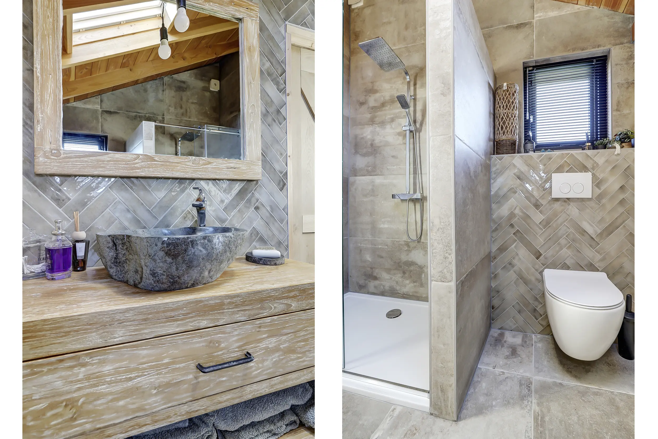 Ruime, lichte living met twee dubbele tuindeuren, waardoor binnen en buiten naadloos in elkaar overlopen. De mooie houten wandafwerking geeft de ruimte een warme en sfeervolle uitstraling. Moderne open keuken, volledig uitgerust met inbouwapparatuur, waaronder een combimagnetron en een SMEG-koelkast met vriezer. Twee comfortabele slaapkamers, perfect voor een gezin of gasten. Luxe badkamer met een inloopdouche met glazen scherm, een hangend toilet en een stijlvol wastafelmeubel met een natuurstenen waskom.