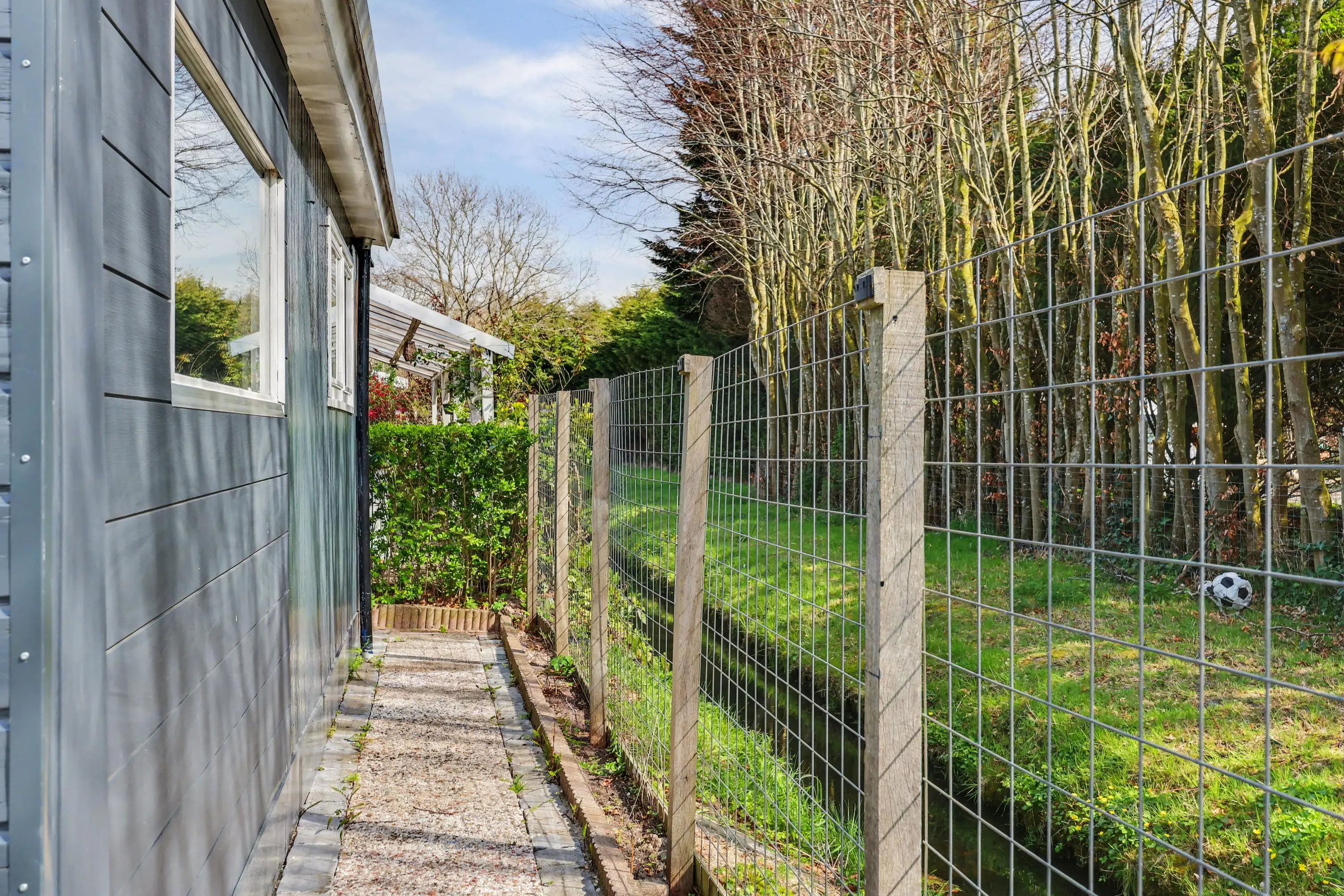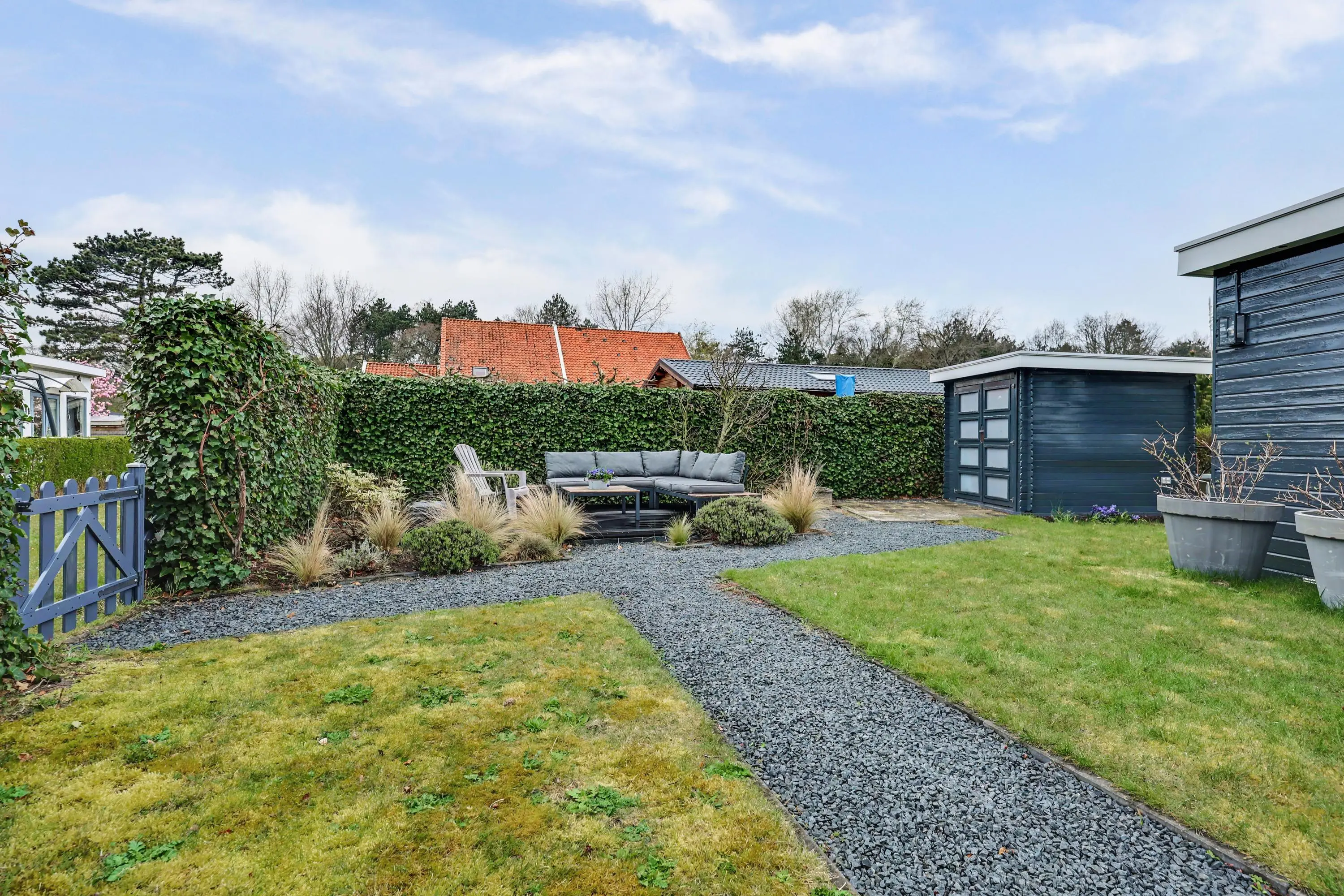 In de tuin is een vrijstaande houten buitenberging, ideaal voor bijvoorbeeld fietsen, surfspullen en tuingereedschap.
