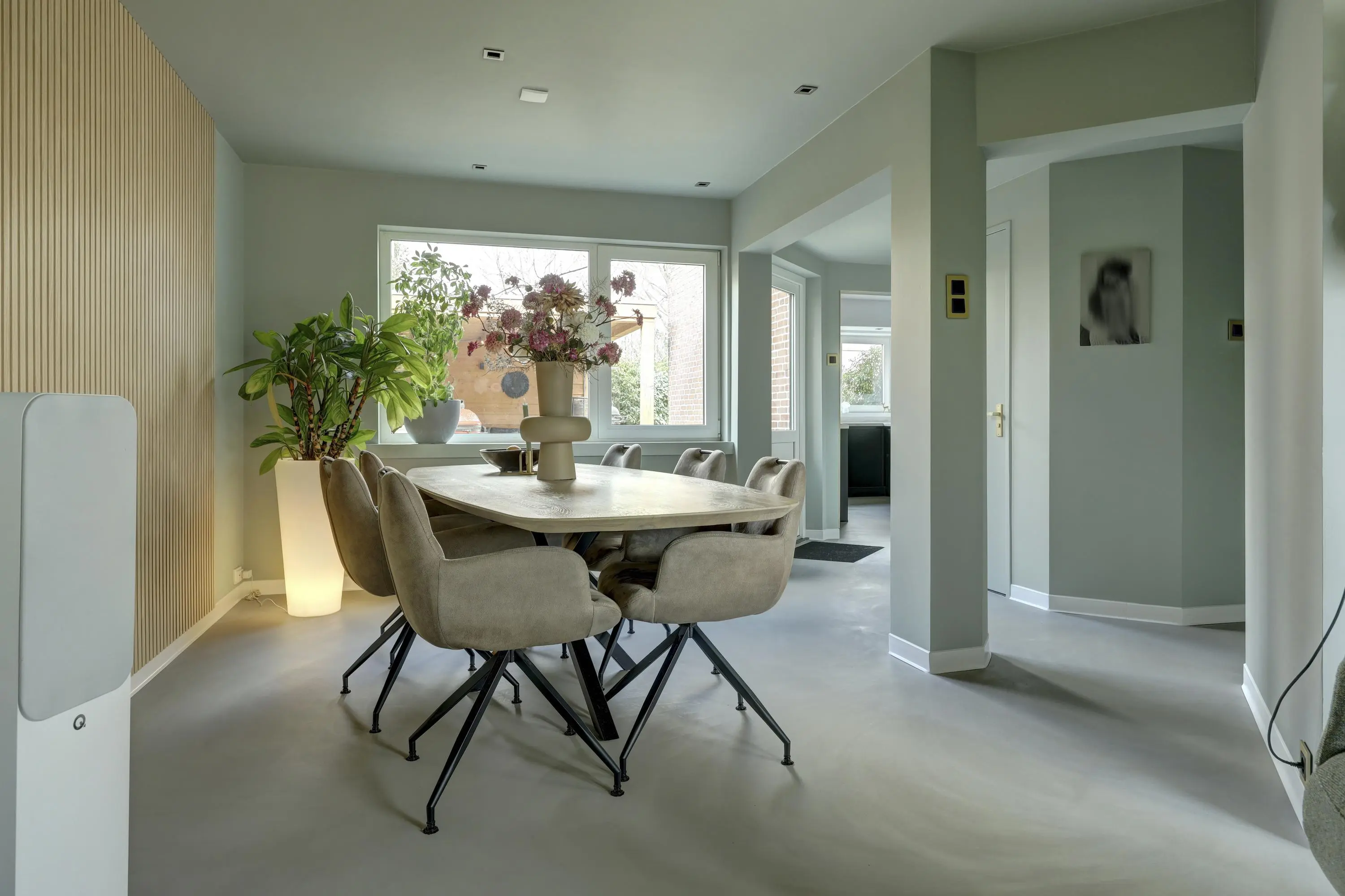 Entree in het ‘torengedeelte’ welke centraal in het huis ligt. Vanuit hier is de woonruimte, garage en 1e verdieping bereikbaar. In de entree is een bergkast waarin de CV-ketel is opgesteld (Remeha Calenta 2014). De woonverdieping is voorzien van een eigentijdse strijkvloer met vloerverwarming en is modern en sfeervol ingericht. Het woongedeelte ligt aan de voorzijde van de woning. Hier vind je een open haard en mooi lichtinval in huis. Door de open indeling aan de achterzijde van de kamer is ruimte voor de eettafel om heerlijk te zitten met familie of vrienden. De halfopen keuken gelegen aan de tuinzijde is van 2025 en van alle gemakken voorzien. De inbouwapparatuur bestaat uit een Bora inductieplaat met downdraft afzuiging, Quooker, een wijnkast, een vaatwasser, een stoomoven en oven met warmhoud lade en een koelkast en vriezer! Dit alles in een moderne uitvoering in U-opstelling. Hier is koken een feestje! Een grote inbouwkast biedt extra opbergruimte. Tussen de woonkamer en keuken zijn de betegelde toiletruimte en de meterkast gelegen. De tuin is bereikbaar via de tuindeur.