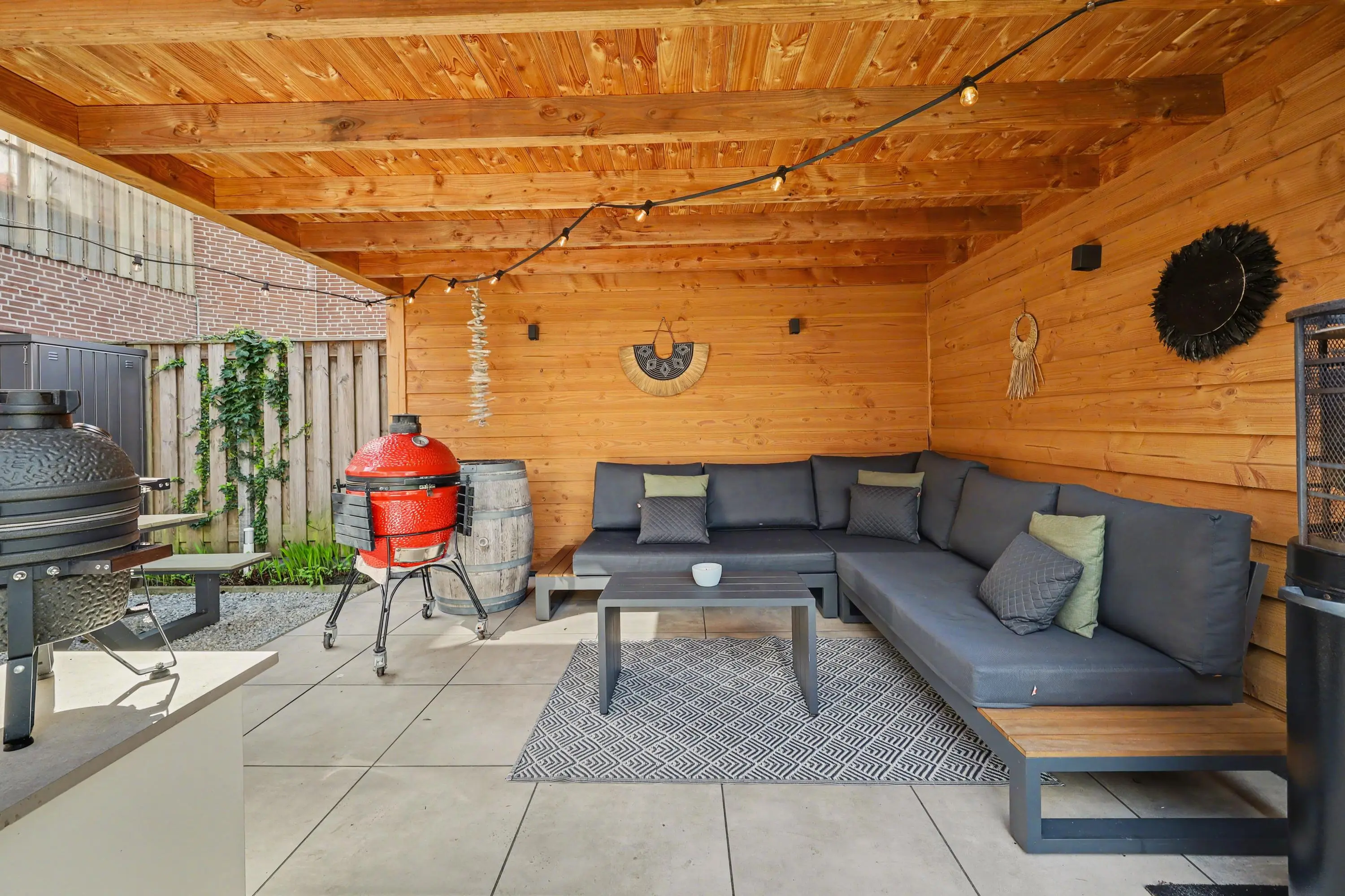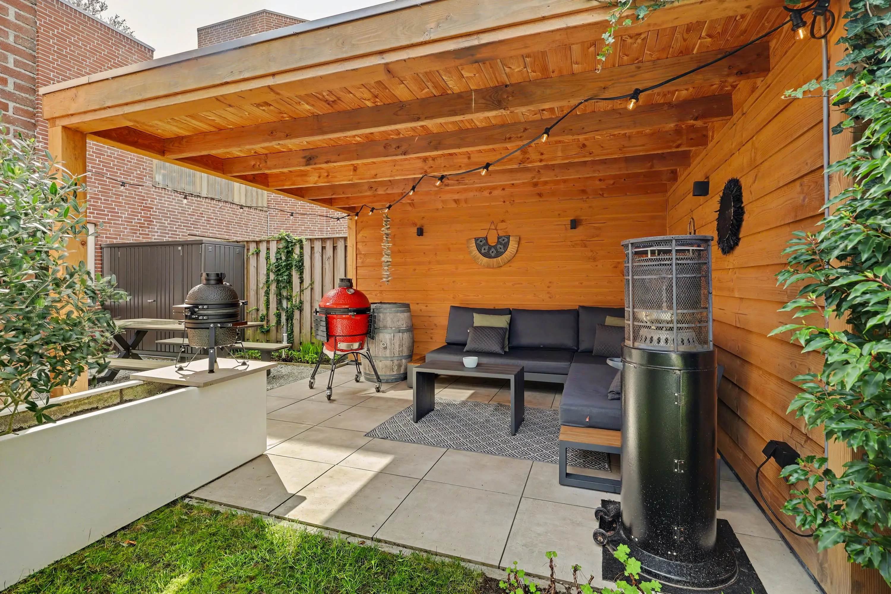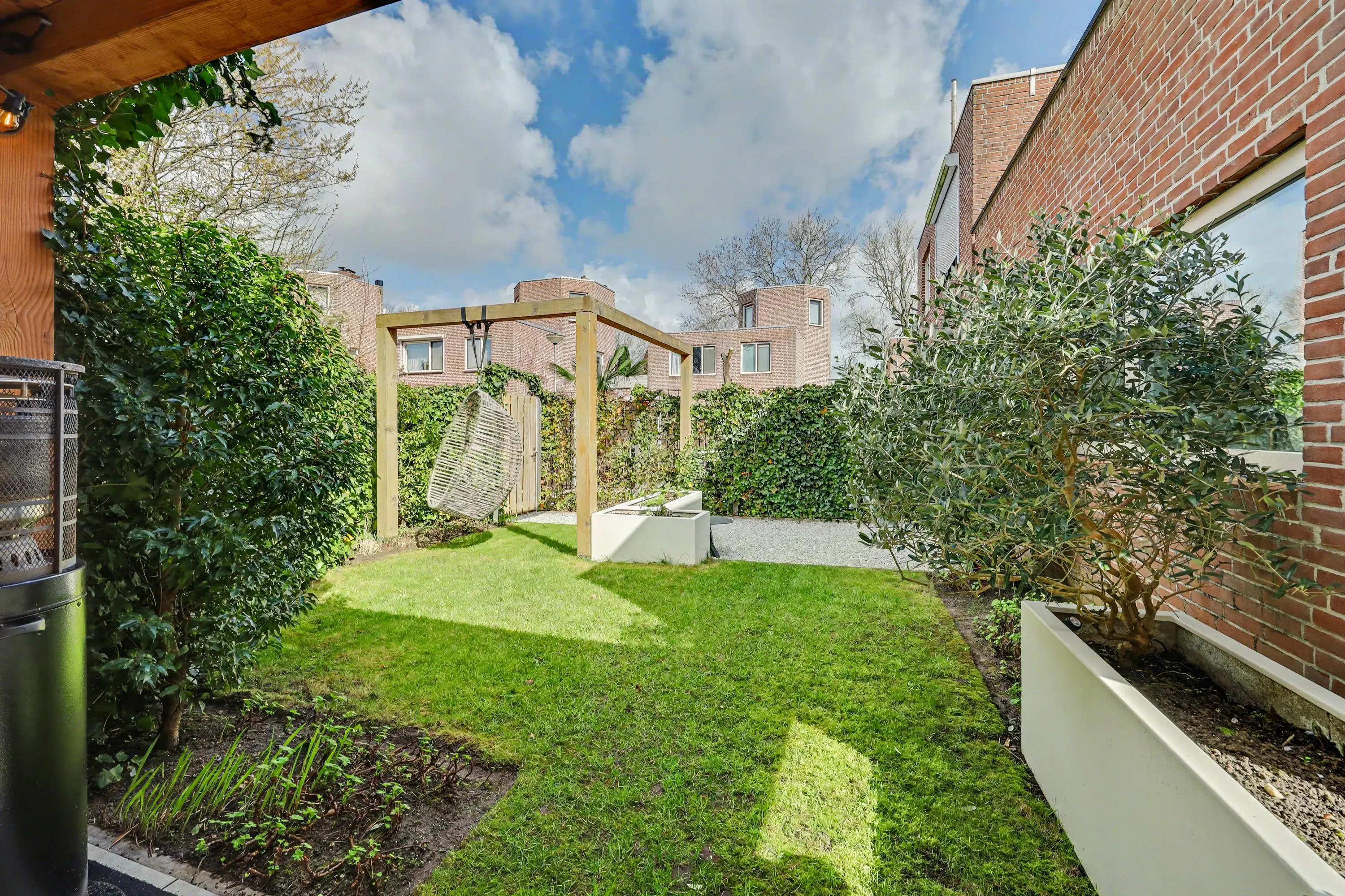 De verzorgde achtertuin met achterom biedt veel privacy, heeft een mooie overkapping met verlichting, een pergola, gazon en meerdere leuke zithoekjes. En natuurlijk is dan op de 1e verdieping het fijne dakterras.