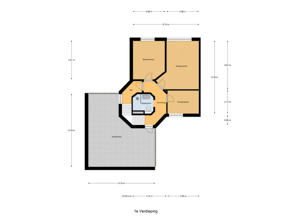 Deze verdieping heeft drie slaapkamers waarvan een kamer in gebruik is als kastenkamer. De badkamer ligt centraal in de toren en heeft een inloopdouche, 2e toilet en een wastafel. Alle ruimten zijn net als het dakterras bereikbaar vanaf de overloop. Het royale dakterras is voorzien van verlichting en wordt afgeschermd met een glazen wand. Vanaf hier zie je de mooiste zonsondergangen!