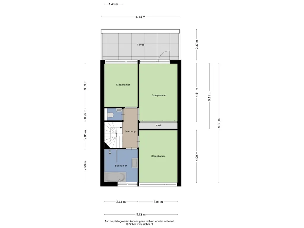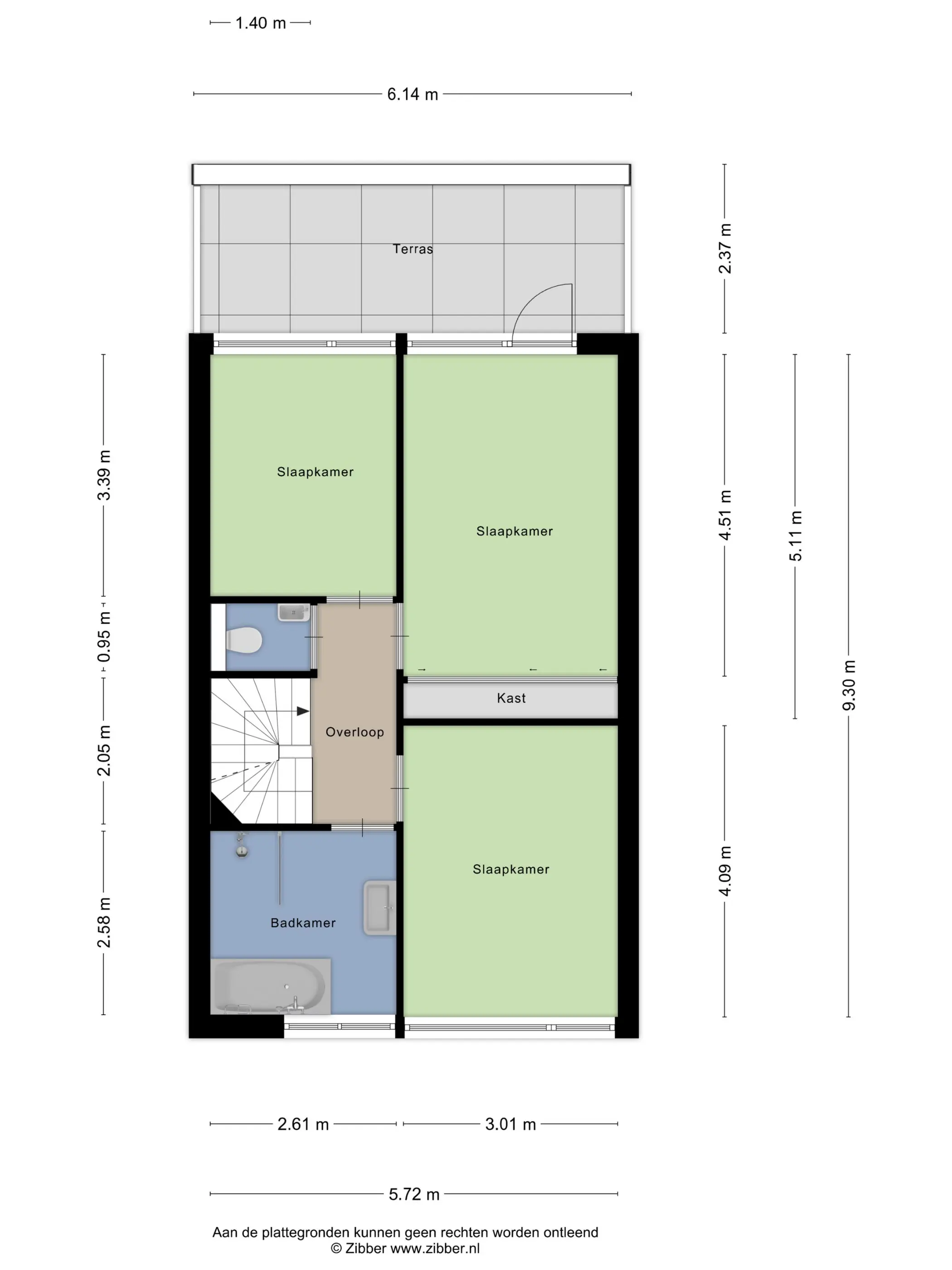 overloop, 2 slaapkamers aan de achterzijde van de woning, waarvan de grootste middels een deur toegang heeft tot het dakterras afm. ca. 6.00 x 2.00. Slaapkamer III bevindt zich aan de voorzijde van de woning.