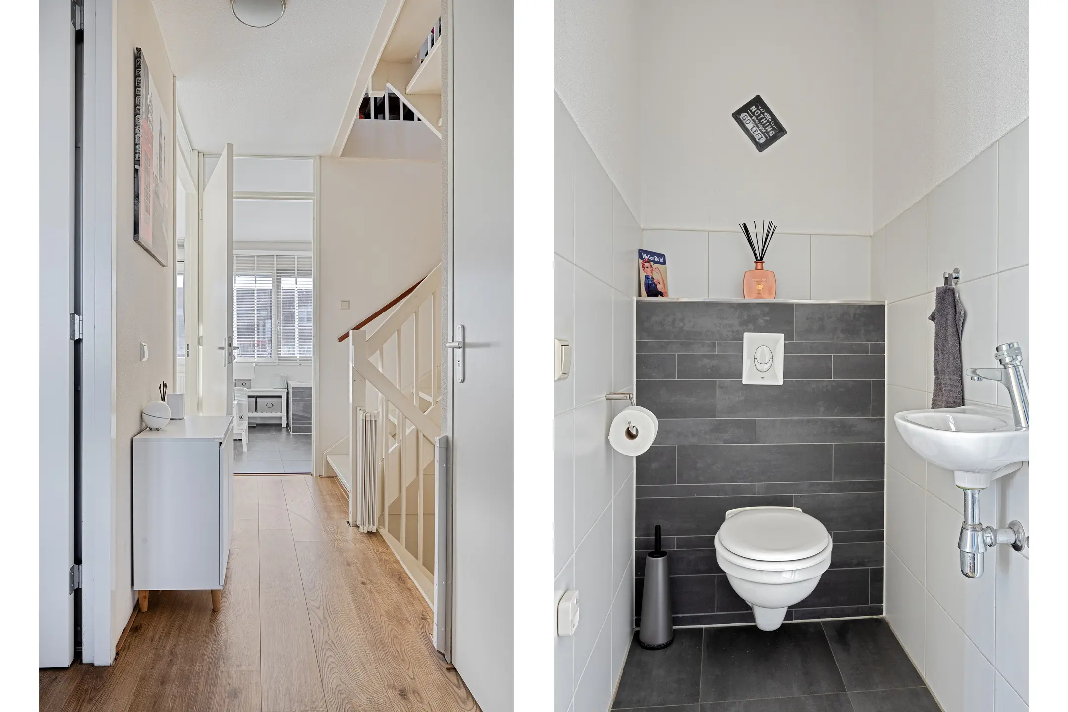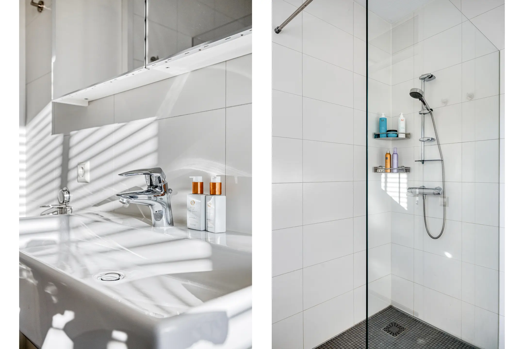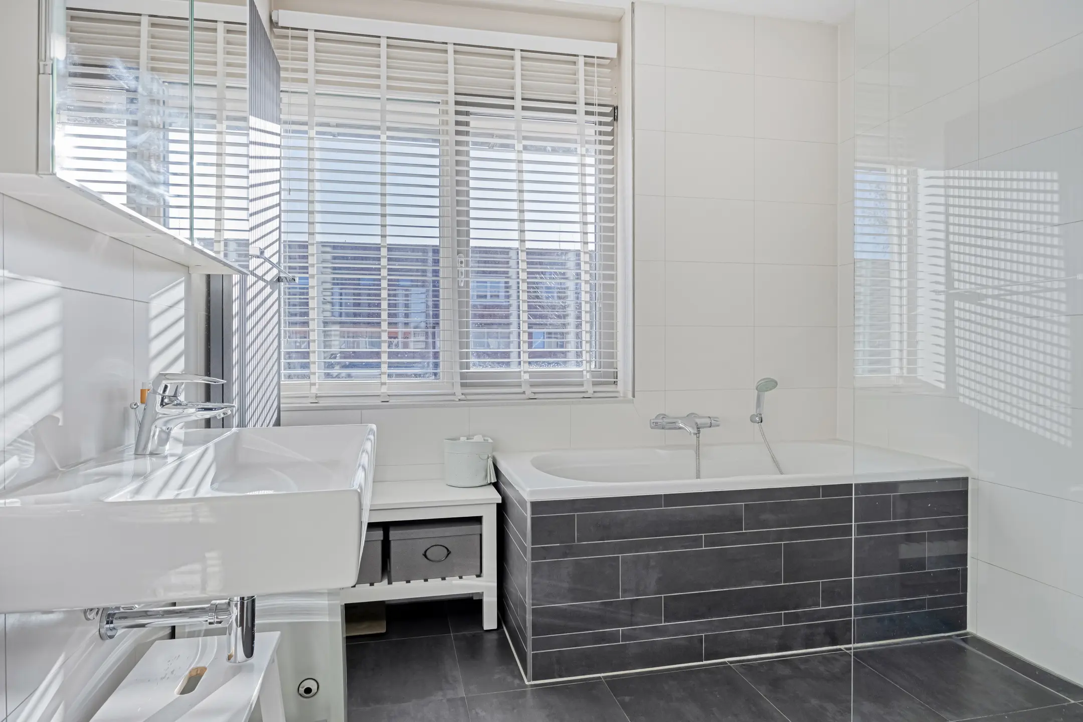 Geheel in wit/grijze kleurstelling betegelde badkamer met inloopdouche en ligbad allebei met thermostaatkraan, wastafel, designradiator en raam dat open kan zodat er naast de mechanische ventilatie ook op een natuurlijke manier geventileerd kan worden. Separate toiletruimte in dezelfde kleurstelling als de badkamer met wandcloset en fonteintje.