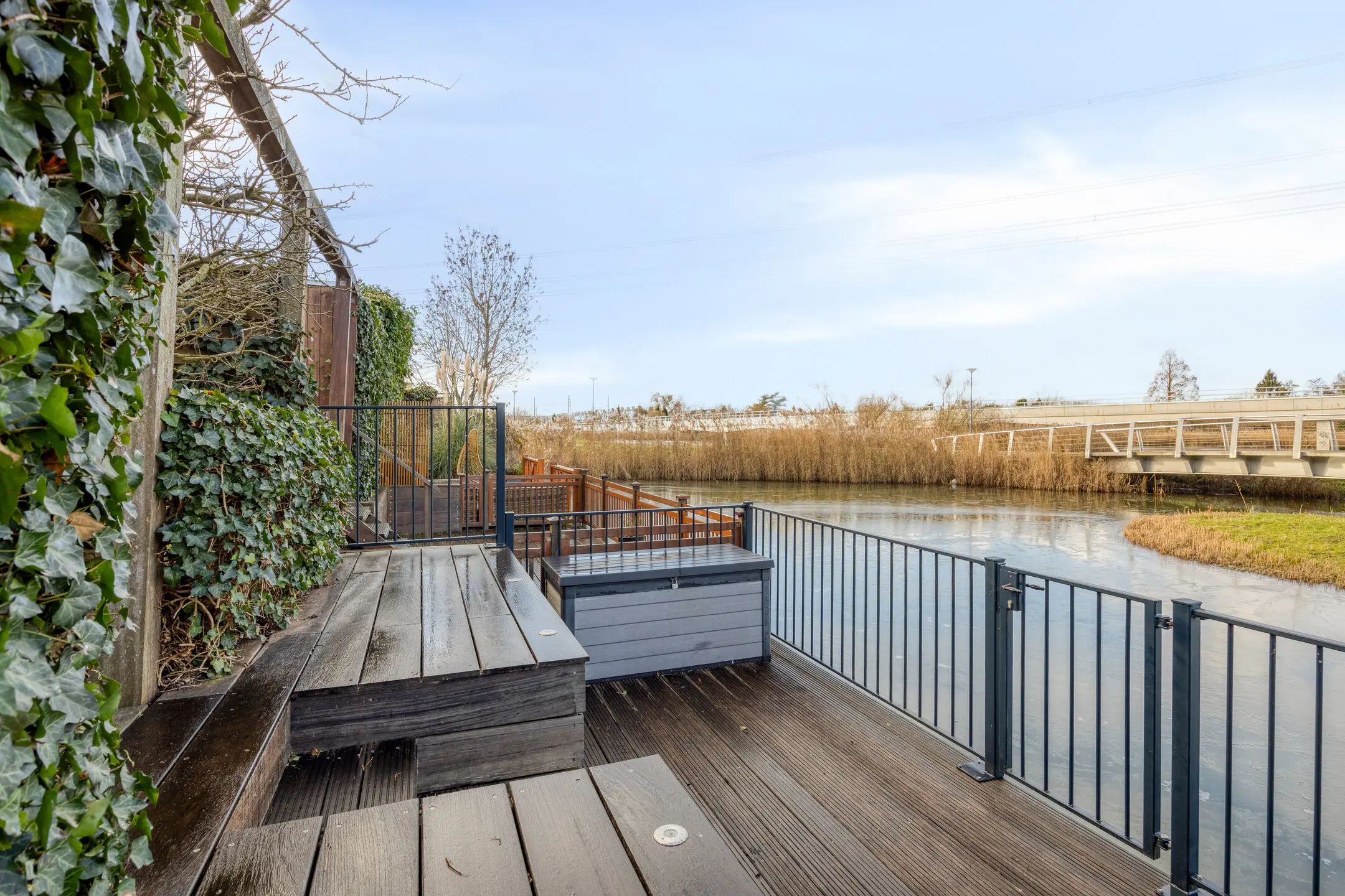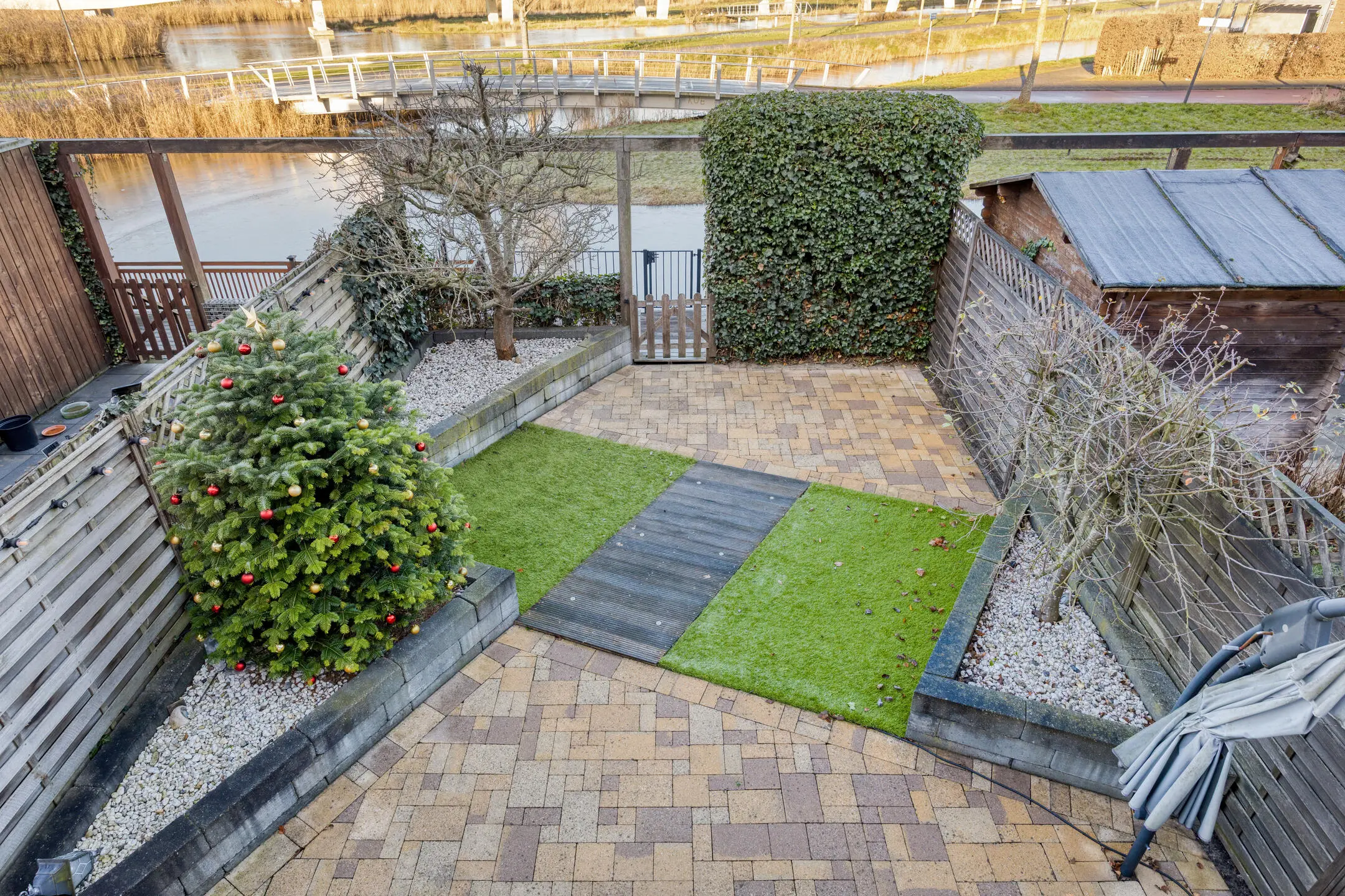 Een ruime onderhoudsvriendelijke voortuin met licht gekleurde betegeling, gelegen op het zuid – oosten met een buitenkraan en een fietsenberging. Diepe achtertuin gelegen op het noord - westen welke fraai diagonaal is aangelegd met verlichting, buitenkraan en een hard houten ruime vlonder aan het water. De achtertuin is gunstig gelegen en biedt zon in de ochtend tot en met zonsondergang.