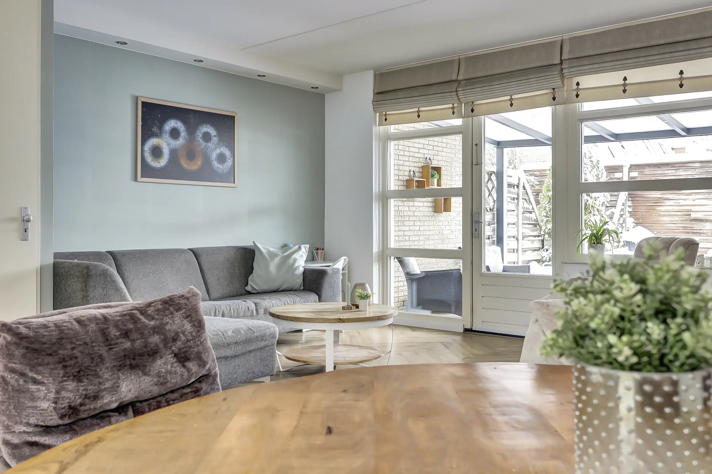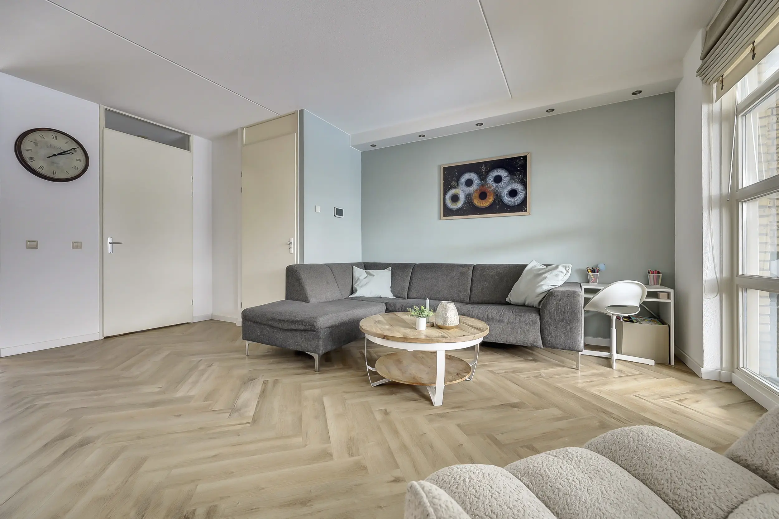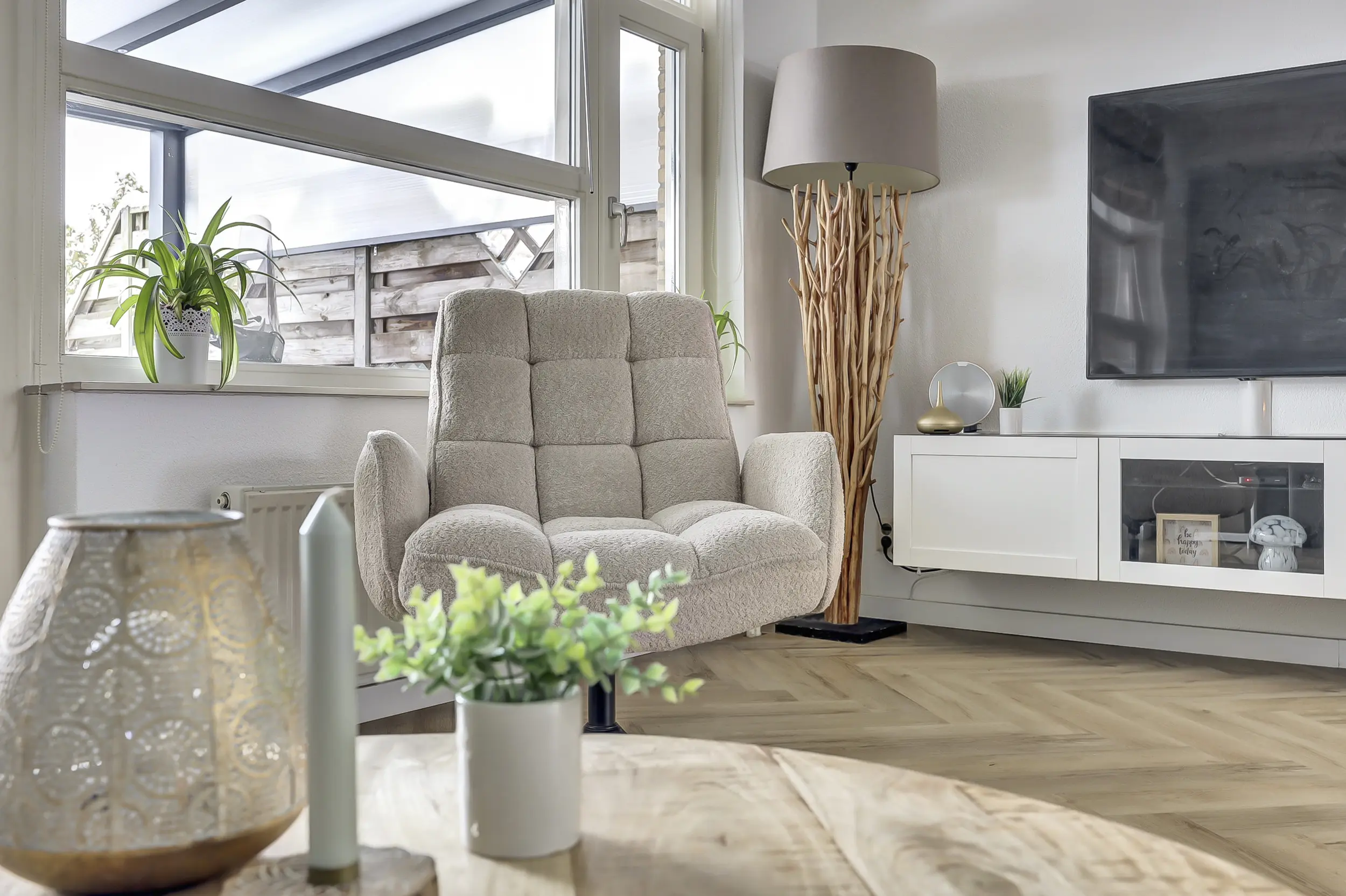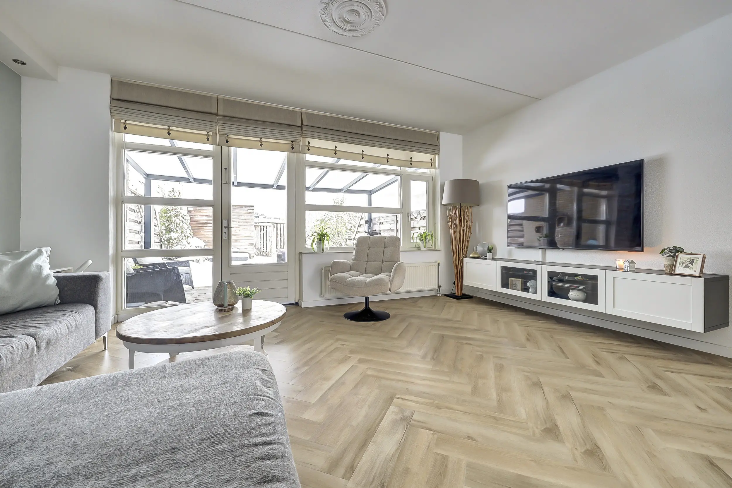 Op de begane grond tref je de ruime woonkamer met visgraat vloer en toegang tot de serre aan de achterzijde.