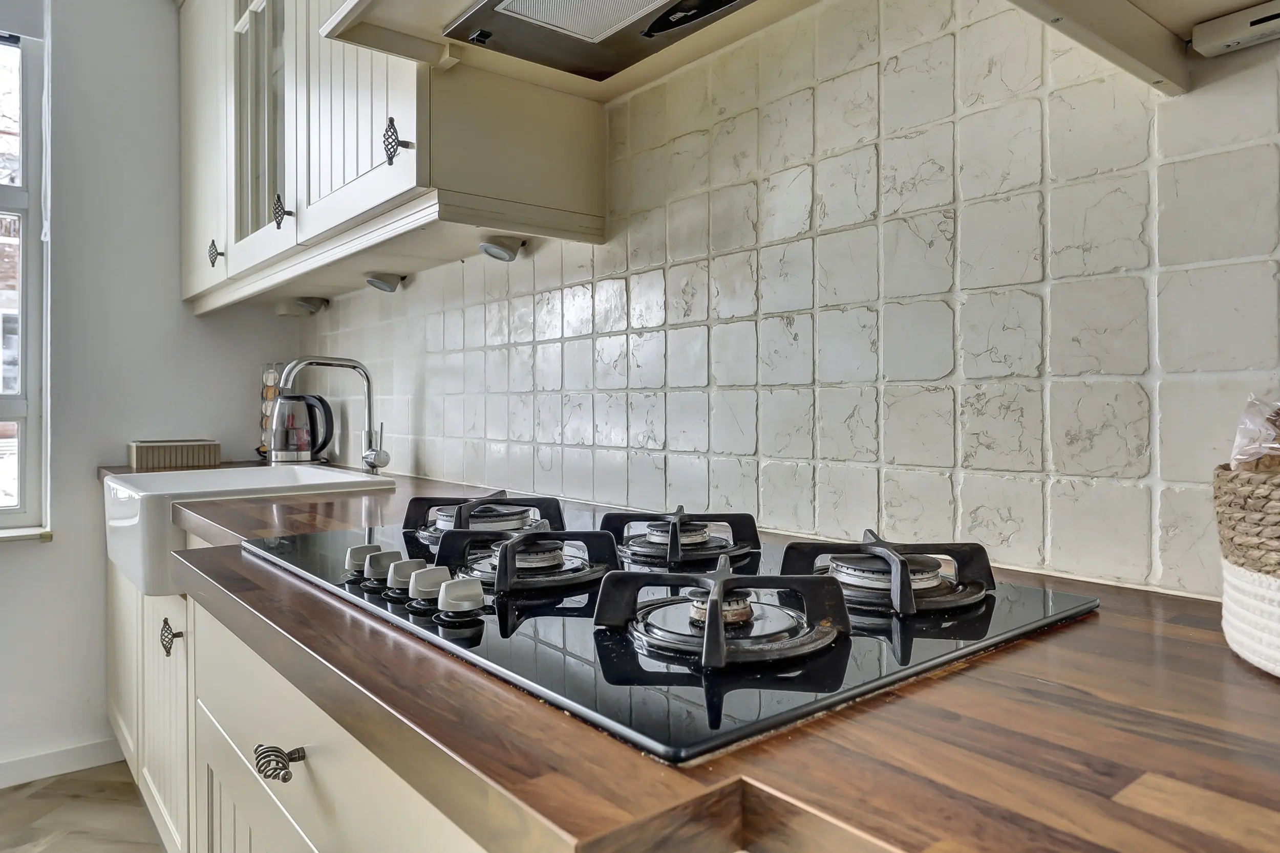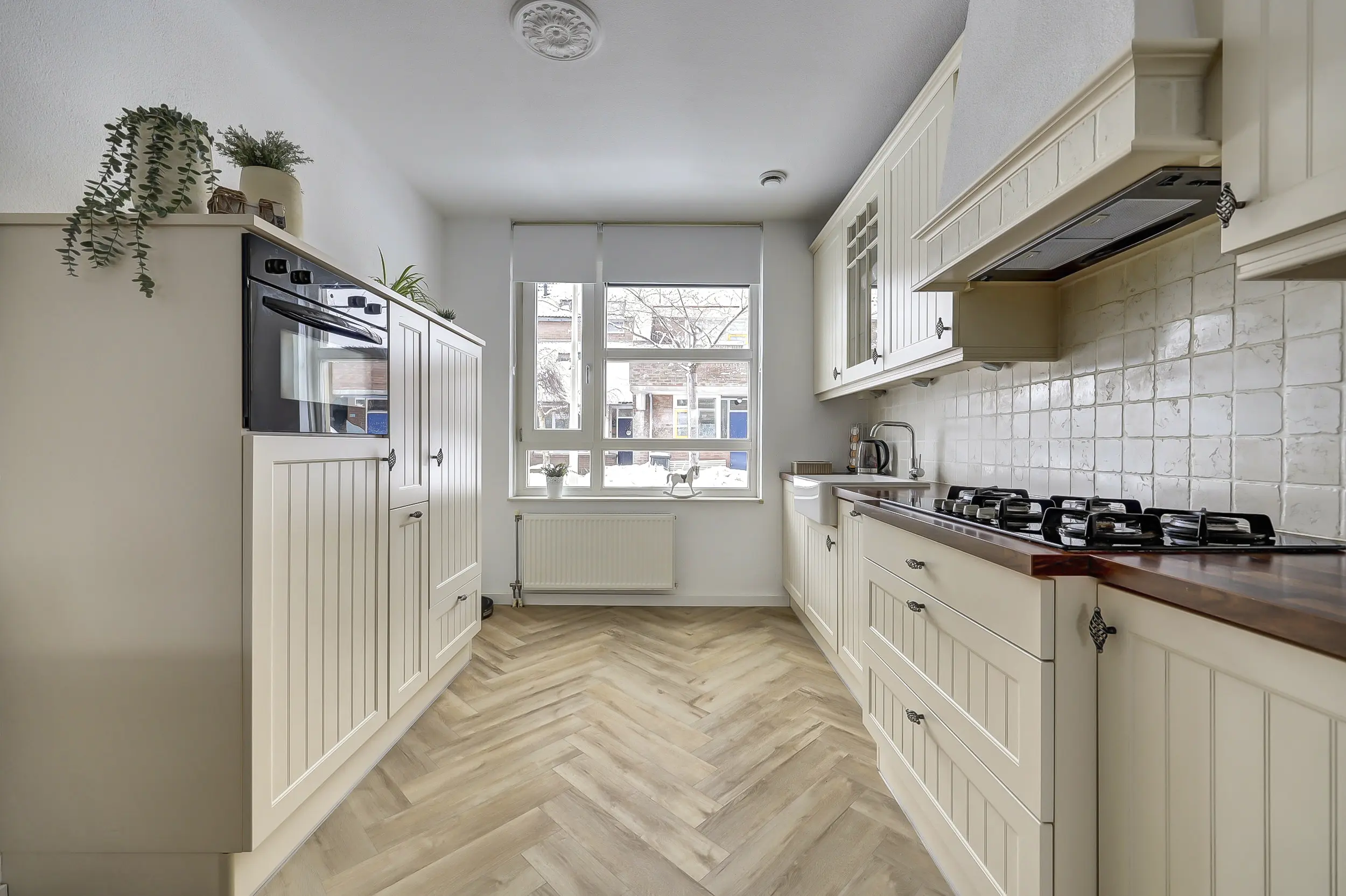 De open keuken aan de voorzijde heeft veel bergruimte en is van alle gemakken voorzien.
