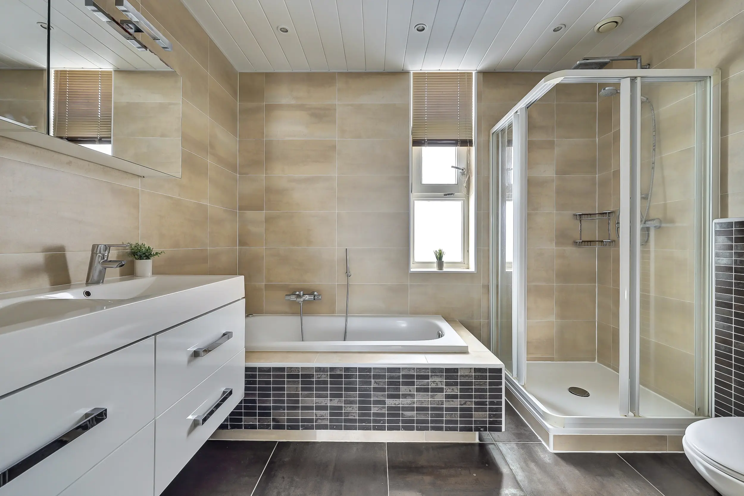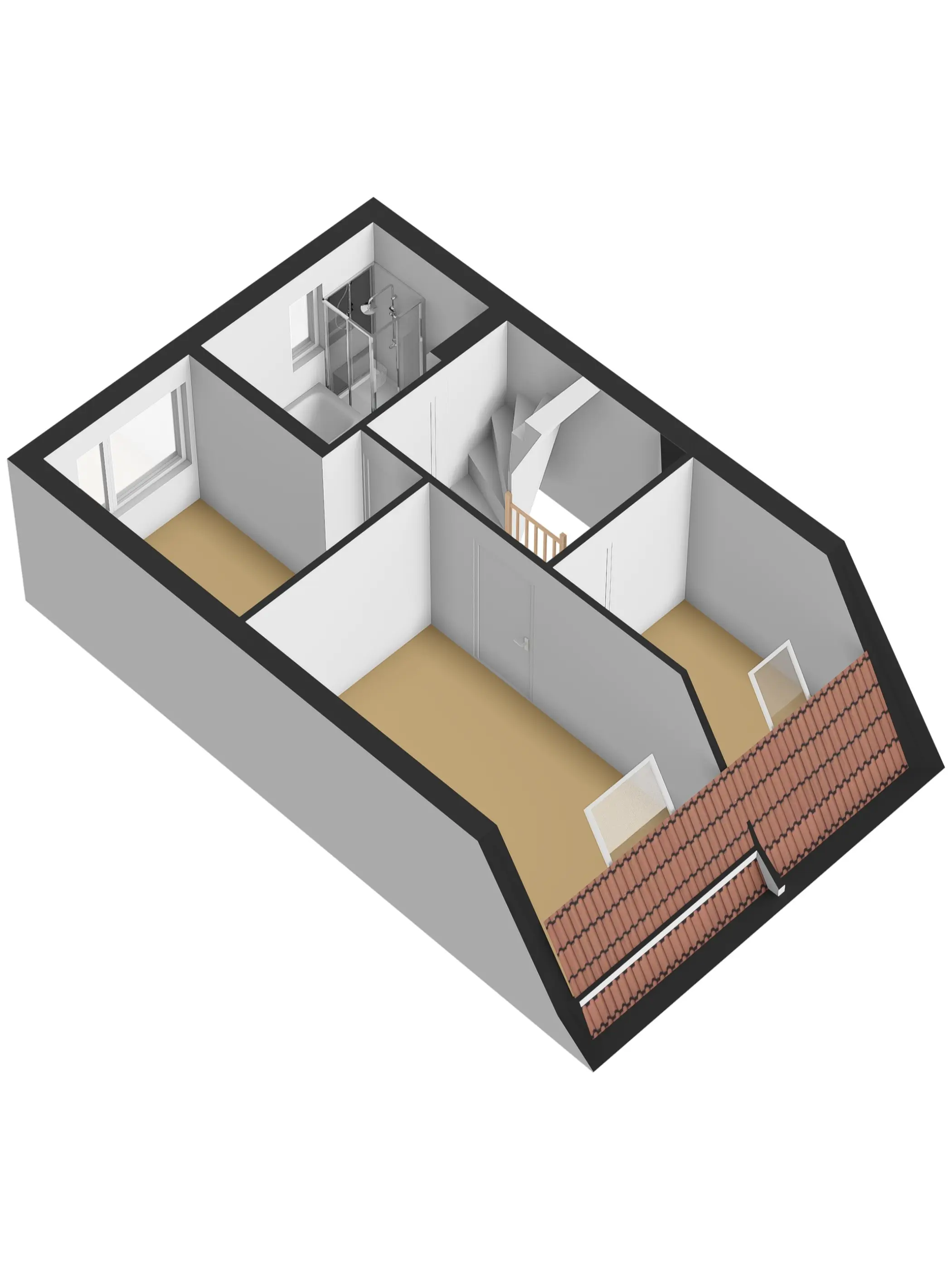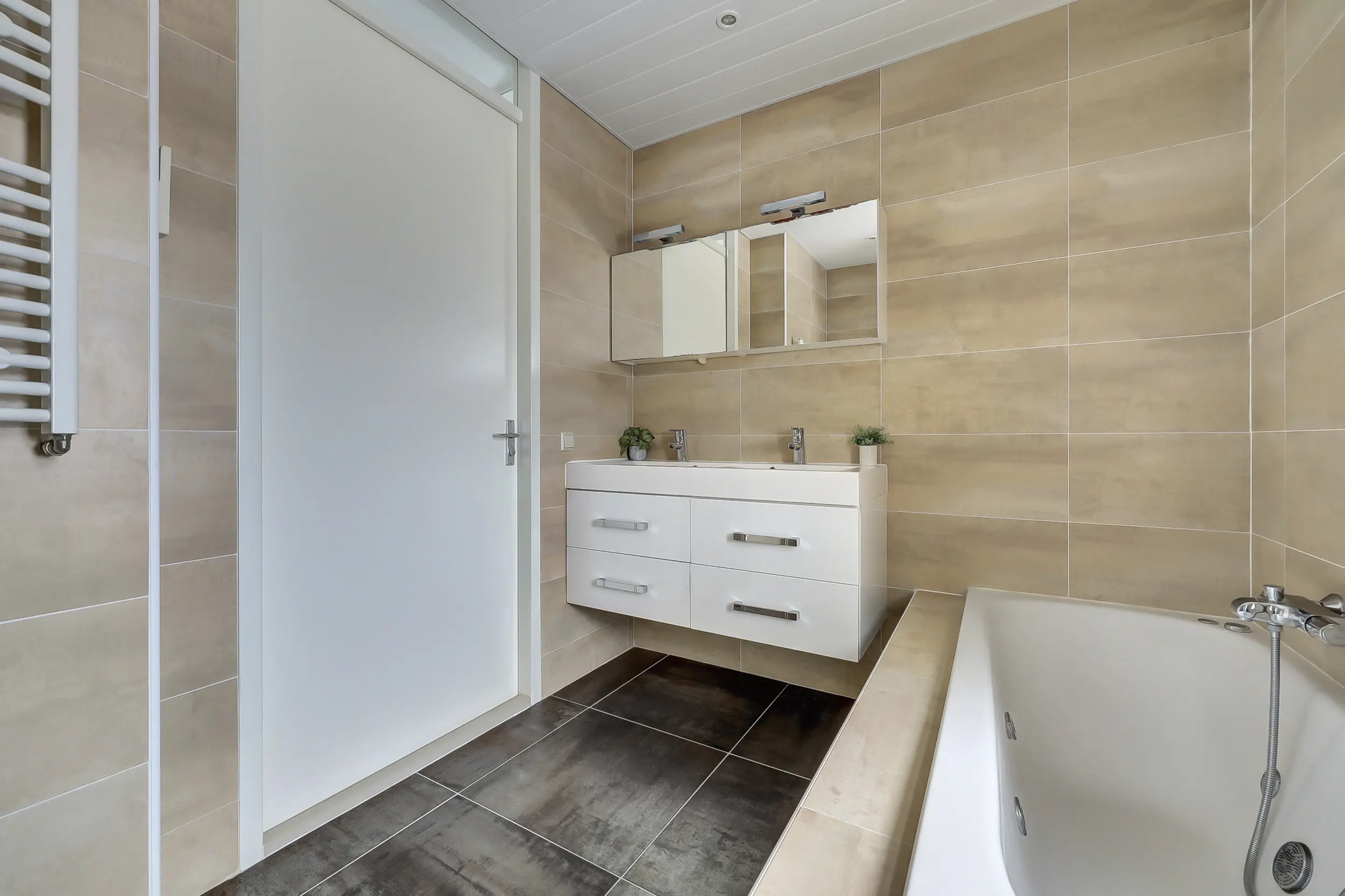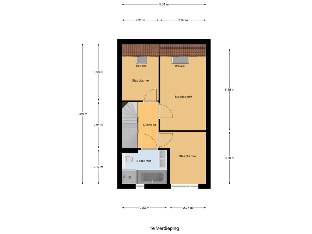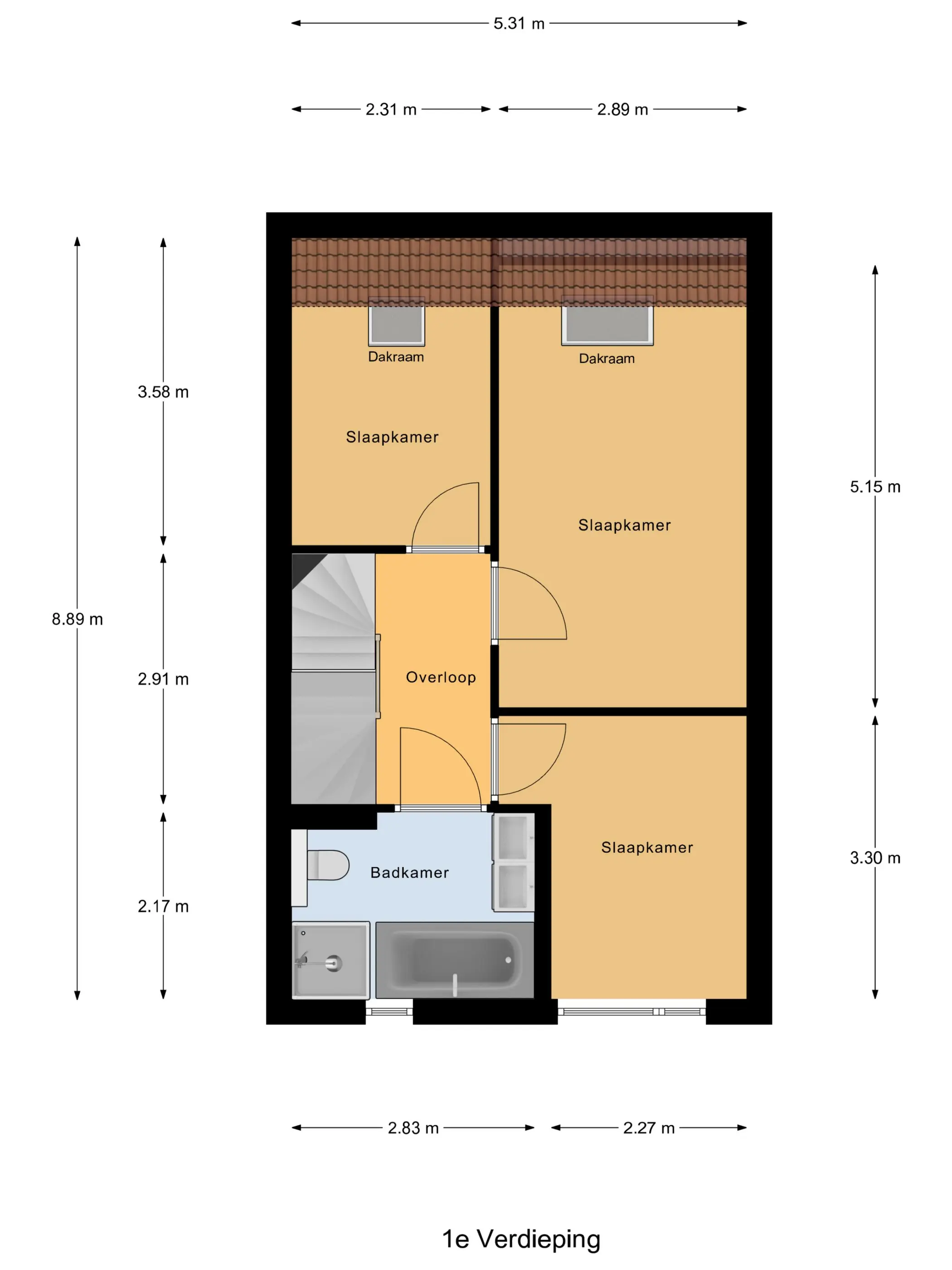 Op de 1e verdieping bevinden zich 3 slaapkamers en een luxe badkamer met een ligbad, toilet, douchecabine en wastafelmeubel.