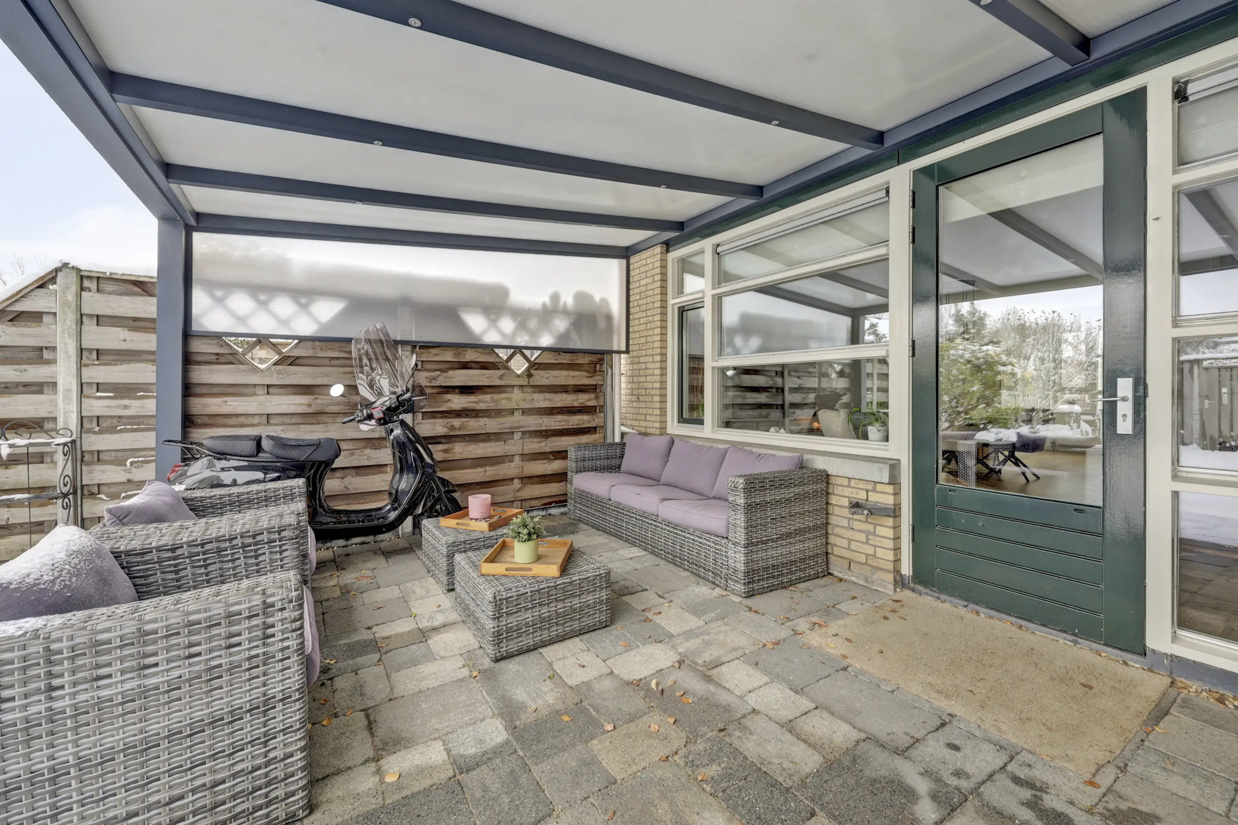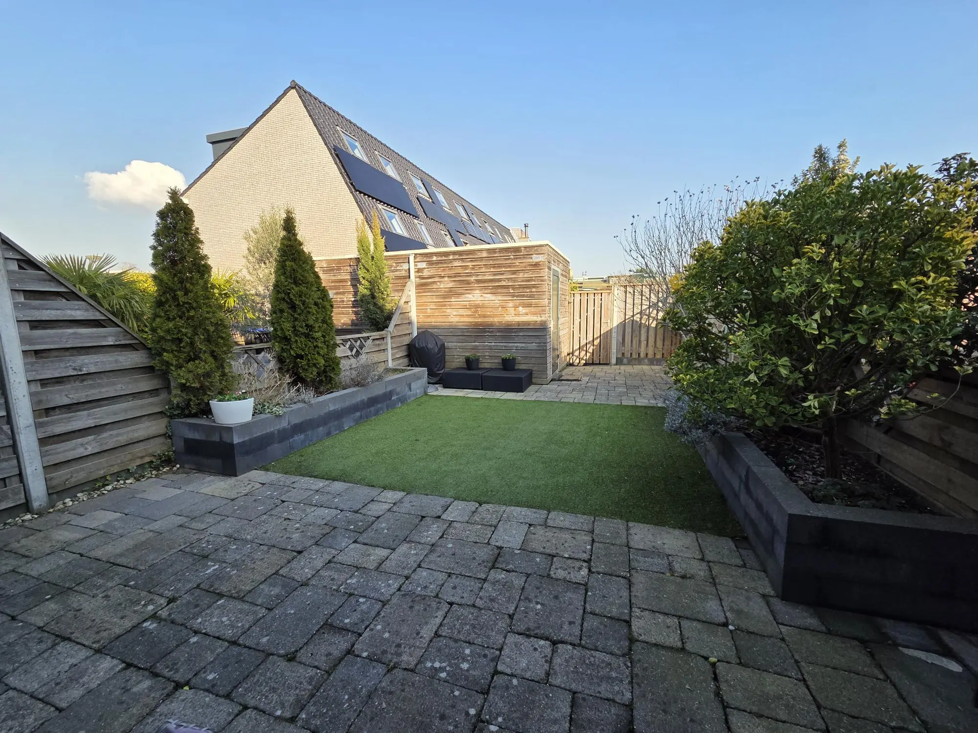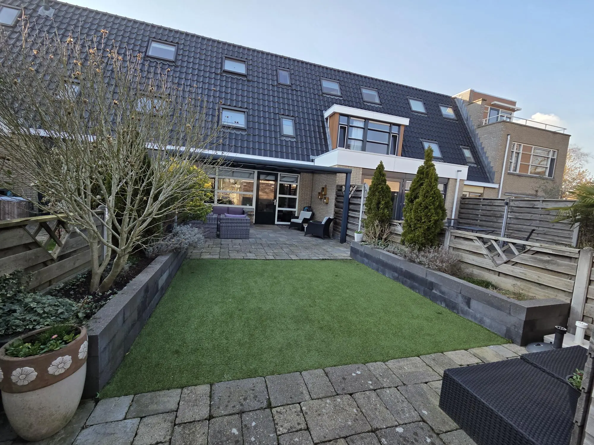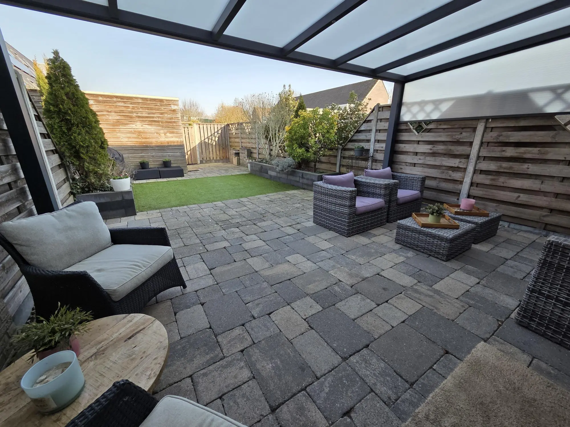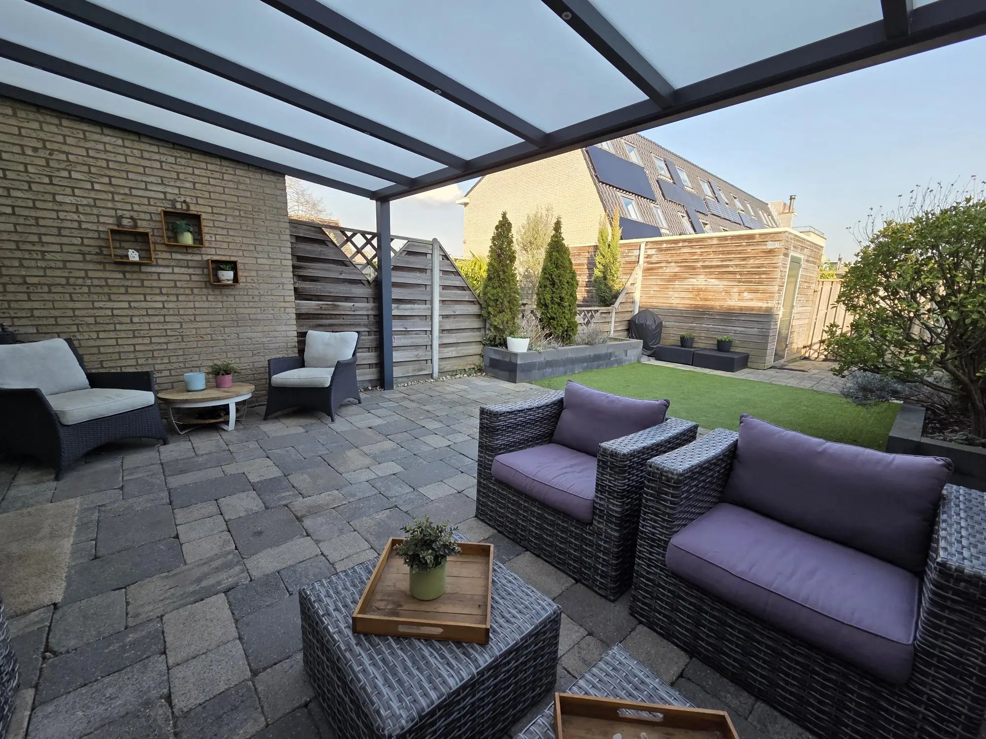 De fraai aangelegde achtertuin is voorzien van een aluminium serre met inbouwverlichting, dit zorgt voor een vergroting van je wooncomfort en is de ideale combinatie van binnen- en buitenruimte.