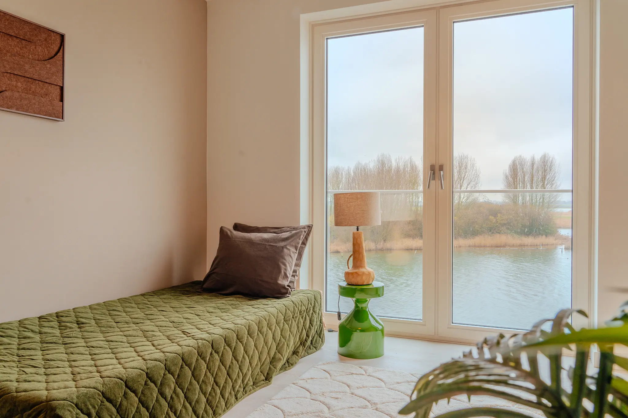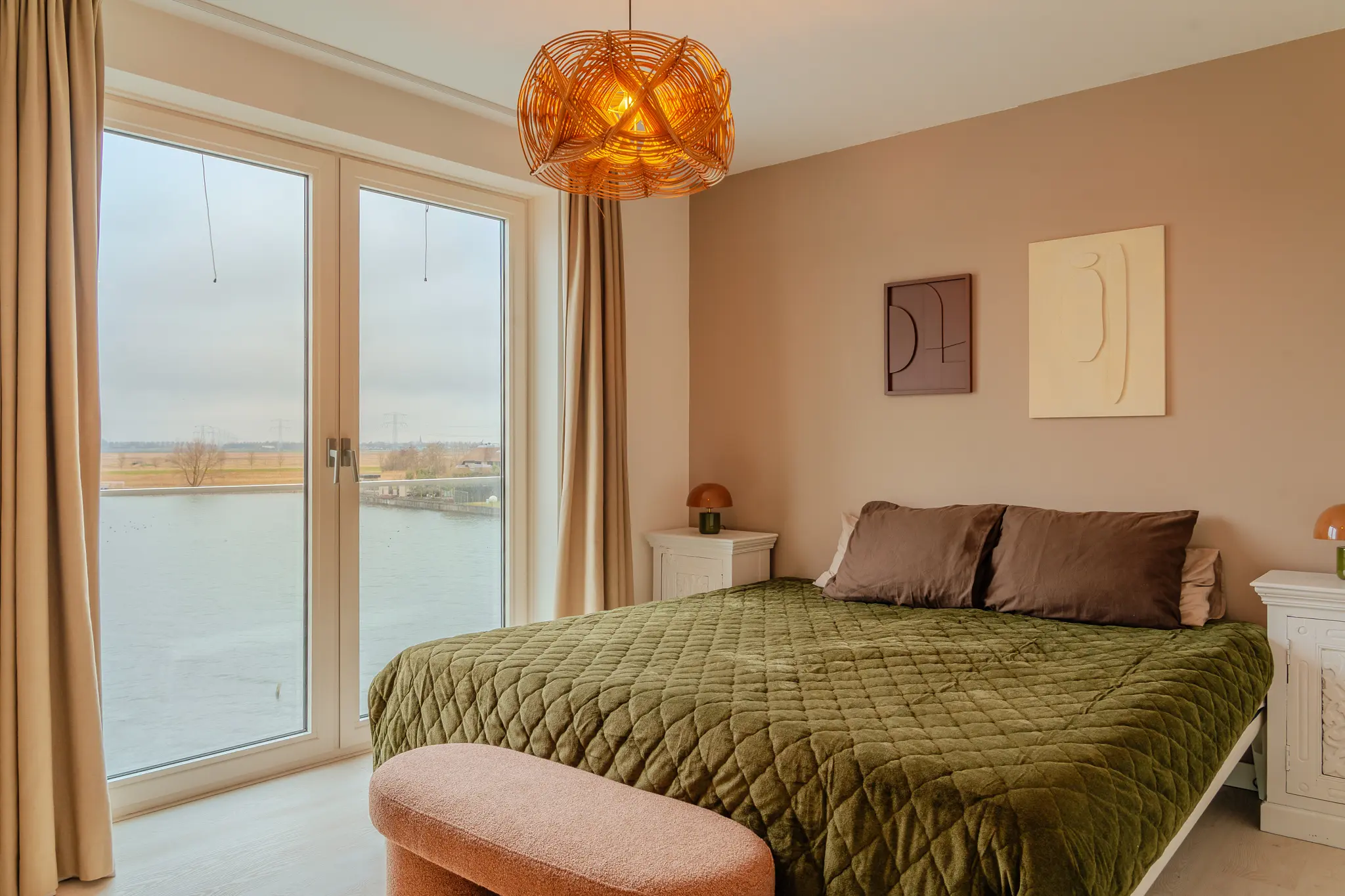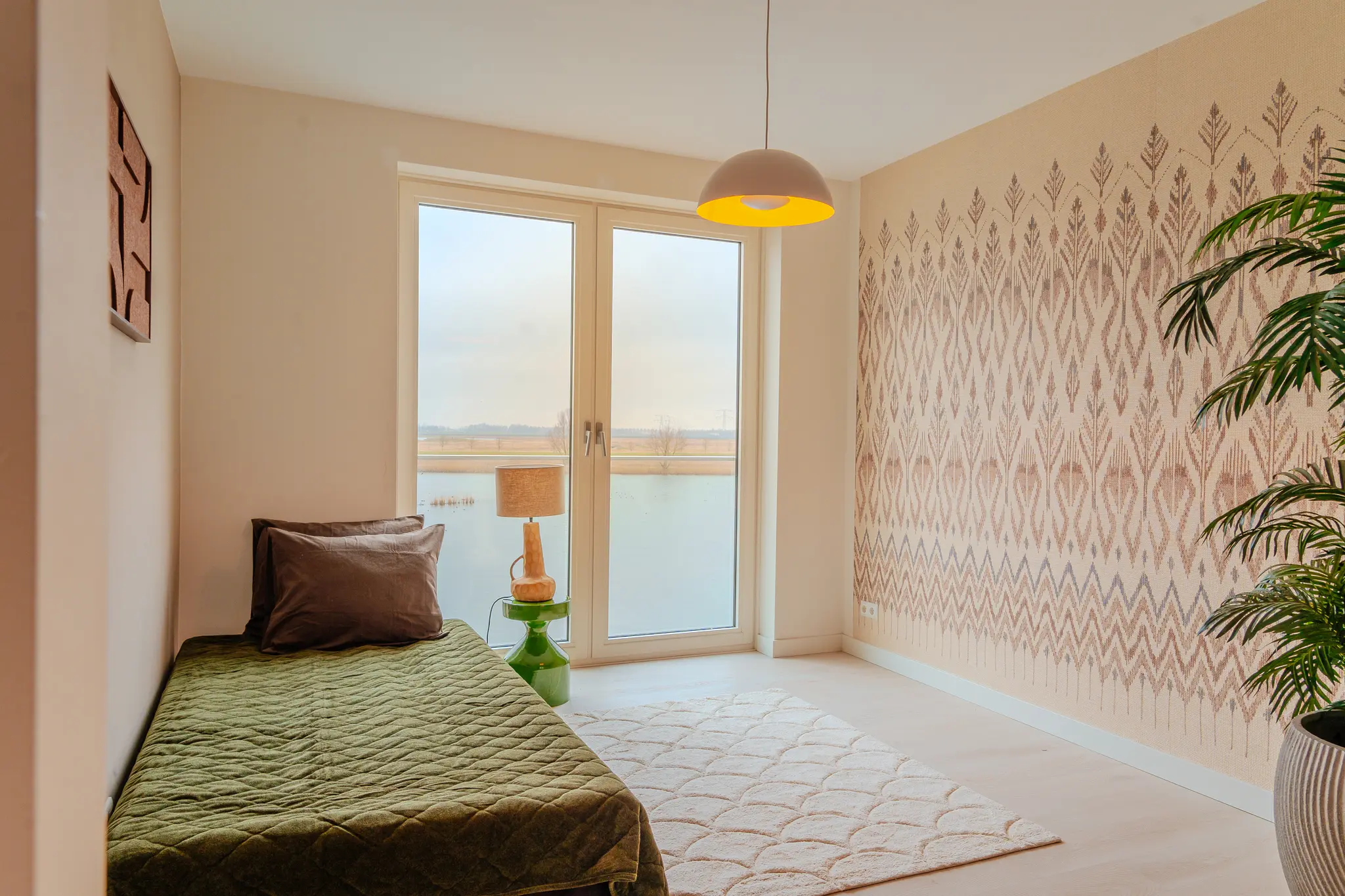 Ook de tweede slaapkamer biedt vrij uitzicht over het polderlandschap en heeft een eigen badkamer met ligbad, wastafelmeubel en designradiator.