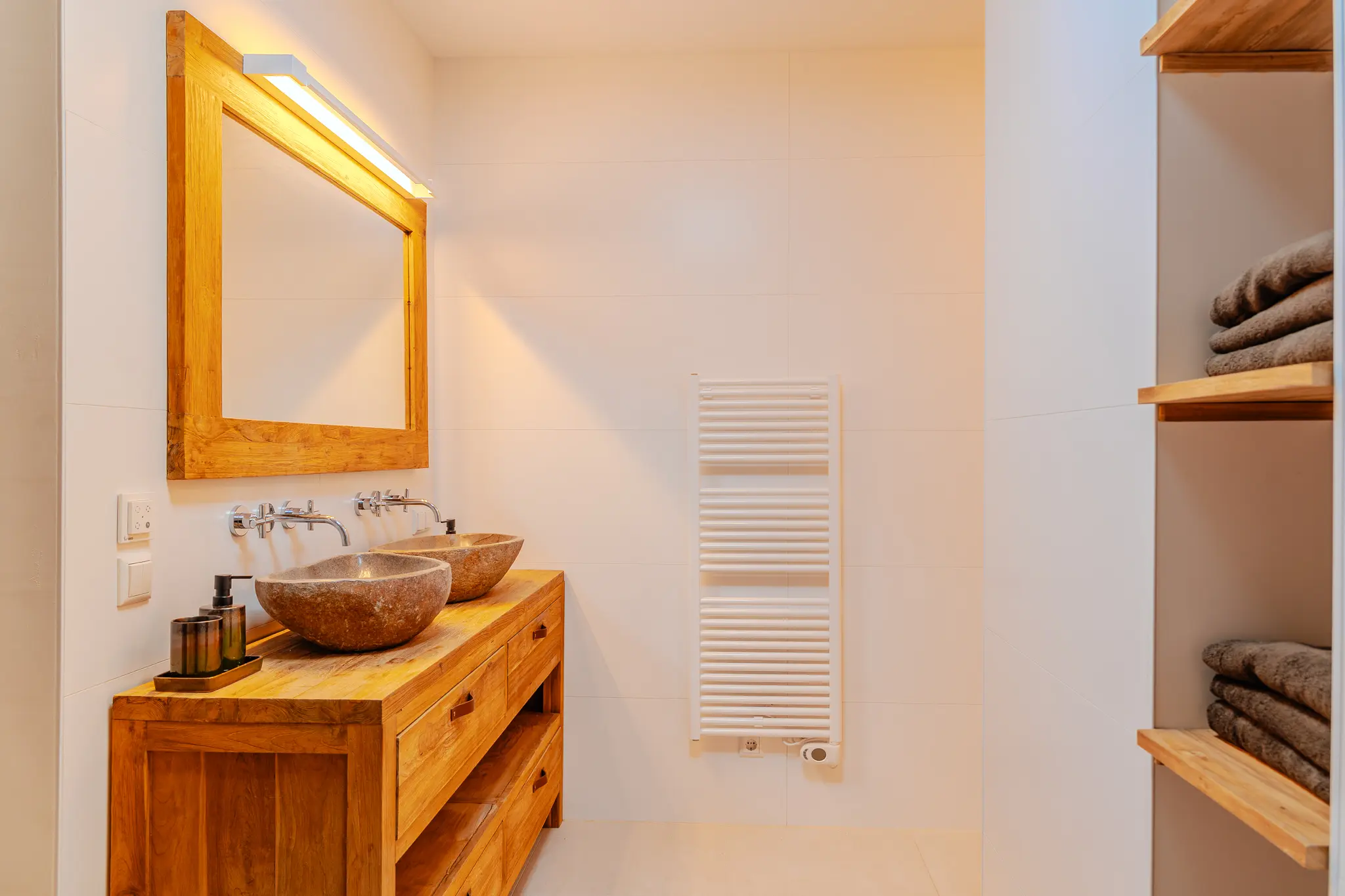 De masterbedroom beschikt over een luxe badkamer met inloopdouche, dubbele wastafel, designradiator en een tweede toilet.