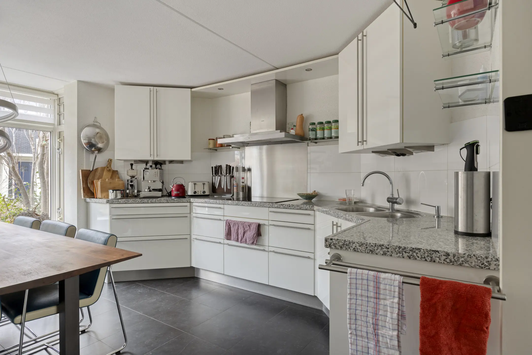 Aan de voorzijde bevindt zich de complete woonkeuken in hoogglans wit, voorzien van diverse inbouwapparatuur, waaronder een gaskookplaat, RVS-afzuigkap, combimagnetron en oven, vaatwasser, koelkast en vriezer