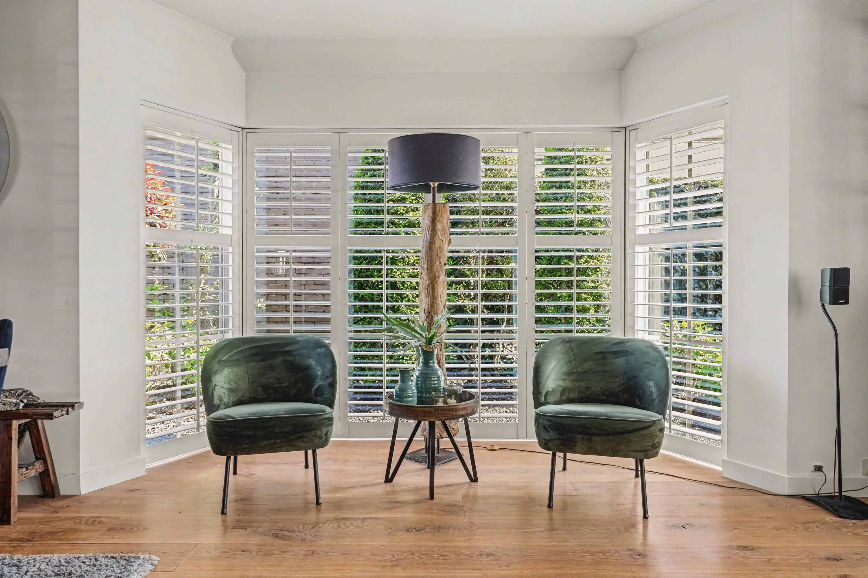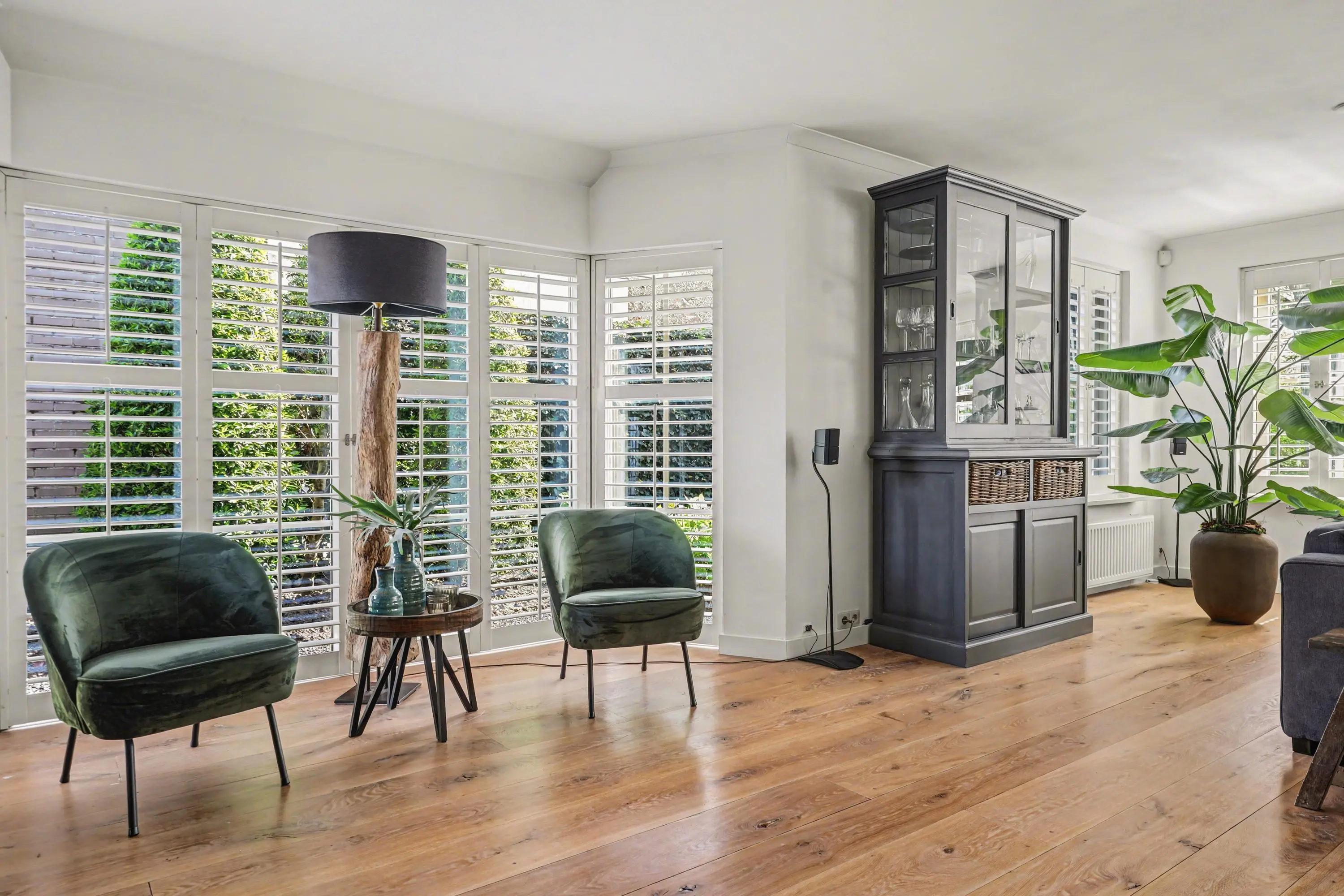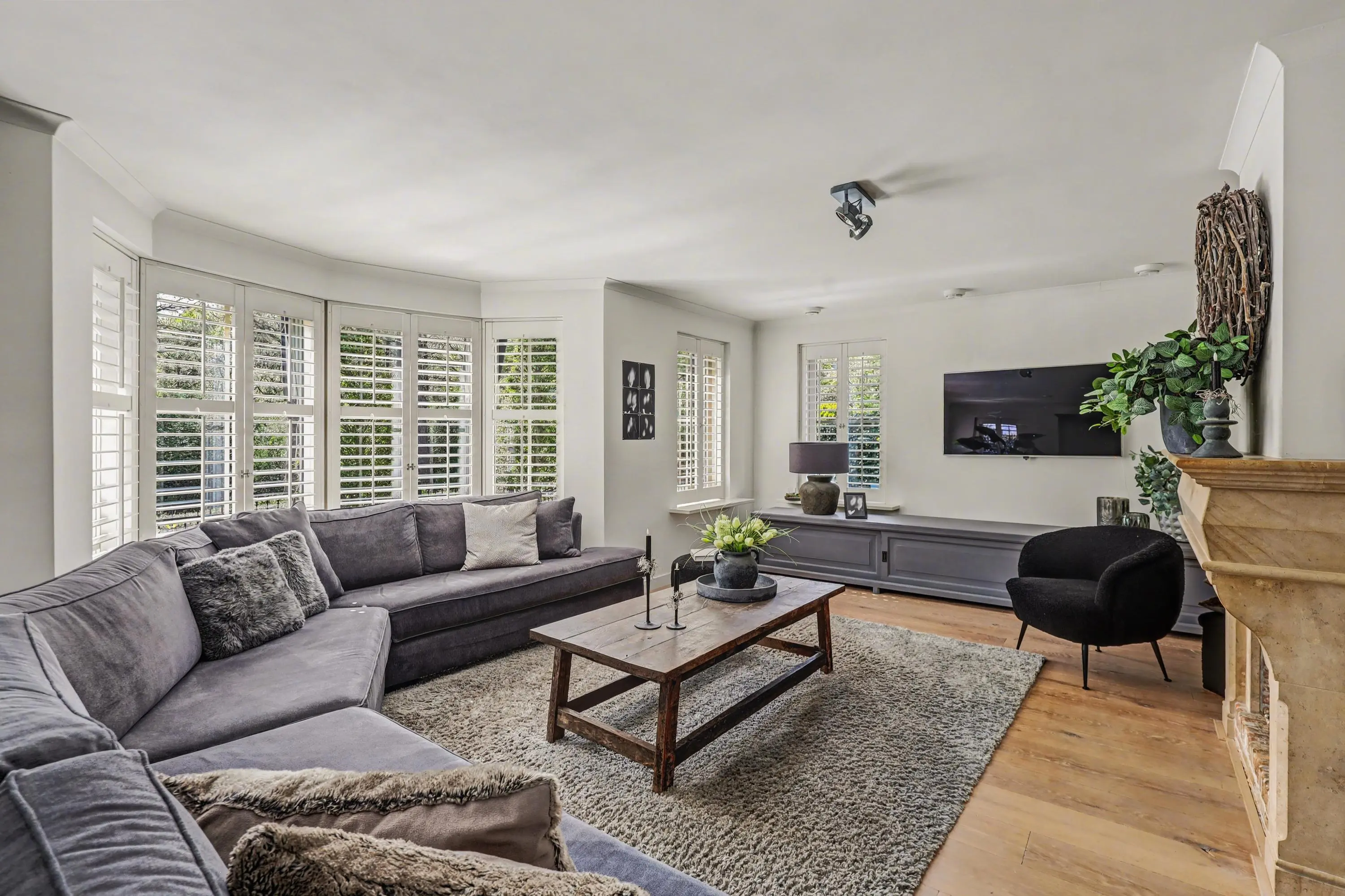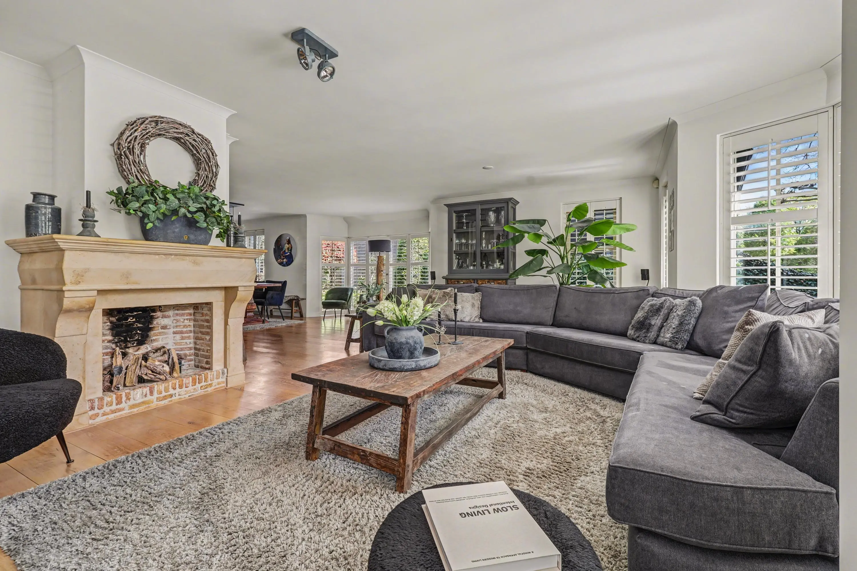De ruim opgezette woonkamer met open haard heeft veel lichtinval door de raampartijen rondom, alle ramen in het woon- en eetgedeelte zijn afgewerkt met op maat gemaakte shutters.
