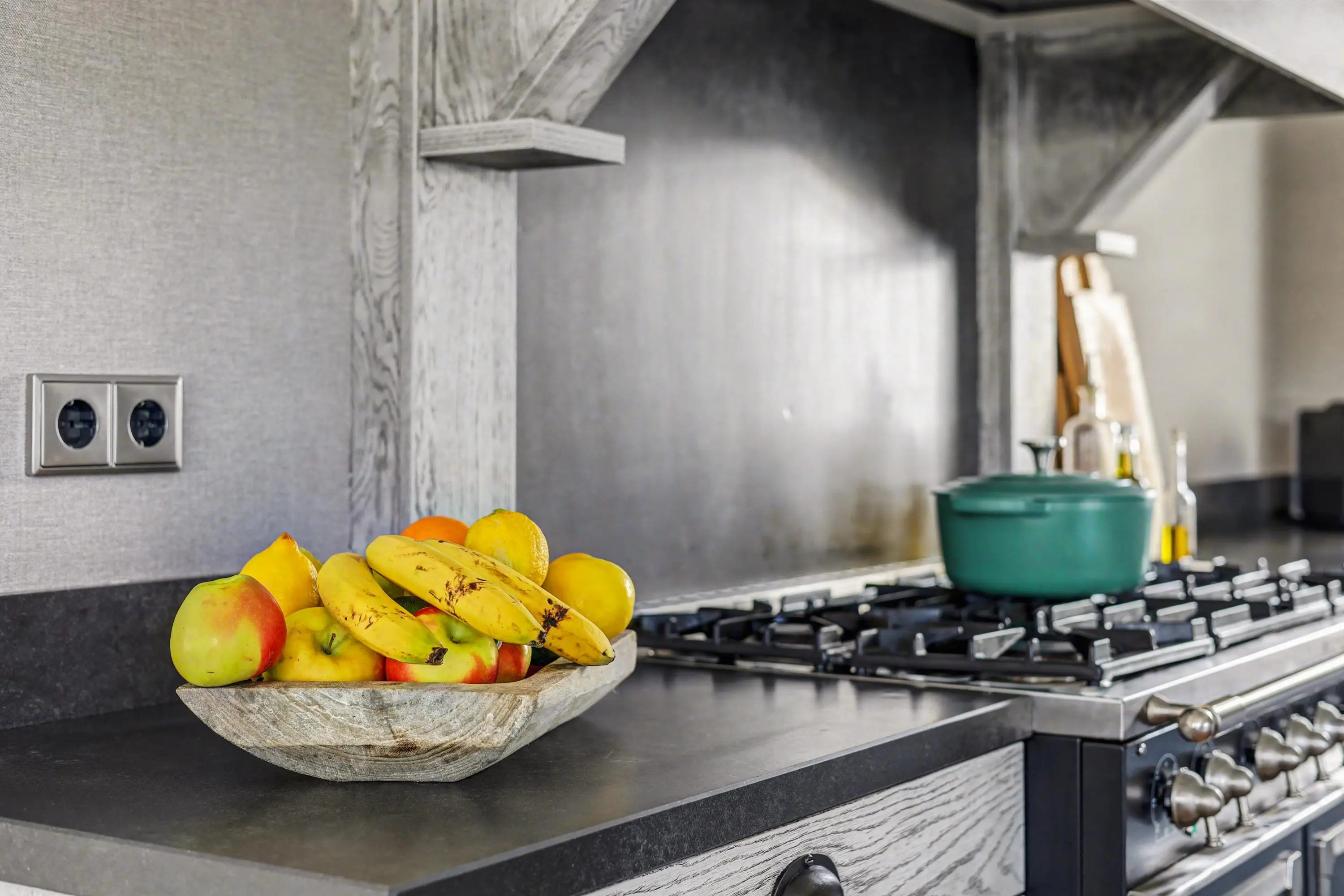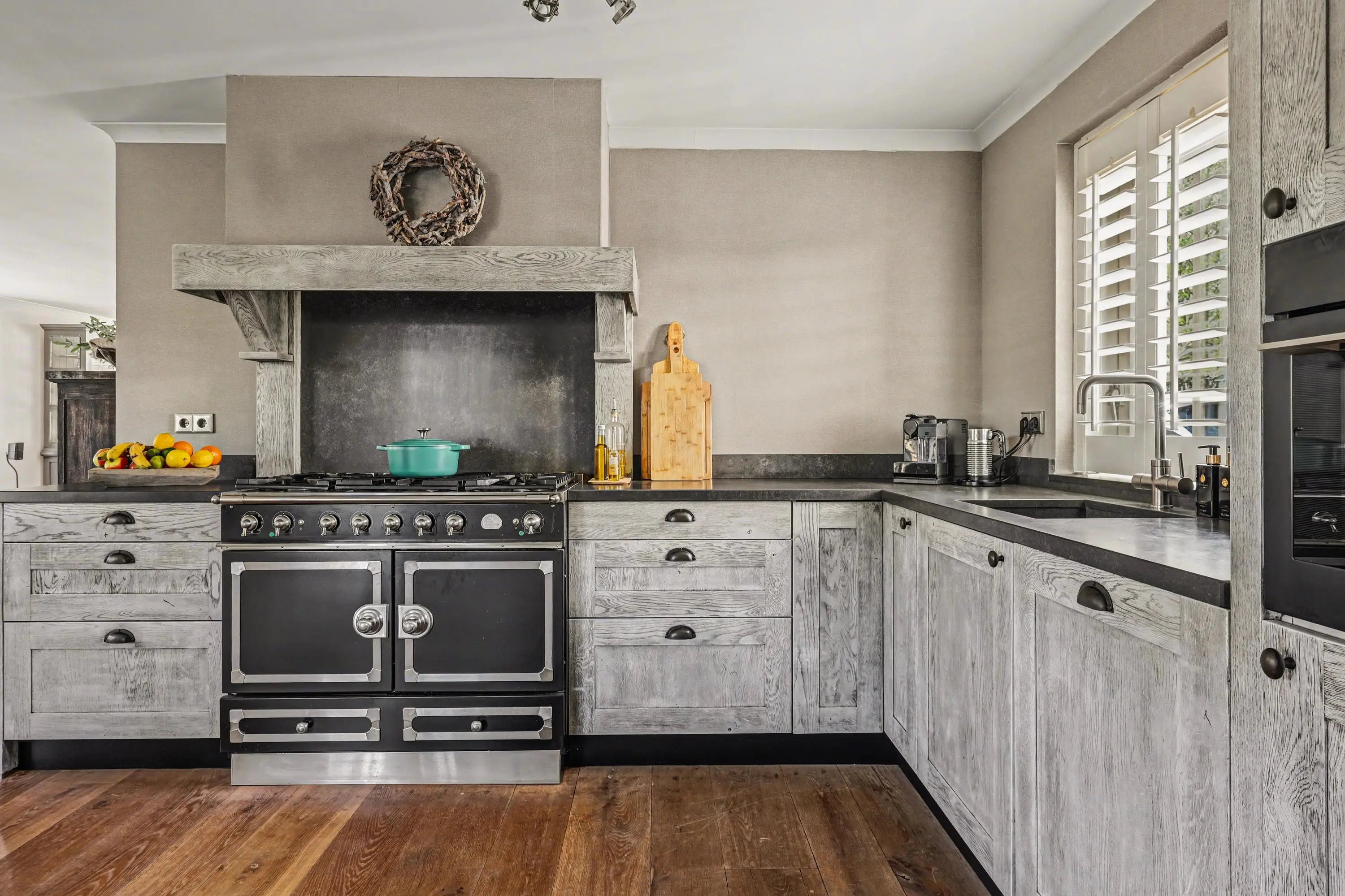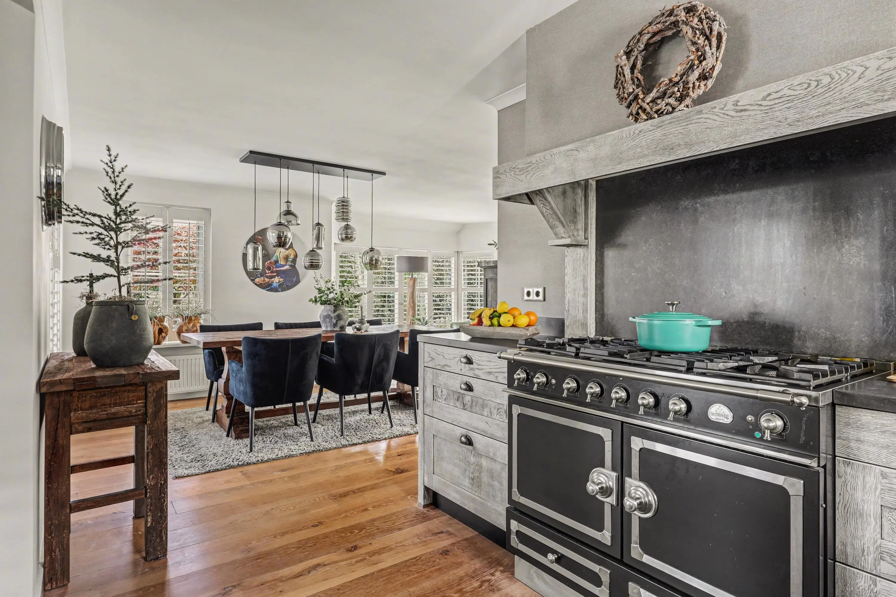 De open keuken ademt kwaliteit en is uitgevoerd met apparatuur als Quooker, vaatwasser, oven, koelkast en vriezer. Natuurlijk mogen we de de Rolls Royce onder de fornuizen niet vergeten: een La Cornue met dubbele oven en 5 branders. Hier waant elke zichzelf respecterende thuiskok zich in het paradijs!