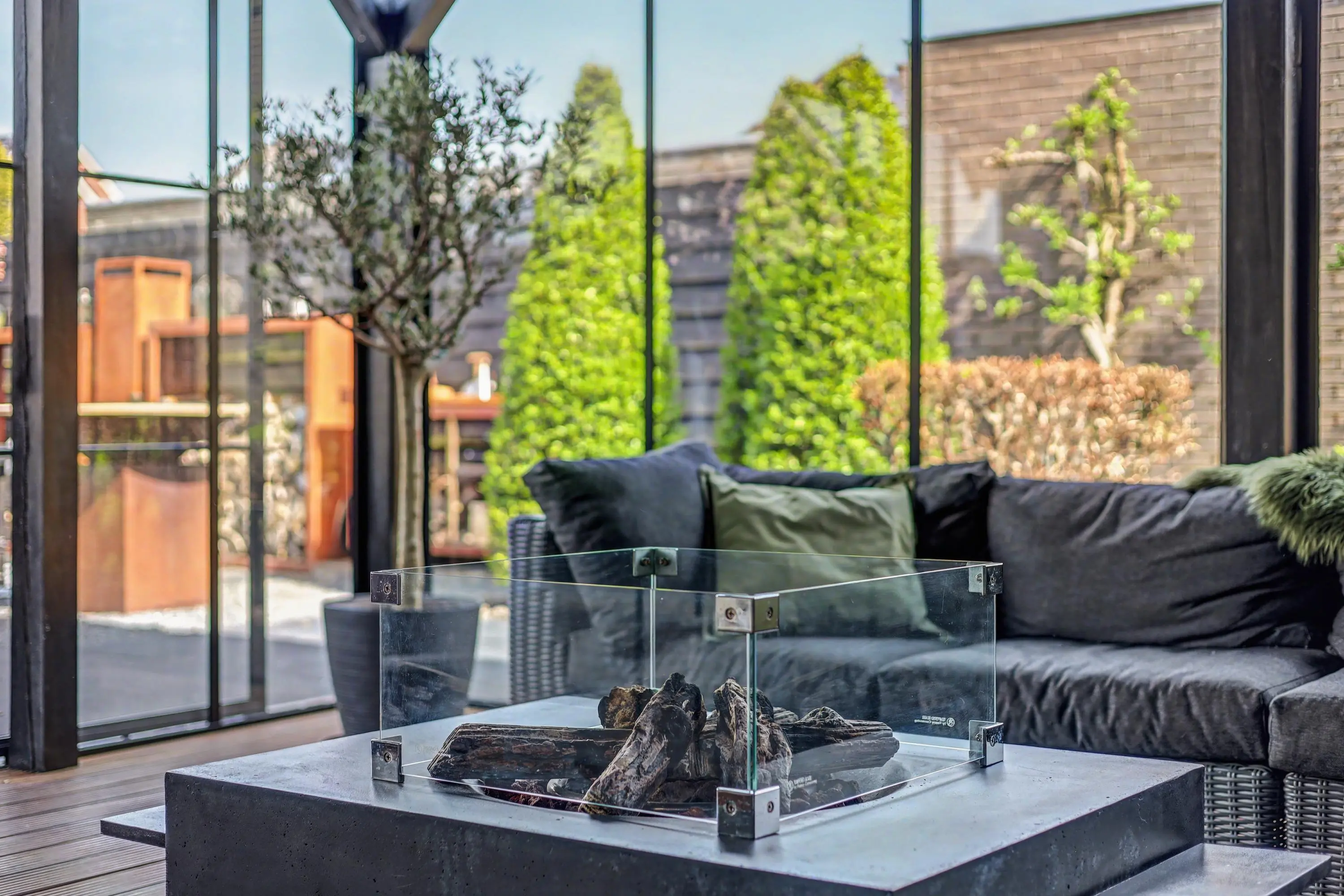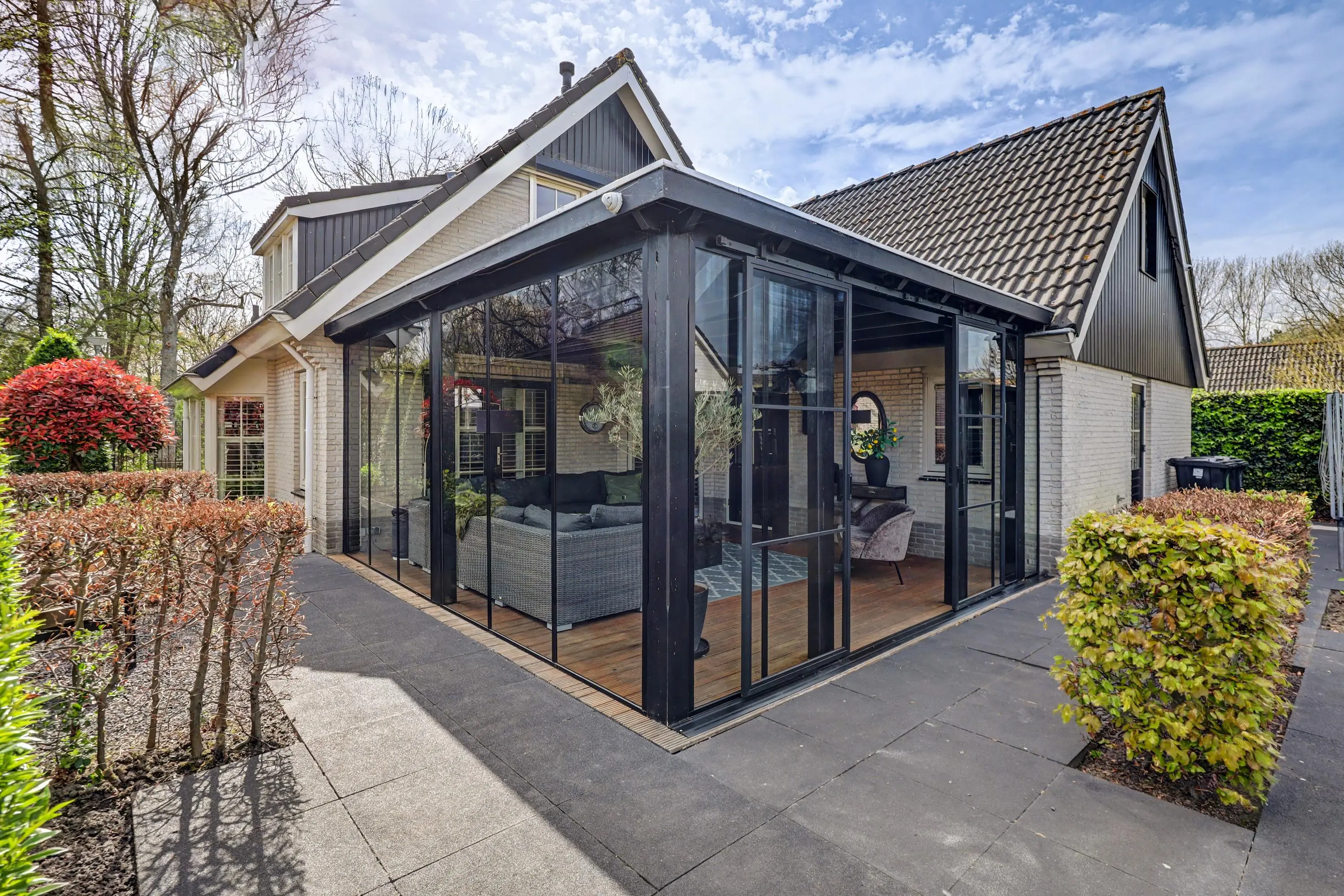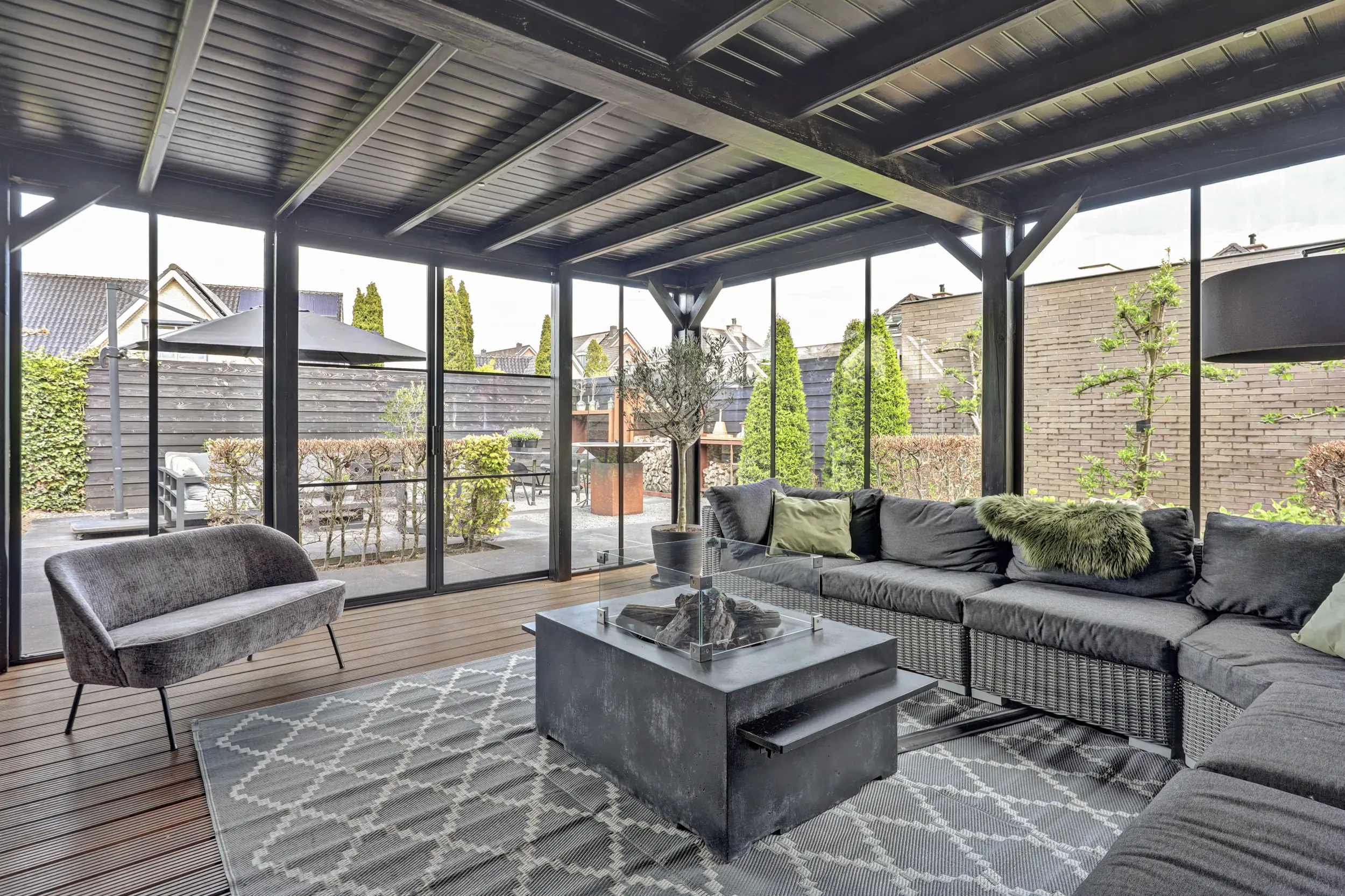 - Fraaie tuin rondom met overkapping voorzien van glazen schuifwanden.