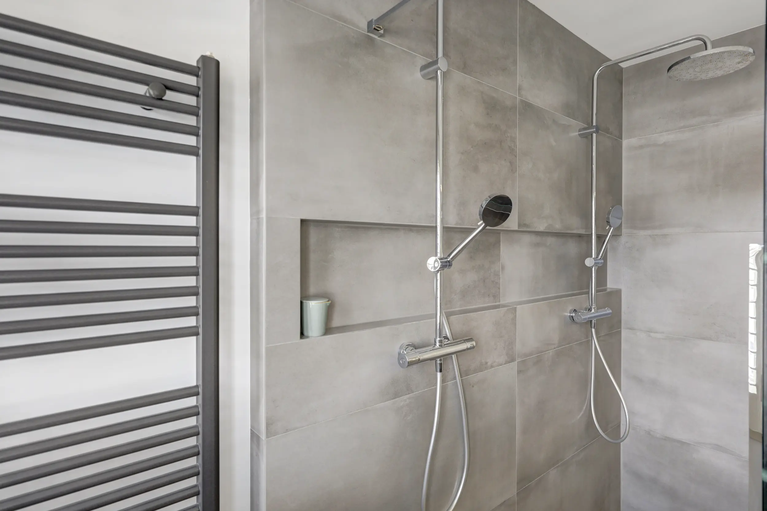 De badkamer voldoet aan alle wensen: een ruime glazen inloopdouche met dubbele stort- en handdouche, dubbel wastafelmeubel met strakke lijnen en in de muur geïntegreerde kranen, 2e toilet, radiator en fraai tegelwerk.