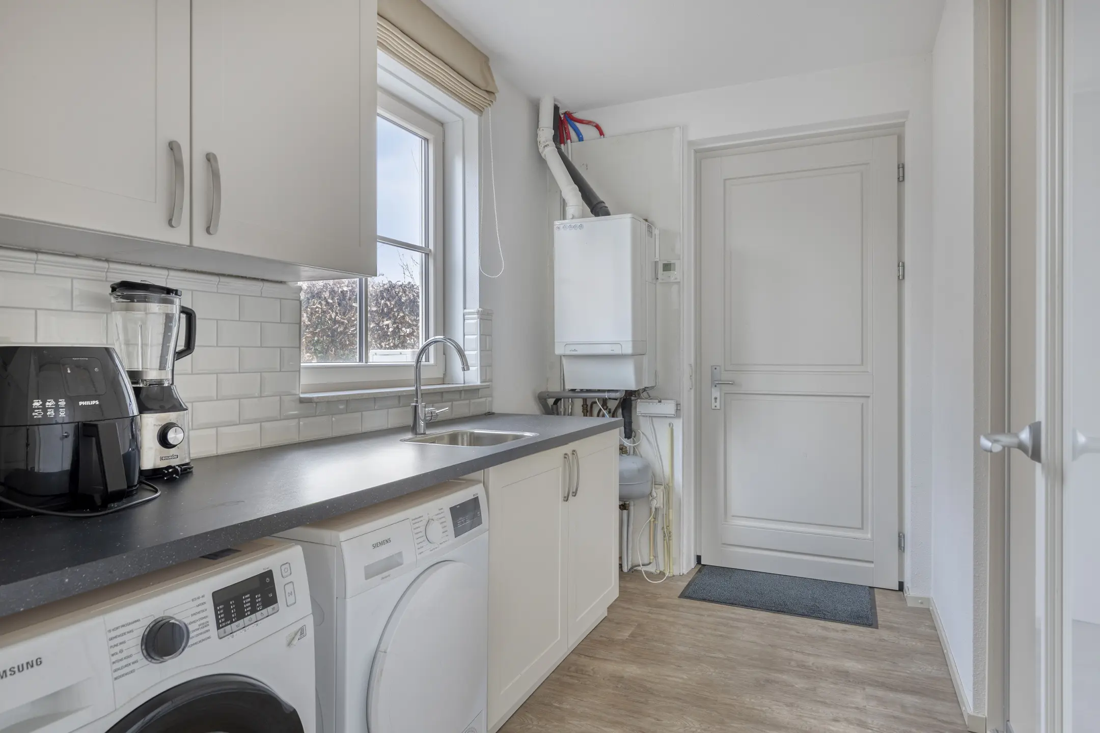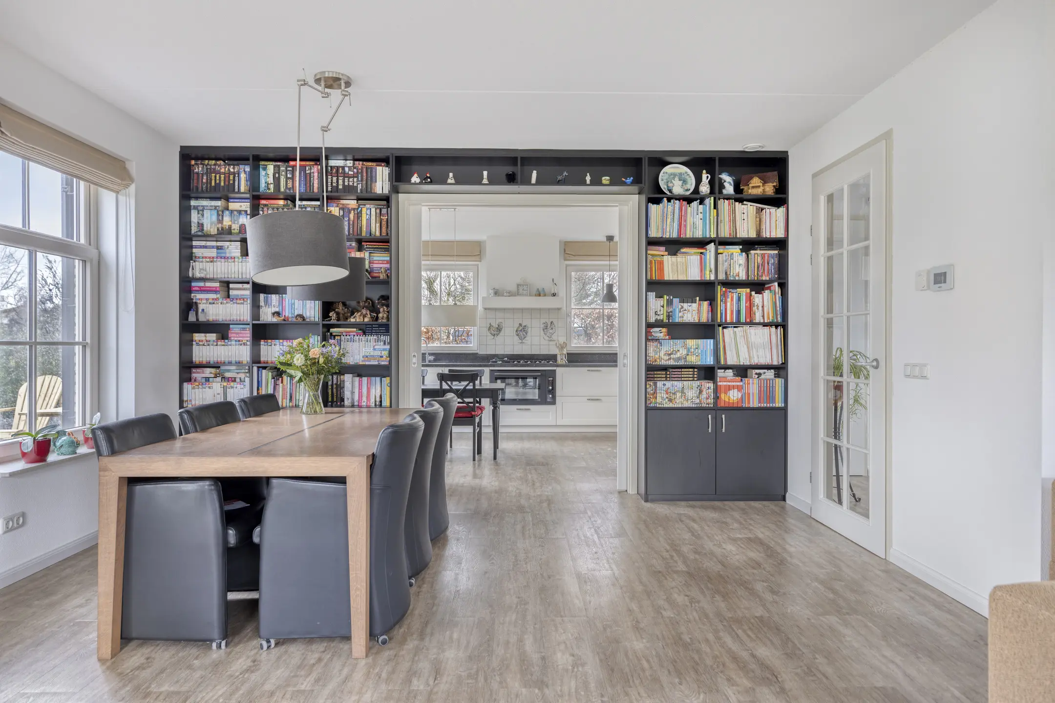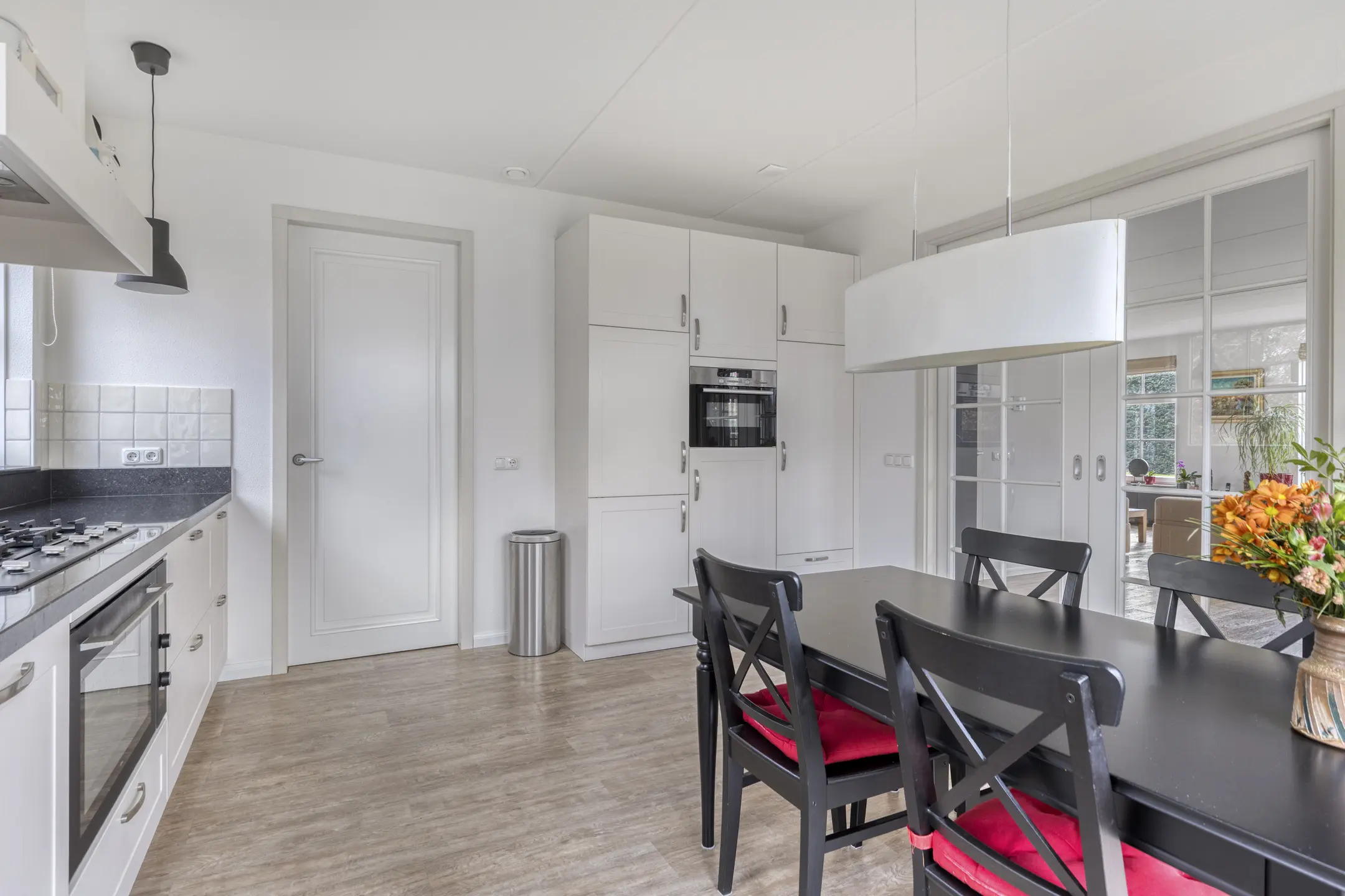 Via de keuken is de bijkeuken bereikbaar, een praktische ruimte voor extra opbergruimte, wasmachine-aansluiting of voorraadkasten. Door de logische indeling van de begane grond kunt u de ruimtes naar wens inrichten, bijvoorbeeld met een grotere eettafel voor gezinsmaaltijden of een speelhoek voor kinderen.