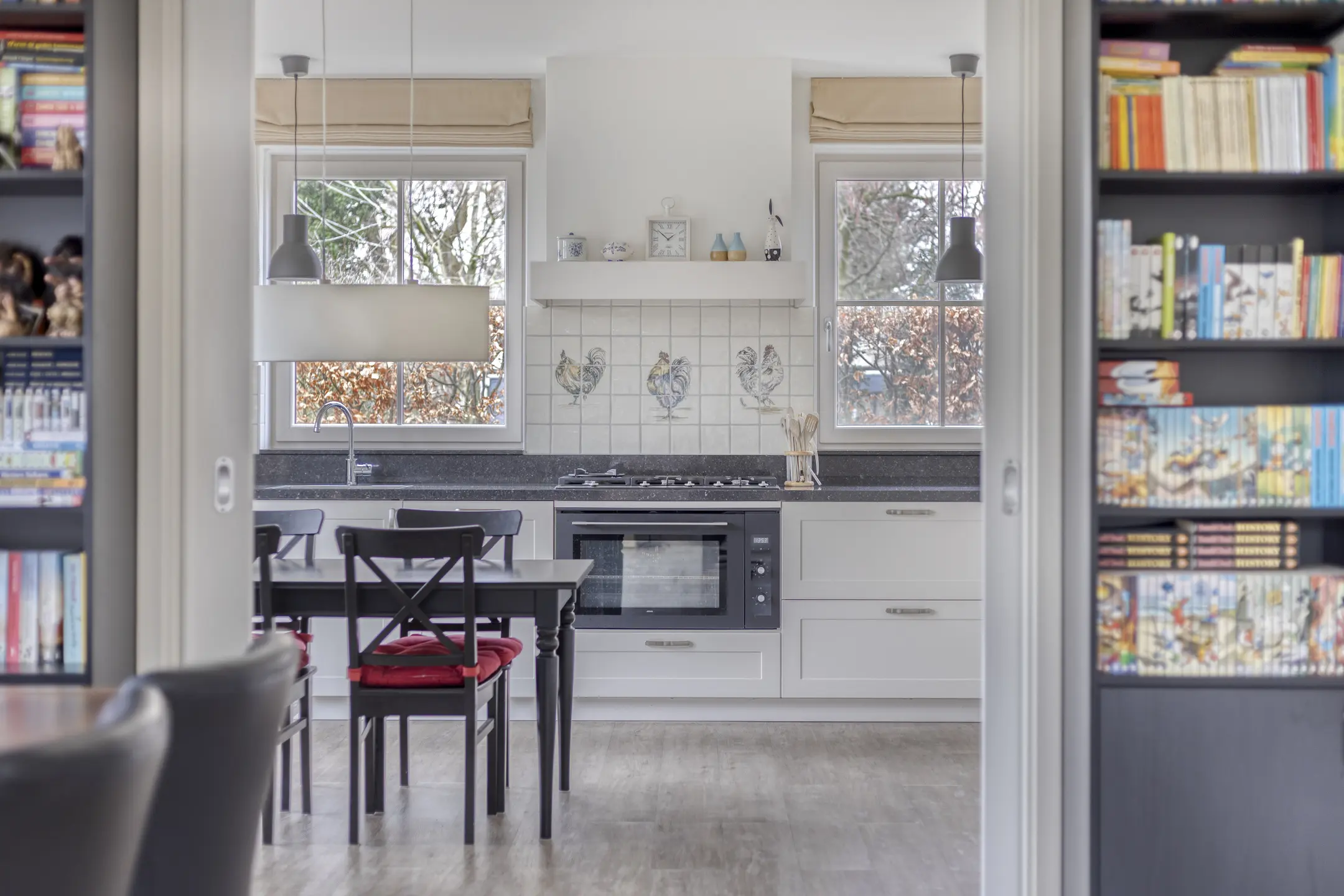 De begane grond biedt een royale en lichte woonomgeving met grote ramen aan zowel de voor- als achterzijde, waardoor er de hele dag door veel natuurlijk licht binnenvalt. De woonkamer is ruim van opzet en biedt verschillende mogelijkheden voor een comfortabele zithoek, een eethoek en eventueel een werk- of leeshoek. De open keuken grenst direct aan de woonkamer en is voorzien van moderne inbouwapparatuur, waaronder een fornuis, oven, afzuigkap, koelkast, vriezer en vaatwasser. De indeling maakt het eenvoudig om een sociale leefruimte te creëren waar koken, eten en ontspannen samenkomen.