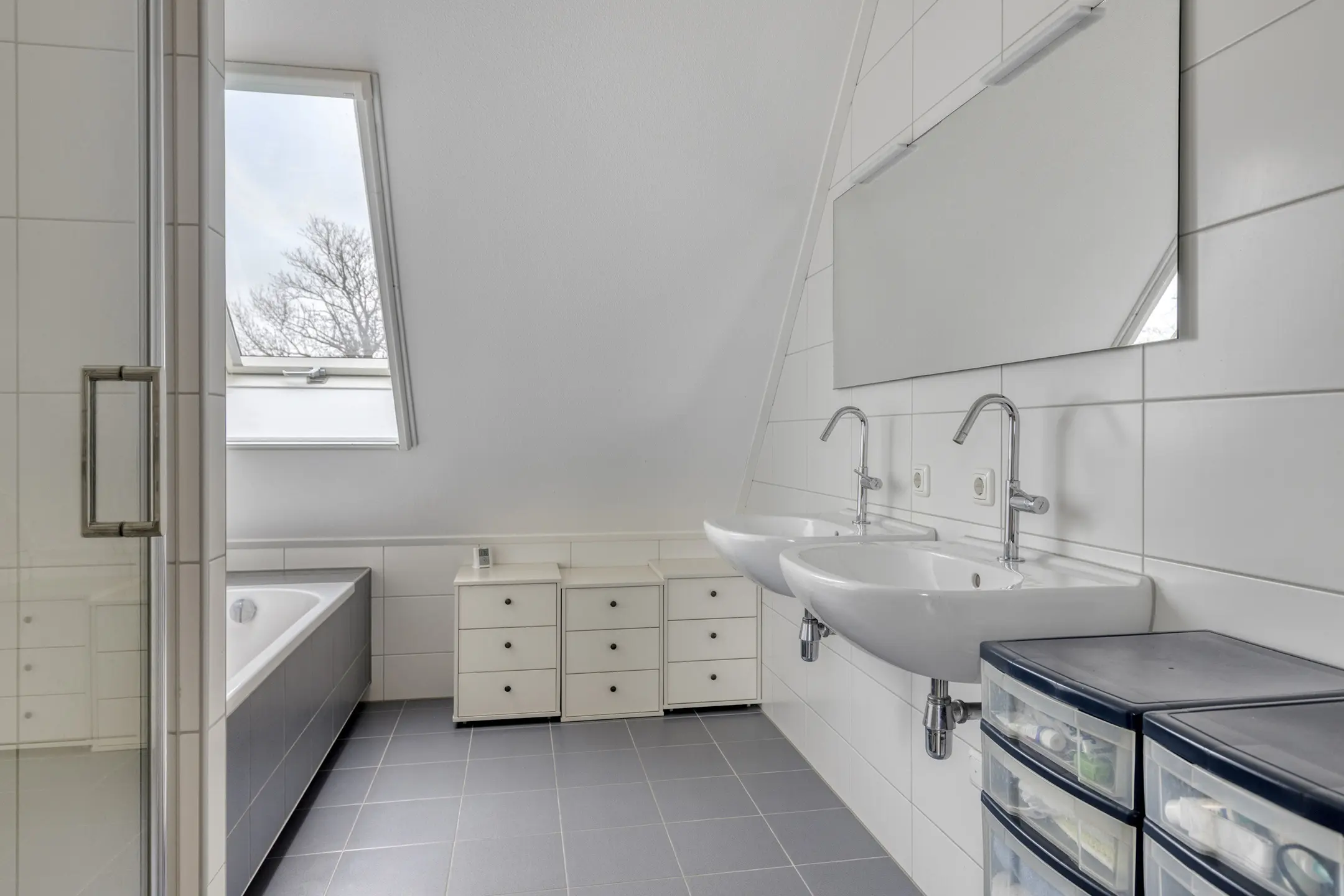 De badkamer is compleet ingericht met een ligbad, aparte douche en dubbele wastafel, en biedt genoeg ruimte voor een comfortabele indeling. Ook is er voldoende plek voor een kast of linnenopslag.