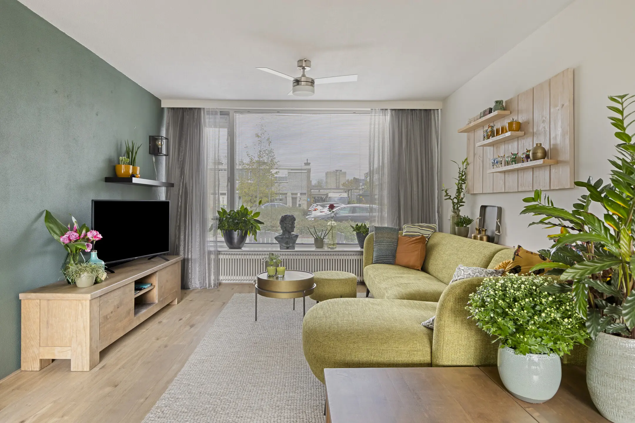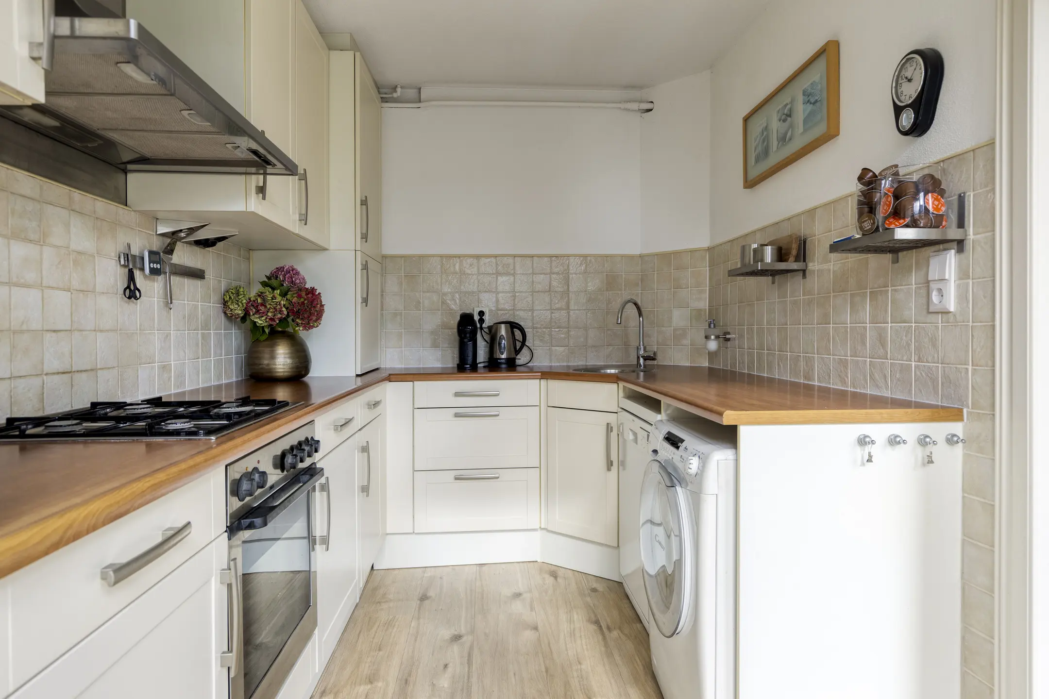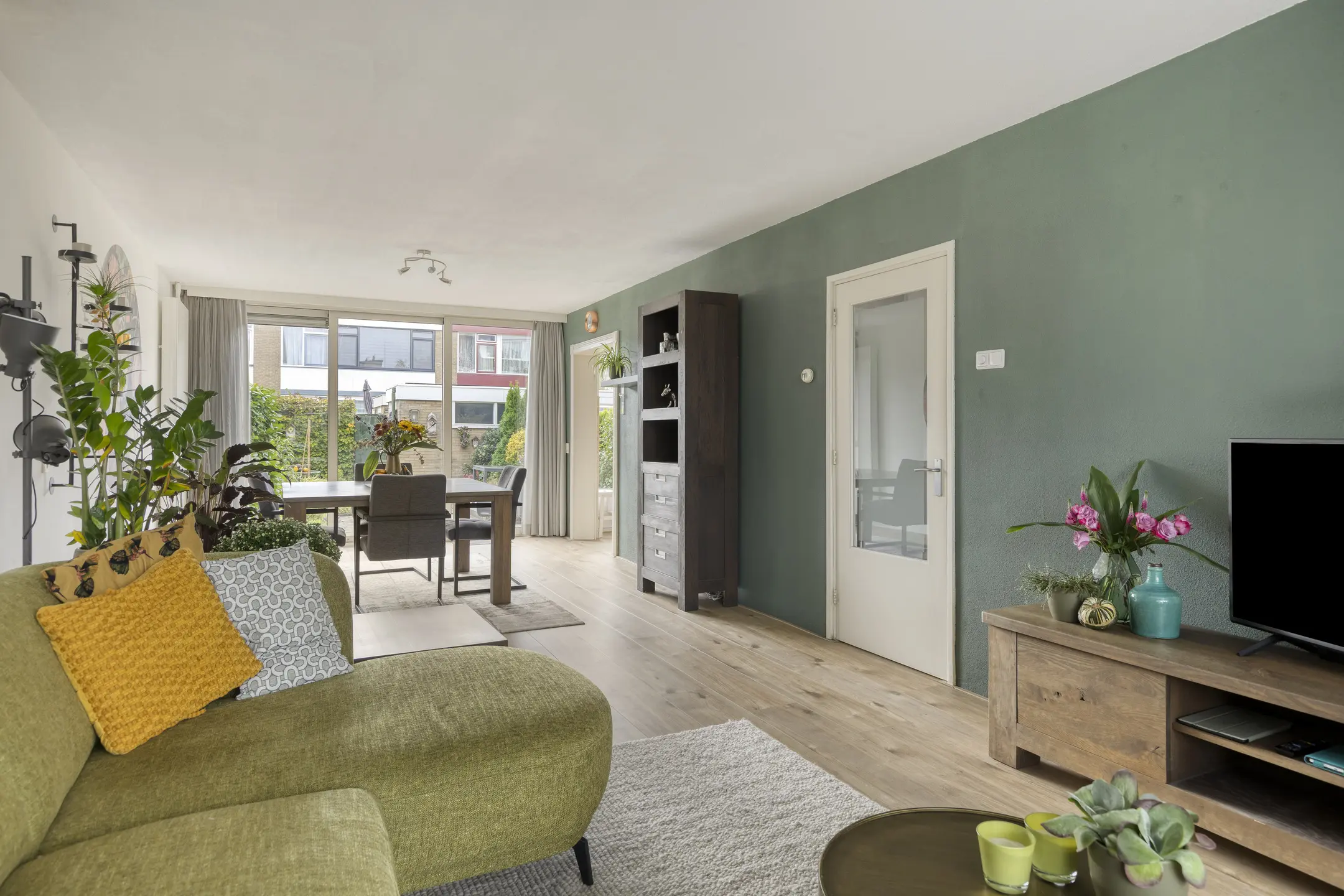 De toiletruimte is geheel betegeld en er is een fonteintje aanwezig. Vanuit de hal is er via een deur met glas toegang naar de ruime doorzon woonkamer. De woonkamer is riant van formaat en prettig licht door de grote schuifpui aan de achterzijde. Vanuit de woonkamer is er een doorgang naar de keuken, deze is geplaatst in U-opstelling en is uitgerust met een gasfornuis, afzuigkap, oven, koel-/vriescombinatie, apothekerskast en losse vaatwasmachine. Er is een kastje aanwezig met daarin de C.V.-combiketel en de aansluiting van de wasmachine is eveneens in de keuken. In de keuken is een deur naar de achtertuin. Op de begane grond ligt een mooie laminaatvloer met brede planken welke in 2022 is gelegd.