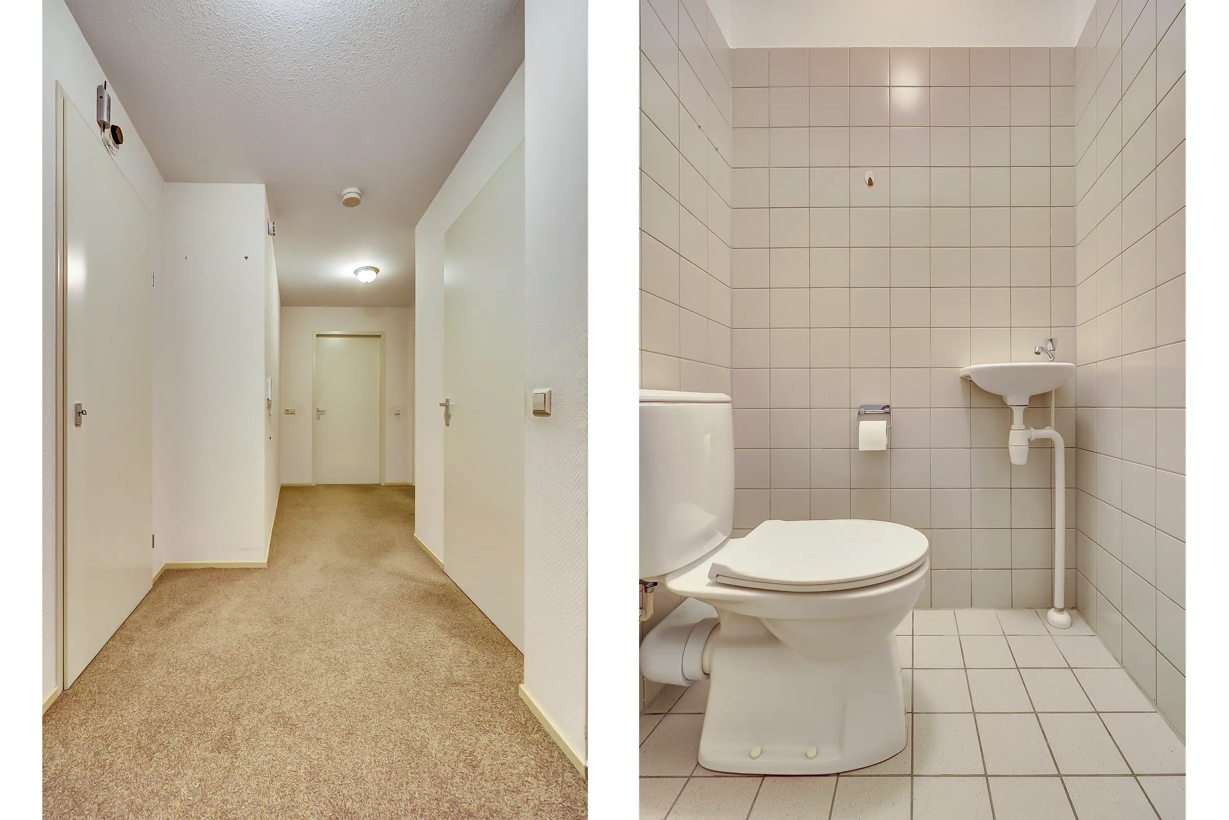Ruime entree/hal met meterkast, toiletruimte, videofoon en installatieruimte. In deze ruimte is de opstelling van de AWB combiketel (2021), mechanisch ventilatie systeem en de wasmachineaansluiting.